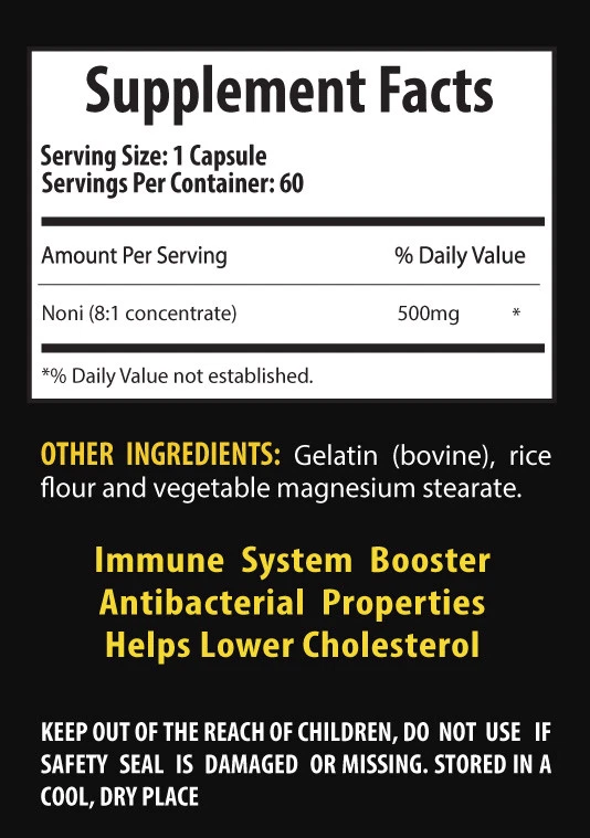 NONI & ACAI BERRY EXTRACT Enhance body functions and overall health Help with Weight loss, improve digestion Antioxidant properties Improve the Immune system Improve aging process Lower cholesterol levels in the blood Improving overall blood circulation Relaxing the blood vessels Maintaining our heart health Support of cardiovascular function Made In USA COMBO NONI – ACAI BERRY EXTRACT Noni Fruit colloquially known simply as Awl Tree, Brimstone Tree, Beach Mulberry, Canary Wood, East Indian Mulberry, Cheese Fruit, Grand Morinda, Forbidden Fruit and Hog Apple. The fruit is green when young that turns to yellowish green when ripened. Mostly it is used as a beverage that helps to enhance the body functions and overall health. Acai Berry belongs to the same group of other berries that has a more familiar name to us such as strawberry, blueberry, blackberry and grapes in Arececaeae family. Acai berry is known for its benefits such as help with Weight loss, improve digestion mostly due to its Antioxidant properties. Acts as an Antioxidant Without the presence of Antioxidant our body might be in a caution state of protection against environmental influences. Acai Berry can provide us enough amount of Antioxidant when consumed regularly. Rich quantity of Antioxidants inside this berry make it expert on dealing with circumstances that might occur to be the cause of premature aging. The content of vitamin C and Antioxidants found in the acai berry can also be used to improve the Immune system. History of noni fruit It is distributed from Asia, Pacific to Caribbean region. It is naturalized and cultivated in the tropical regions. The natural foods or components in noni fruit may be a beneficial nutritional supplement. Rich in Antioxidants and known for its purported herbal properties, the miraculous noni plant may stimulate the Immune system, and improve aging process, among other things. Noni extract may offer you relief and support. Heart Health Similar to red wine, research shows that acai berries are extremely high in anthocyanins, a form of plant Antioxidant associated with the ability to lower cholesterol levels in the blood stream. They are also rich in plant sterols that provide cardio-protective benefits to our cells. It does this by improving overall blood circulation, and relaxing the blood vessels. Acai Berry is immensely good at maintaining our heart health. It is important for improvement and support of cardiovascular function. Promotes Skin Health Acai berries may be beneficial for improving skin issues due to the high Antioxidant content. Taken internally, the berries can also give your skin a healthier glow. In fact, taking the acai berry supplementation may improve numerous skin conditions. It had been proved that Acai Berry has a plentiful amount of Vitamin E which is extremely good for our skins, and apparently for our hair health too. For those who have acne that is very disturbing, do not worry, because the content of various kinds of vitamins that exist in the acai berry is able to reduce and eliminate acne, especially as vitamin E and vitamin C it. Health Benefits of Noni fruit Noni fruit is able to improve various health conditions. It helps to support the heart function, deal with liver problems, relax muscles and also provide relief from gout. It helps to maintain the skin health, promote the level of energy, and enhance the immunity power. It possesses impressive amounts of minerals, vitamins and phytonutrients. It has Antioxidants such as quercetin, pinoresinol, vanillin, kaempferol, proxeronine, isoscopoletin, scopoletin and bisdemethylpinoresinol. Aids in Weight Loss Known by nutritionists as a super-food, acai may help us not only lose Weight, but maintain a healthy Weight. Pulp from the acai berry had the ability to reduce the effects of a high-fat diet. For any of you who would like to try new source of natural helper on losing some Weight, you definitely can try this Acai Berry extract. With regular usage, this berries could help you reach your ideal body Weight. Assisted by daily regular exercise, it surely will form a better result. Anti-Aging Effects Extremely high in many forms of plant Antioxidants, acai berries may contribute to an ability to slow or reverse typical processes of aging related to influences on our skin. In fact, the berries are one of the planets highest sources of Antioxidants, with one berry holding ten times the amount of Antioxidants as grapes, and two times the amount of blueberries. Acai berries contain vitamin C which is good for health. Vitamin C is in addition to keep the Immune system, can also prevent signs of aging in the body. Rich quantity of Antioxidants inside this berry make it expert on dealing with of premature aging. Supplement Facts Serving Size: 1 Capsule Servings Per Container: 60 Noni (8:1 concentrate) 500mg * OTHER INGREDIENTS: Gelatin (bovine),rice flour and vegetable magnesium stearate. This product is manufactured and packaged in a facility which may also process milk, soy, wheat,egg, peanuts,tree nuts,fish and crustacean shellfish. Supplement Facts Serving Size: 2 Capsules Servings Per Container: 30 Acai Fruit (4:1 concentrate) 1200mg * Other Ingredients: Gelatin, Magnesium Stearate and Silicon Dioxide. SUGGESTED USE: As a dietary supplement, take one (1) to two (2) capsules daily. CAUTION: Do not exceed recommended dose. Pregnant or nursing mothers, children under the age of 18, and individuals with a known medical condition should consult a physician before using this or any dietary supplement. This product is manufactured and packaged in a facility which may also process milk, soy, wheat, egg, peanuts, tree nuts, sh, and crustacean shell sh. KEEP OUT OF THE REACH OF CHILDREN. DO NOT USE IF SAFETY SEAL IS DAMAGED OR MISSING. STORE IN A COOL, DRY PLACE. *These statements have not been evaluated by the Food and Drug Administration. This product is not intended to diagnose, treat, cure, or prevent any disease. PR