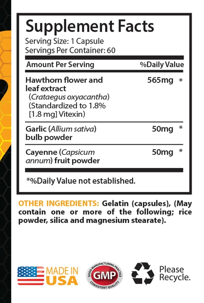 665mg HAWTHORN LEAF EXTRACT Cardiovascular system improvement Heart support Improve heart function Improve the ability to exercise Help in Weight loss Herb's Antioxidant activity Improve your blood circulation Cleanse your system 2 BOTTLES WITH 120 CAPSULES Hawthorn Berry Benefits Hawthorn is widely regarded in Europe as an effective supplement to improve heart health and function. It is used to promote the health of the circulatory system and has been found useful in improving high blood pressure, congestive heart health and blood circulation. It has been found to strengthen the heart and stabilize it. It may also be beneficial for cardiovascular system improvement, heart support and other health conditions. This may be due to the herb's Antioxidant activity. Antioxidant properties Hawthorn contains active compounds with Antioxidant properties. Antioxidants are substances that scavenge compounds in the body that alter cell membranes. It may help to cope with elements that may contribute to the ageing process as well as the development of a number of health problems. Antioxidants found in hawthorn can help to improve your blood circulation, cleanse your system and flush out all the unnecessary elements. Congestive heart health Hawthorn may be useful for people with a health condition in which the heart is unable to pump adequate amounts of blood to other organs in the body. Hawthorn may significantly improve heart function and improve the ability to exercise. Hawthorn may be helpful in dealing with shortness of breath and fatigue. Taking this herbal supplement daily may show the improvements in congestive heart health. Help In Weight Loss: Weight loss has been everyone’s obsession these days. Eating right and looking good is so important. And while trying to do so, one should only stick to foods that are low in calories or are organic in nature. A healthy option in such cases would be hawthorn berries. They boost Weight loss and help you lose those unwanted pounds within a short period of time. High cholesterol Hawthorn tincture made from the berries may be a powerful agent for the improvement of cholesterol levels and promotion of bloodstream. The tincture of hawthorn berries also reduced the production of cholesterol in the liver. Hawthorn berries have Antioxidants that strengthen the walls of your blood vessels. The leaves and blossoms contain certain kinds of compounds that control improve your heart health and cardiovascular system. High blood pressure Hawthorn berries also control high blood pressure. There are several cardiovascular benefits this fruit can provide you with. Hawthorn may also be of benefit for nervous system, and high blood pressure. Hawthorn may be beneficial in coping with high blood pressure, this may be due to the supporting cardiovascular benefits of this herb. Hawthorn can be taken by people with blood pressure problems. Howthorn Improves Blood Circulation Hawthorn dilates the blood vessels and helps to improve blood transport to all parts of the body. It might be useful for people who want to memory and provide a better blood supply to the brain. To improve memory hawthorn can be combined with ginkgo (Ginkgo biloba) that also improves blood circulation so more oxygen is transported to the brain. Since hawthorn is believed to have a good effect on the capillaries in the body, it may be useful for those who need to improve the circulation around the body Hawthorn for Better Digestion Hawthorn berries are excellent for your digestive system too. They control constipation, bloating, flatulence and ensure timely bowel movement. The leaves, flowers and berries of hawthorn are though to have a relaxing effect on the digestive system. The herb is believed to stimulate appetite, improve digestion. Hawthorn berries also help in burning body fat. They boost metabolism. They also allow your body to burn more calories while working out. Supplements Facts: Serving Size: 1 Capsule, Servings per container: 60 Hawthorn Flower and Leaf extract - 565mg (Crataegus oxyacantha) (Standardized to 1.8% [1.8mg] Vitexin) Garlic (Allium sativa) - 50mg Cayenne (capsicum annuum) fruit powder - 50mg Other Ingredients: Gelatin (capsules), (May contain one or more of the following; rice powder, silica and magnesium stearate). SUGGESTED USE: As a dietary supplement, adults take one (1) capsule, three (3) times daily with meals, or as directed by a health care professional. CAUTION: Do not exceed recommended dose. Pregnant or nursing mothers, children under the age of 18, and individuals with a known medical condition should consult a physician before using this or any dietary supplement. * PREMIUM QUALITY PRODUCT PREMIUM QUALITY PRODUCT PREMIUM QUALITY PRODUCT