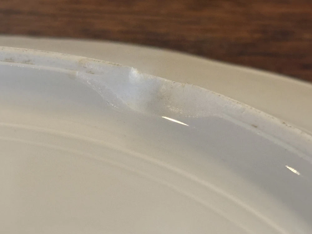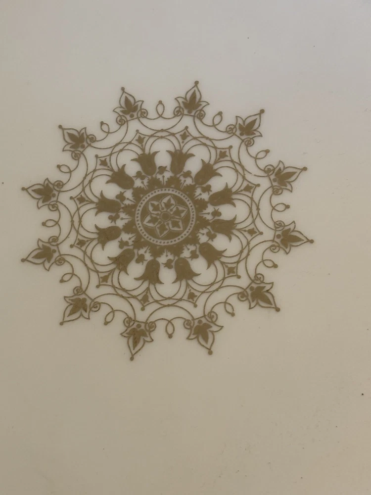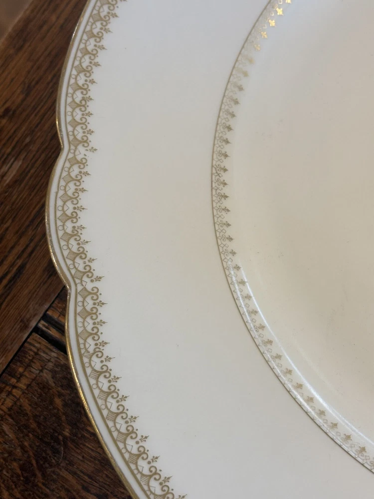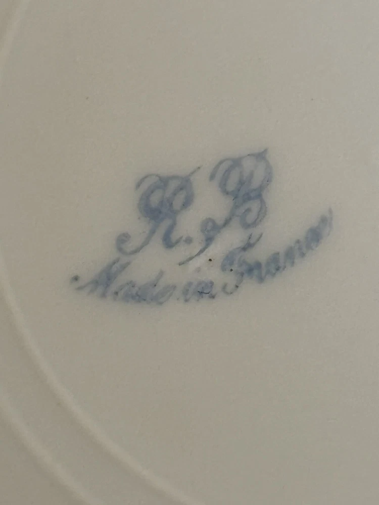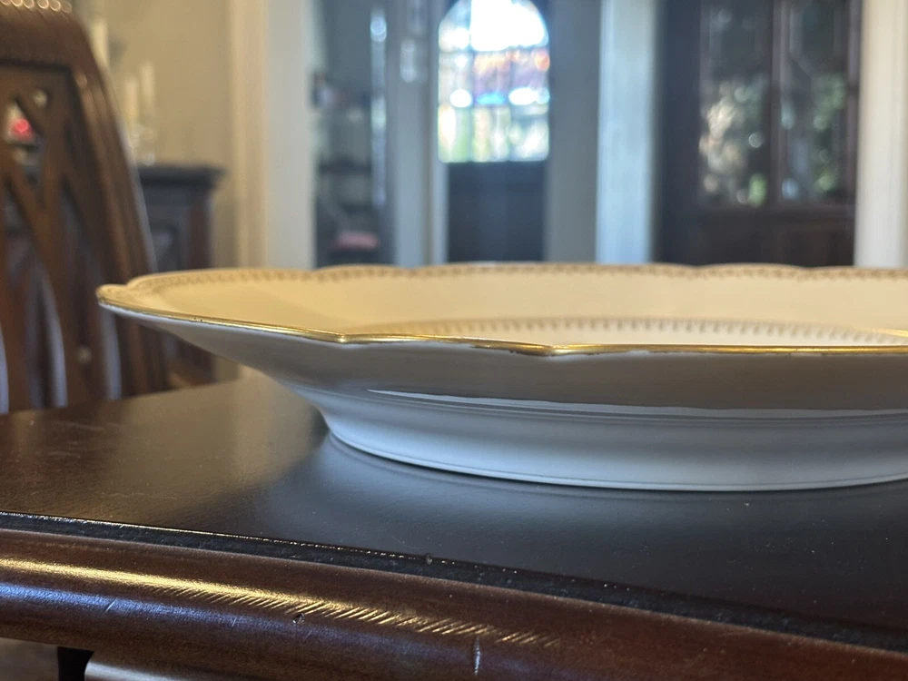 This antique 13” round platter is a beautiful piece of Limoges (maybe?) porcelain made in France. The cream color china with gold accents is stunning. The platter is marked with the initials "R S" and "Made In France", indicating its authenticity. The rim sits an inch and a half off the table for easy handling. There is a chip on the bottom, which is not noticeable.