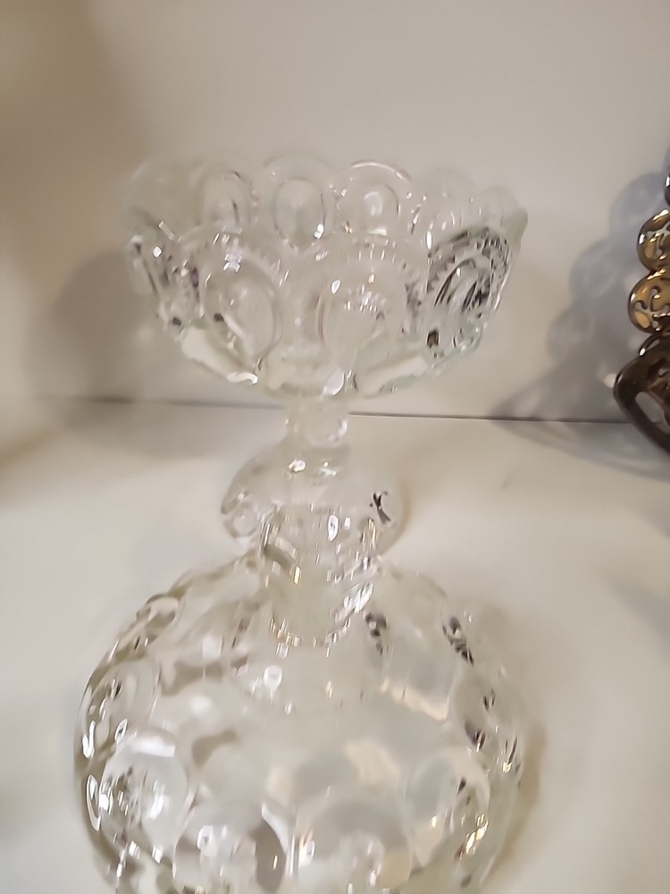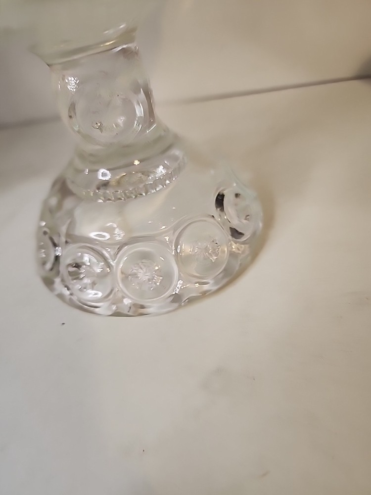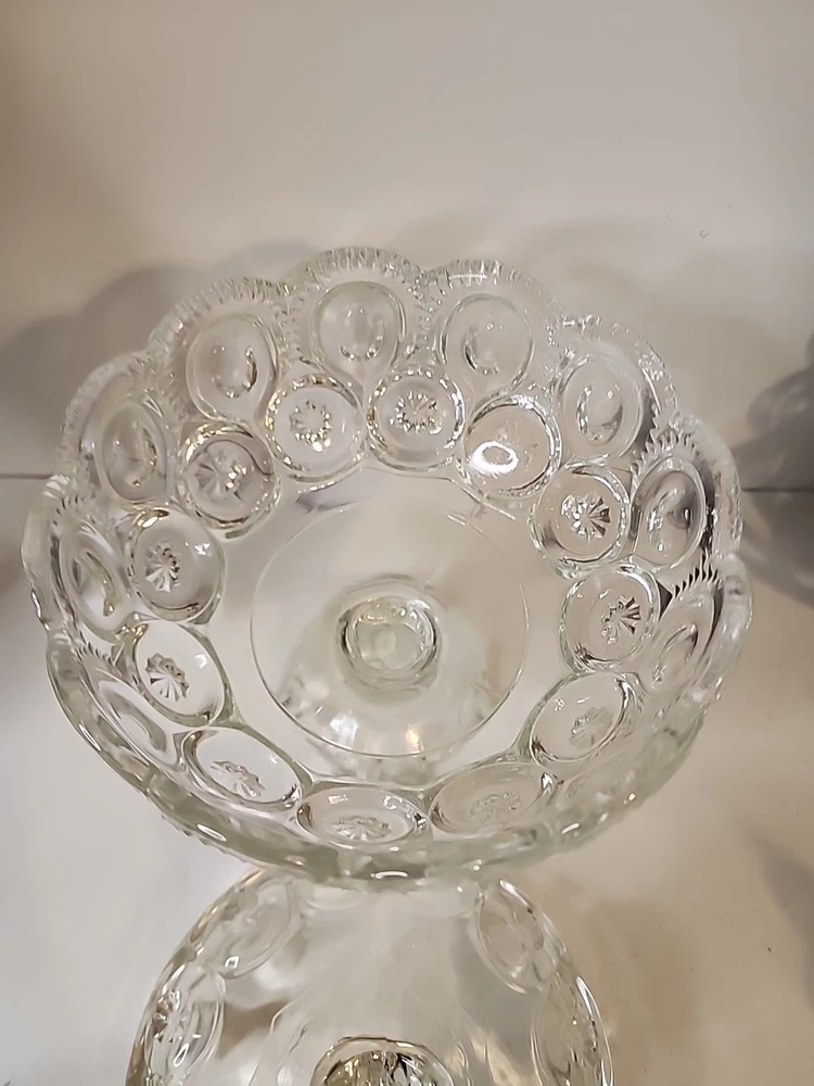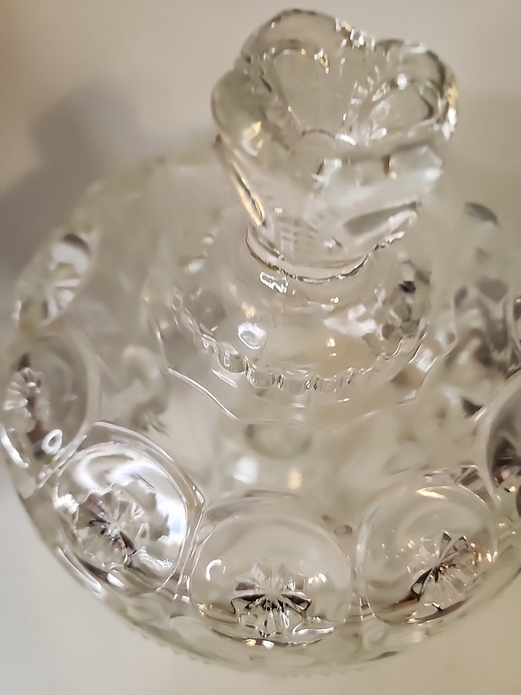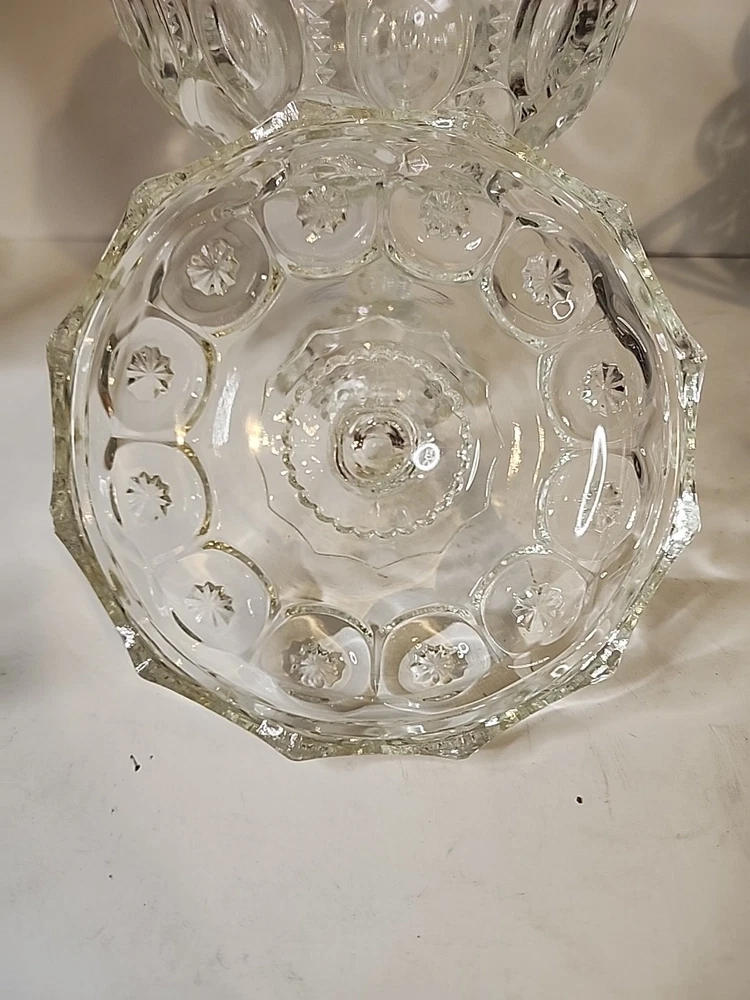 This antique covered compote bowl is a stunning piece of glassware from the late 19th century. With its intricate Adams style design and clear glass material, it is sure to catch the eye of any collector. The bowl measures 9.5 inches in diameter and features a unique moon and stars pattern, making it a one-of-a-kind item for any home or collection. Made by Adams & Company in the United States, this original piece dates back to 1850-1899 and is in excellent condition. Its age and rarity make it a valuable addition to any antique collection. Don't miss out on the opportunity to own this beautiful EAPG glassware piece.