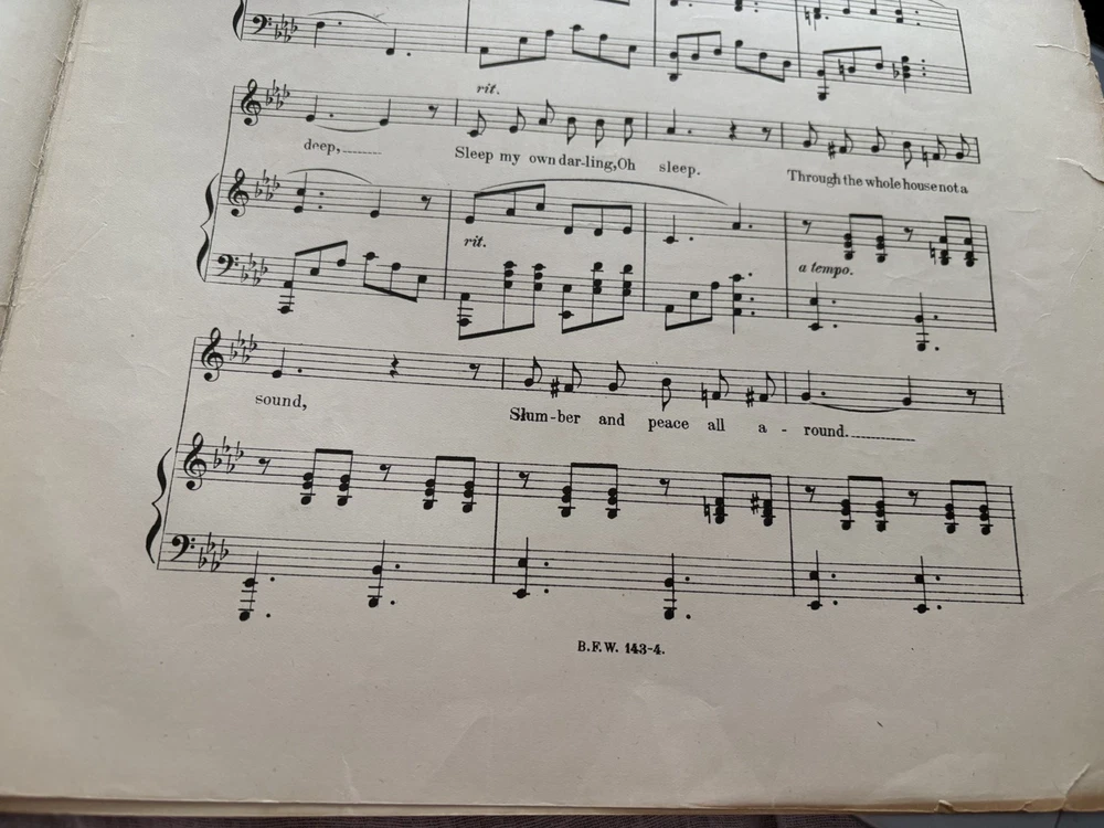 Includes: New Songs Worth Singing This product is an antique sheet music from 1895 featuring the songs "Sleep in My Darling" and "Rest" by Gertrude Clark. The sheet music is for piano and is published by B. F. Wood Music in Boston, United States. The materials for this product were sourced from Monaco, blending a touch of international flair into its American roots. Perfect for collectors or enthusiasts of vintage and antique sheet music, this item offers a glimpse into the musical landscape of the late 19th century. The "spine" area is taped. I don't know if that is part of the original distribution or if it was added later