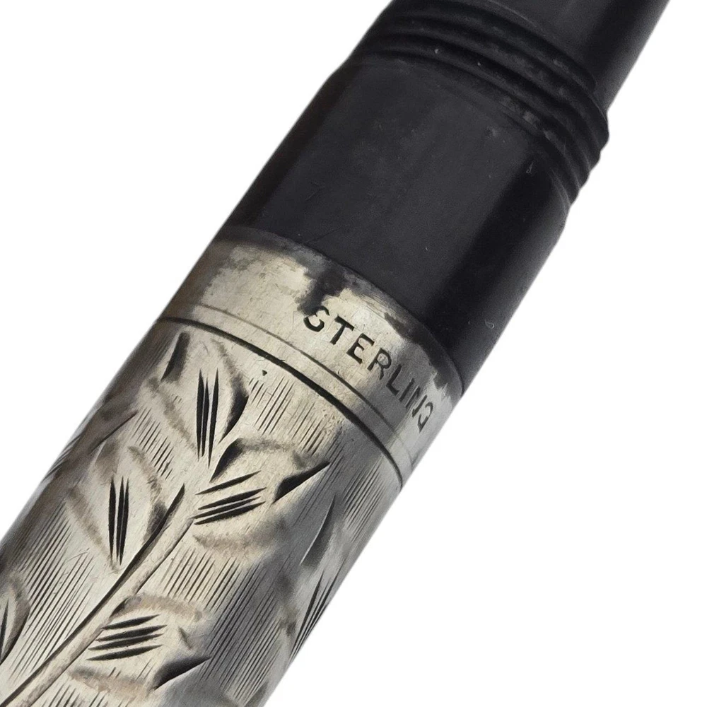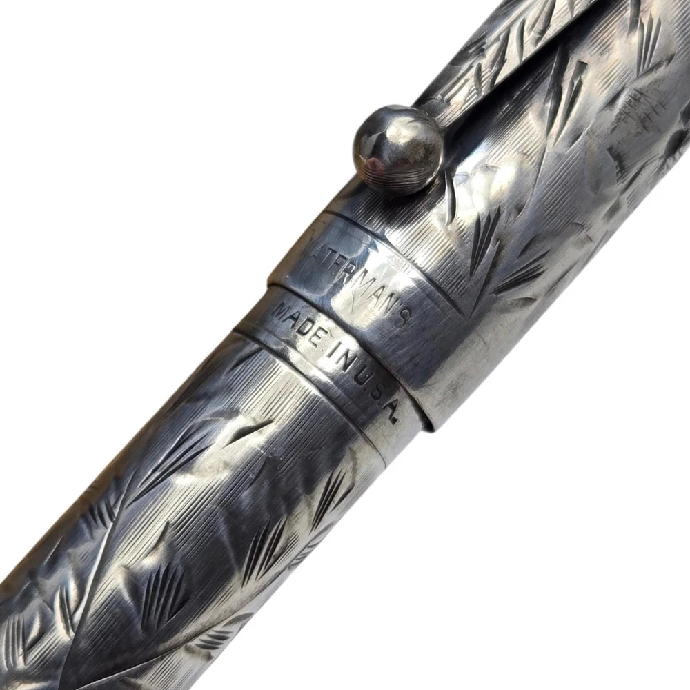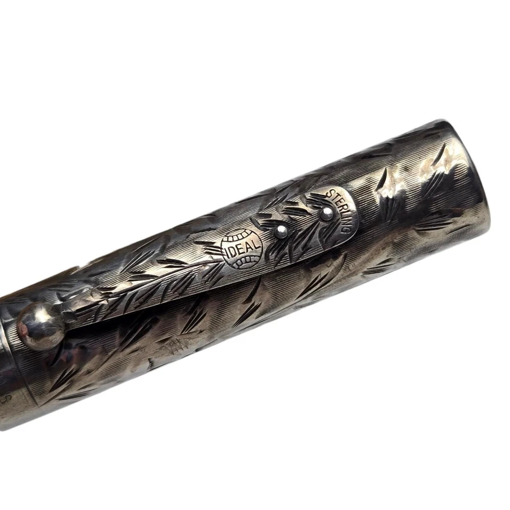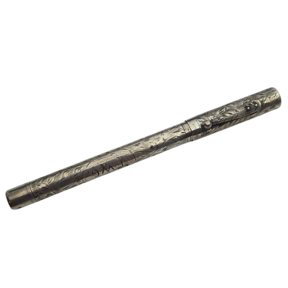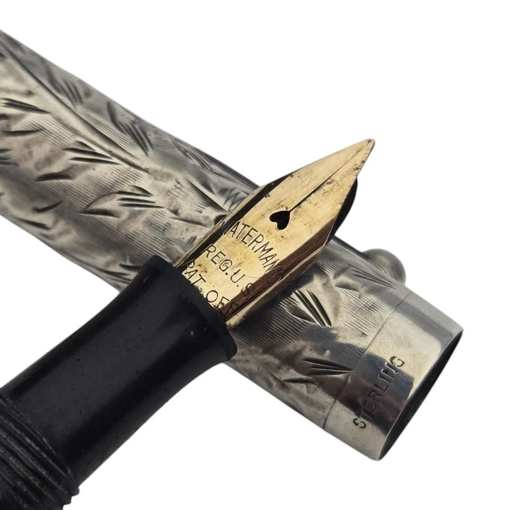 Please see full description for all details. Antique 1920's Waterman Ideal 452 1/2 Sterling Silver Fountain Pen w/ Box Estate fresh antique Waterman Ideal No. 452 1/2 L.E.C. sterling silver fountain pen with original box in nice as-found condition. Solid 14K gold fine to medium semi-flex nib. Marked "STERLING" on cap, barrel, and clip. Capped length: 5.11", barrel diameter: 0.37" Barrel engraved with the initials "E.W.G" Includes original waterman clam-shell box. Box lid embossed "The Treasure Chest of To-day" Fresh out of a local estate. Nice as-found antique condition with light evidence of age and use. Barrel engraved with the initials "E.W.G". Some small dings around the bottom of the barrel. Nip appears to be slightly out of alignment. Pen is untested and will most likely require service prior to use. Box shows minor internal storage wear with broken Waterman's ribbon. Sold as-is / as-found. Images sell! Get Supersized Images & Free Image Hosting Attention Sellers - Get Templates Image Hosting, Scheduling at Auctiva.com.