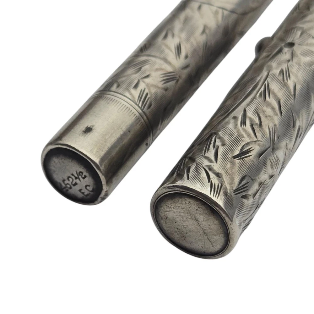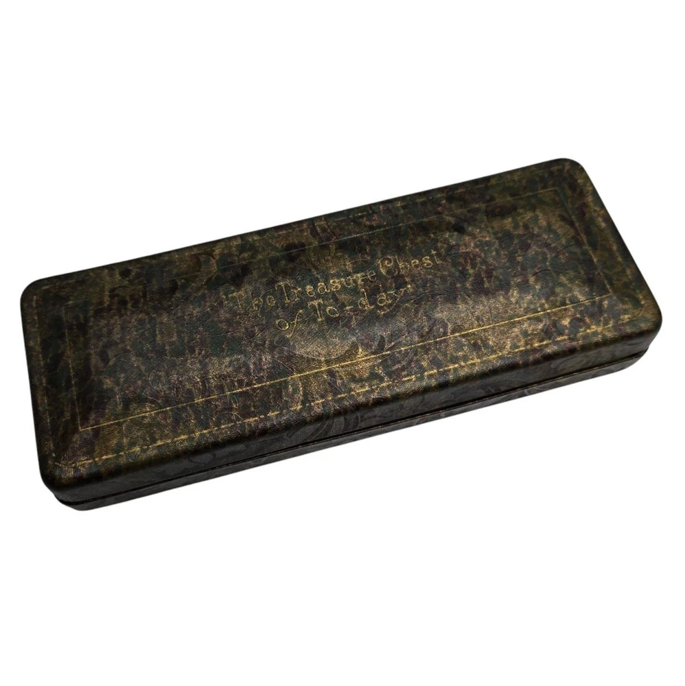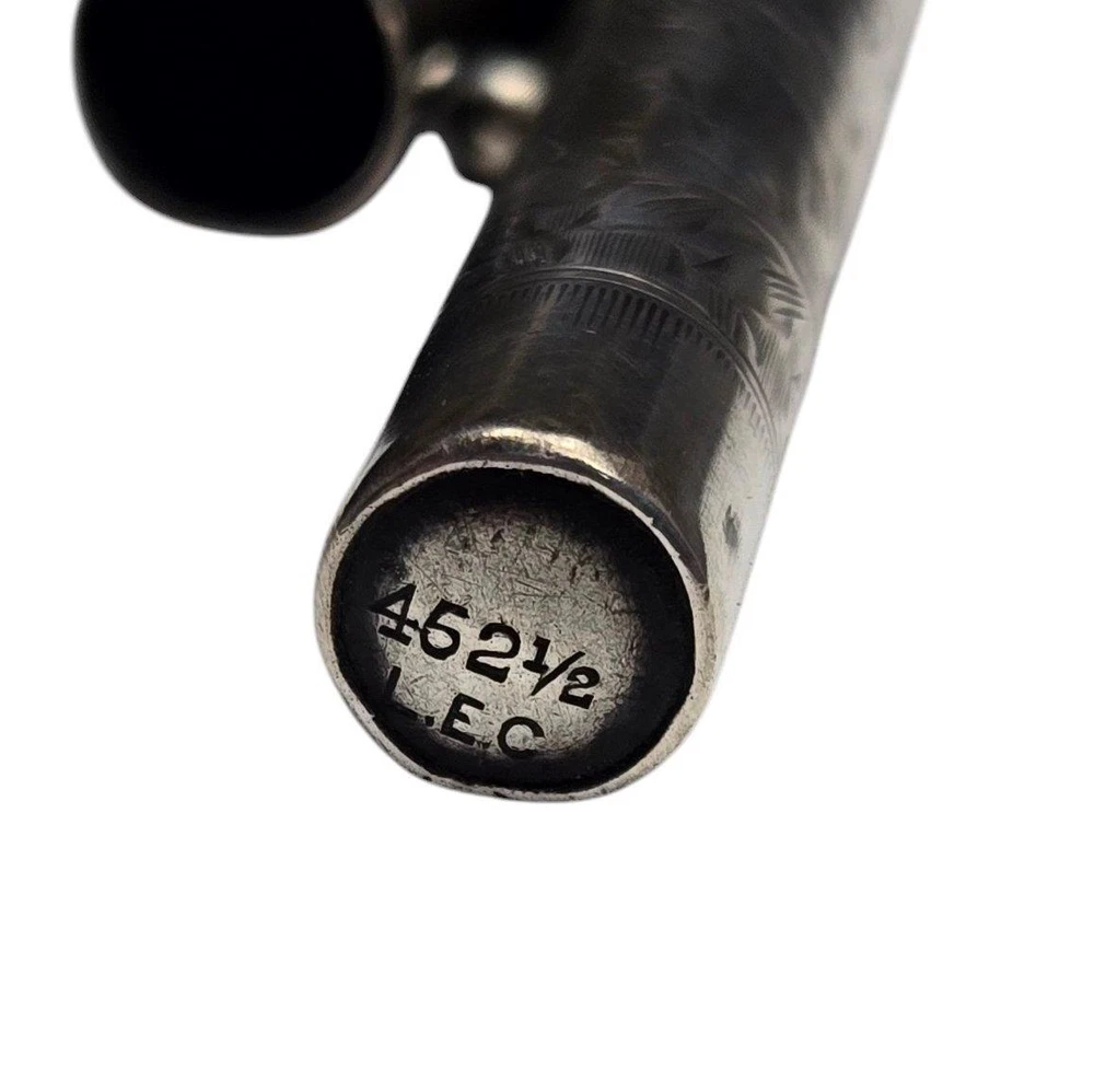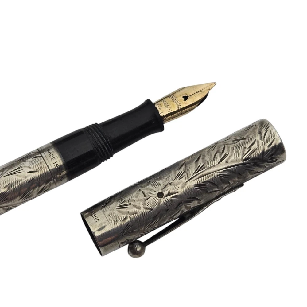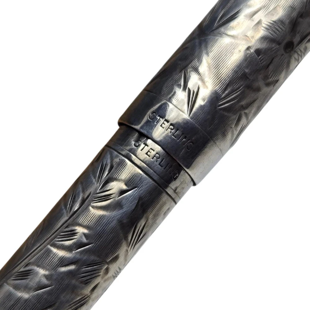 Please see full description for all details. Antique 1920's Waterman Ideal 452 1/2 Sterling Silver Fountain Pen w/ Box Estate fresh antique Waterman Ideal No. 452 1/2 L.E.C. sterling silver fountain pen with original box in nice as-found condition. Solid 14K gold fine to medium semi-flex nib. Marked "STERLING" on cap, barrel, and clip. Capped length: 5.11", barrel diameter: 0.37" Barrel engraved with the initials "E.W.G" Includes original waterman clam-shell box. Box lid embossed "The Treasure Chest of To-day" Fresh out of a local estate. Nice as-found antique condition with light evidence of age and use. Barrel engraved with the initials "E.W.G". Some small dings around the bottom of the barrel. Nip appears to be slightly out of alignment. Pen is untested and will most likely require service prior to use. Box shows minor internal storage wear with broken Waterman's ribbon. Sold as-is / as-found. Images sell! Get Supersized Images & Free Image Hosting Attention Sellers - Get Templates Image Hosting, Scheduling at Auctiva.com.