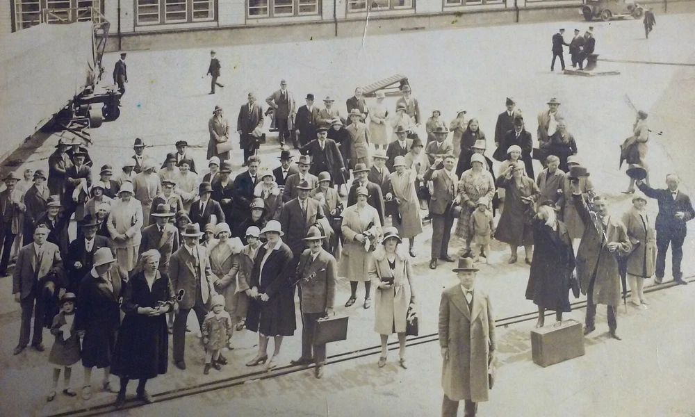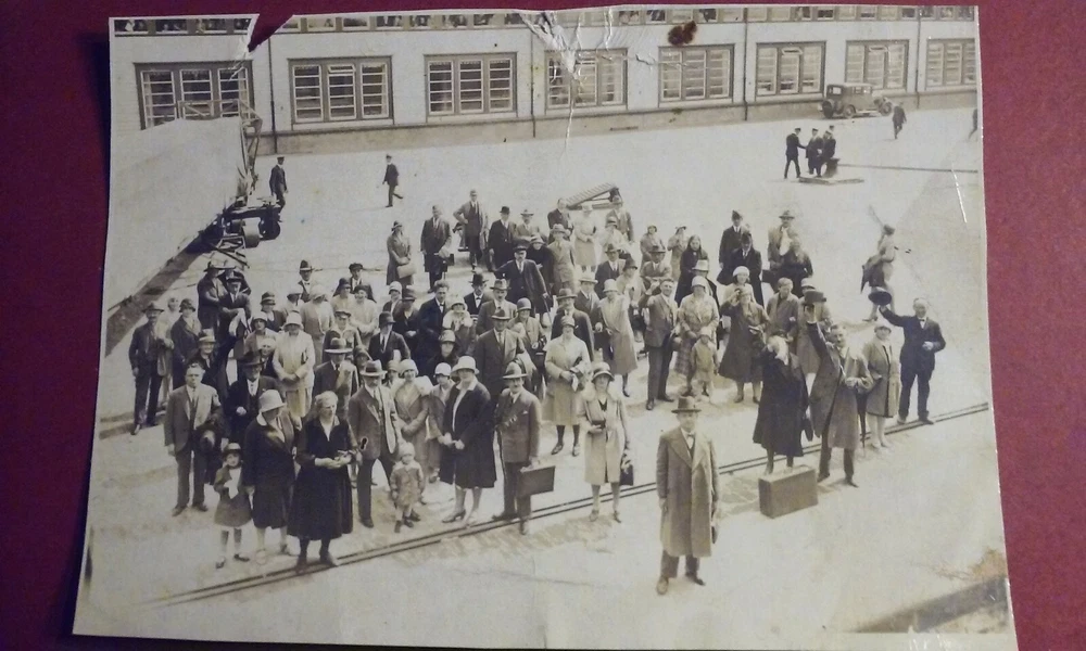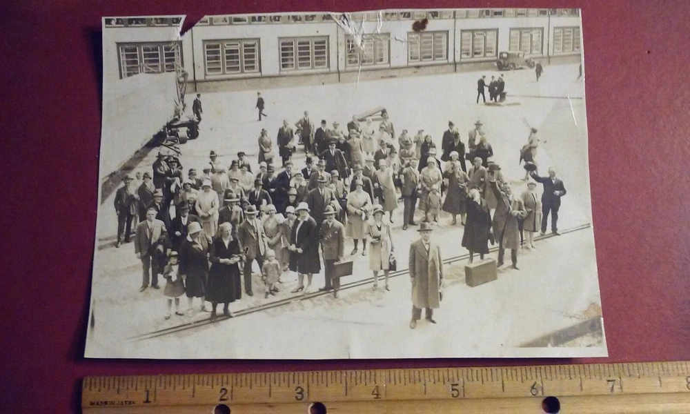 Antique 1920's-30's Original Real Photo Travelers Waiting at The AIRPORT w/ Bags