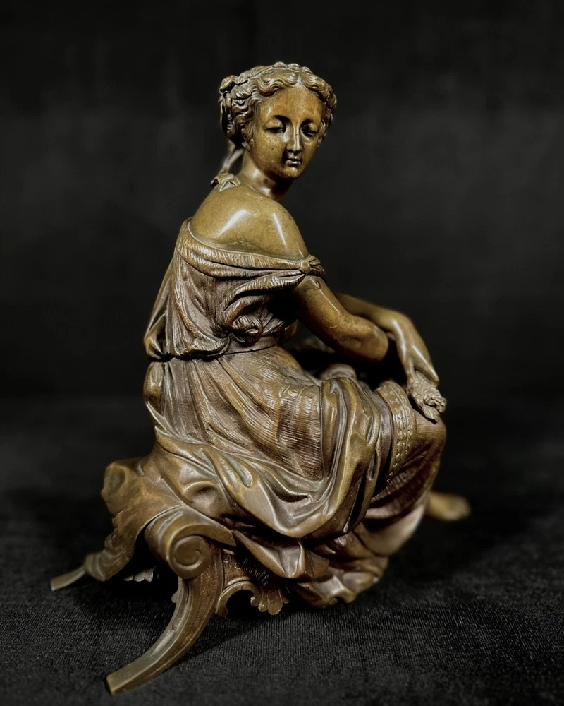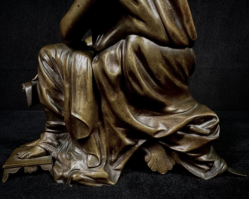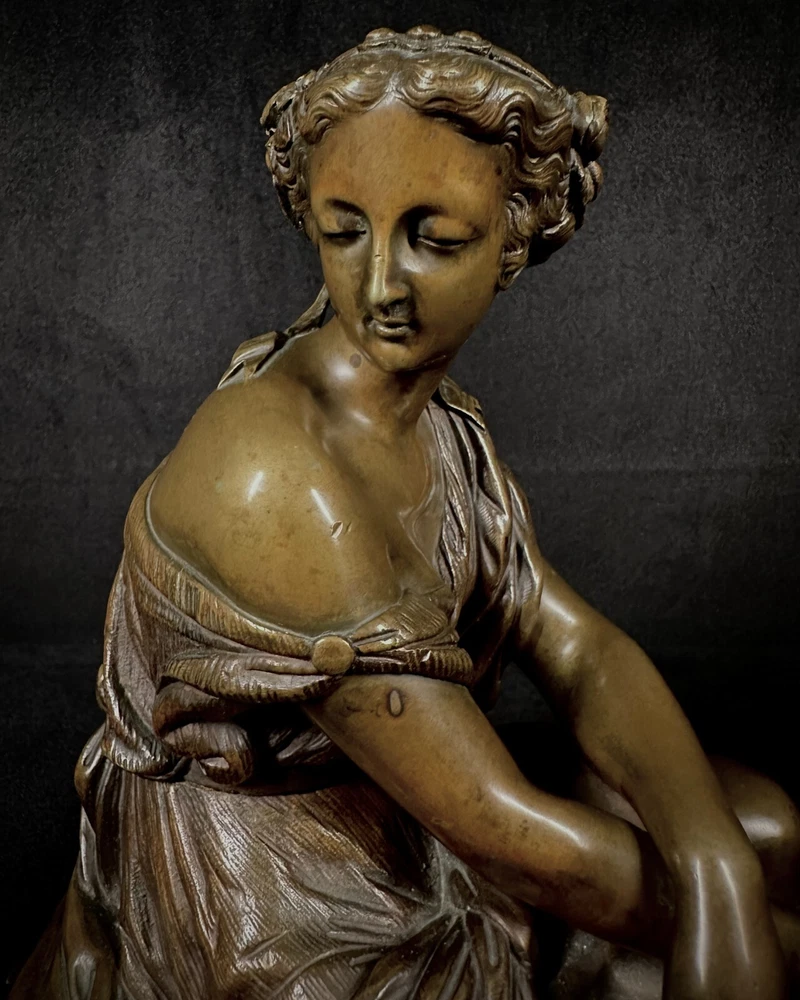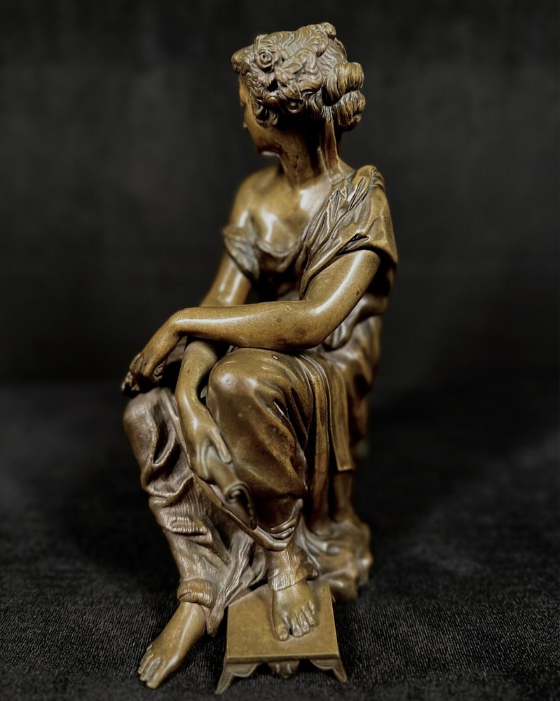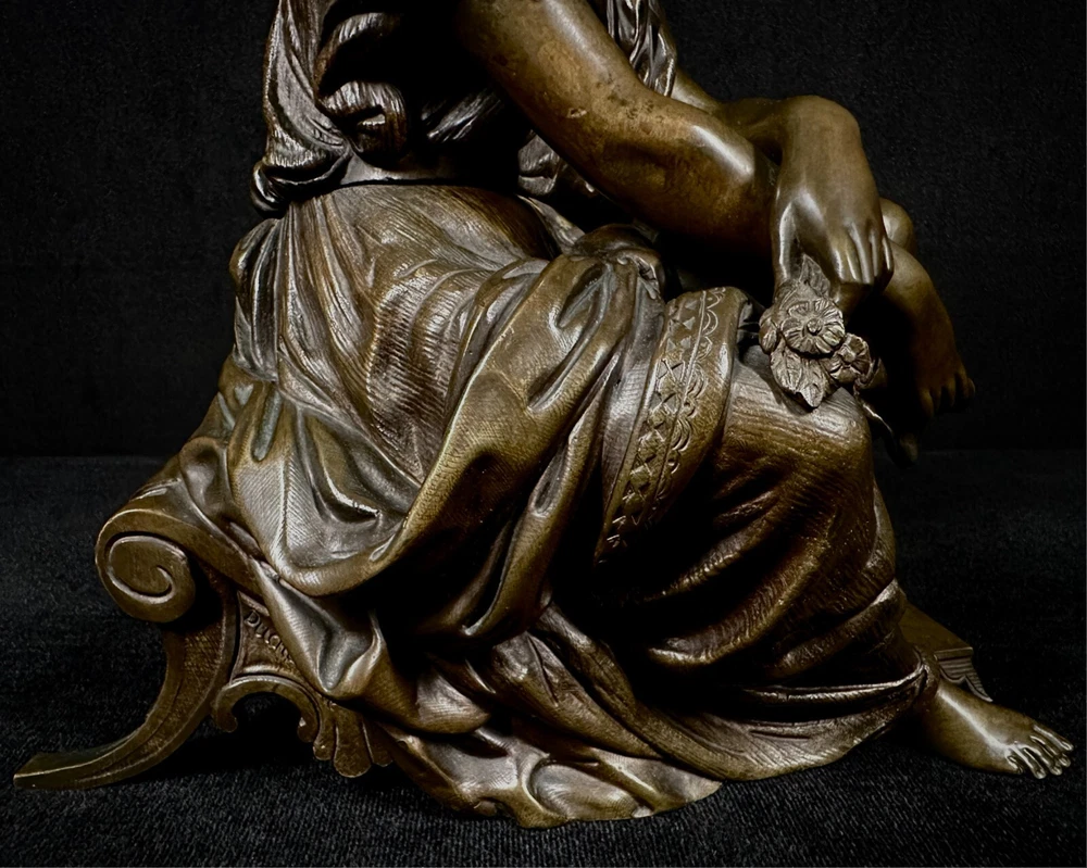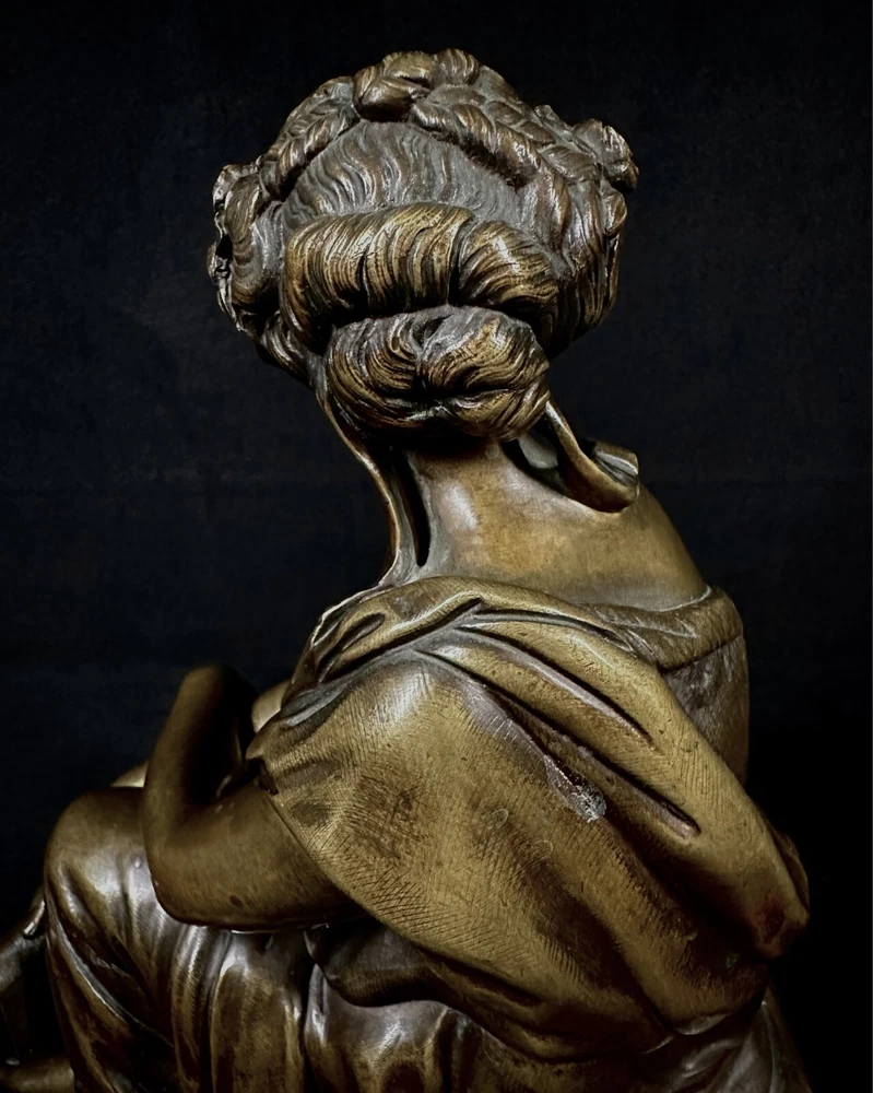 The Antique Late 19th Century ( Circa.1870s ) French Painted Bronze Figure "Femme à l'antique" By Artist Duchoiselle ( French, 19th C. ), Signature in the Left Lower Front Side. This Beautiful Painted Cast Bronze Figure Represents An Ancient Elegant Woman Wearing A Floral Headdress and A Classical Long Dress Sitting Gracefully, Holding A Flower in One Hand and A Scroll in the Other, Look Peacefully at the Side with A Thoughtful Expression. The Proportions of the Figure are Precise, the Figure's Expressions are Vivid and Lifelike, and the Hair, Clothing Folds and Other Details are Delicate and Exquisite. Some Wear on it Consistent with Age, In Good Condition. Title: "Femme à l'antique" Artist: Duchoiselle ( French, 19th C. ) Time Period: 1870s Medium: Bronze Condition: Good Condition Size: 9-1/2" H, 9" L, 5" W Weight: 7lbs. 15oz Available For Domestic Shipping and International Shipping. Thanks!