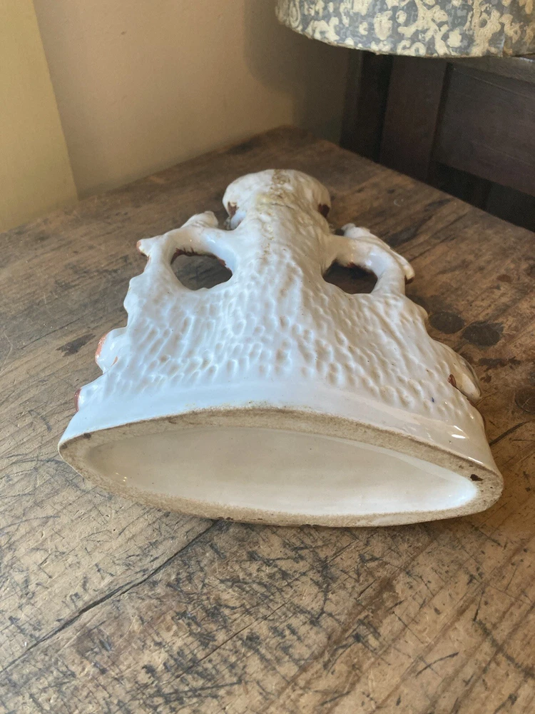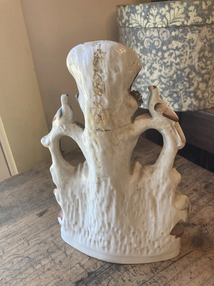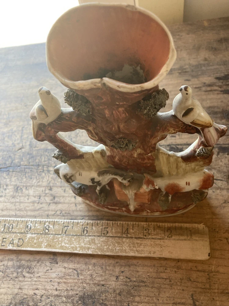 For sale is a nice Antique 19th century victorian era porcelain/ceramic/Staffordshire spill vase used to hold kindling wood shavings. It features a tree with a spring bubbling from beneath and animals around. A nice example of early ceramic work. Each figurine measures 10” tall, 7” wide. It is in restored antique condition on the neck. Not too obvious. See picture. appropriate surface wears and manufacturer imperfections are to be expected. Please check photos from all angles for details. Overall, it is a nice piece of early Victorian era ceramic artwork that would fit well in any antique collectors home. Ship with careful packaging and full insurance. Feel free to check out my other antique and collectible listings. I gladly combine shipping whenever practical.