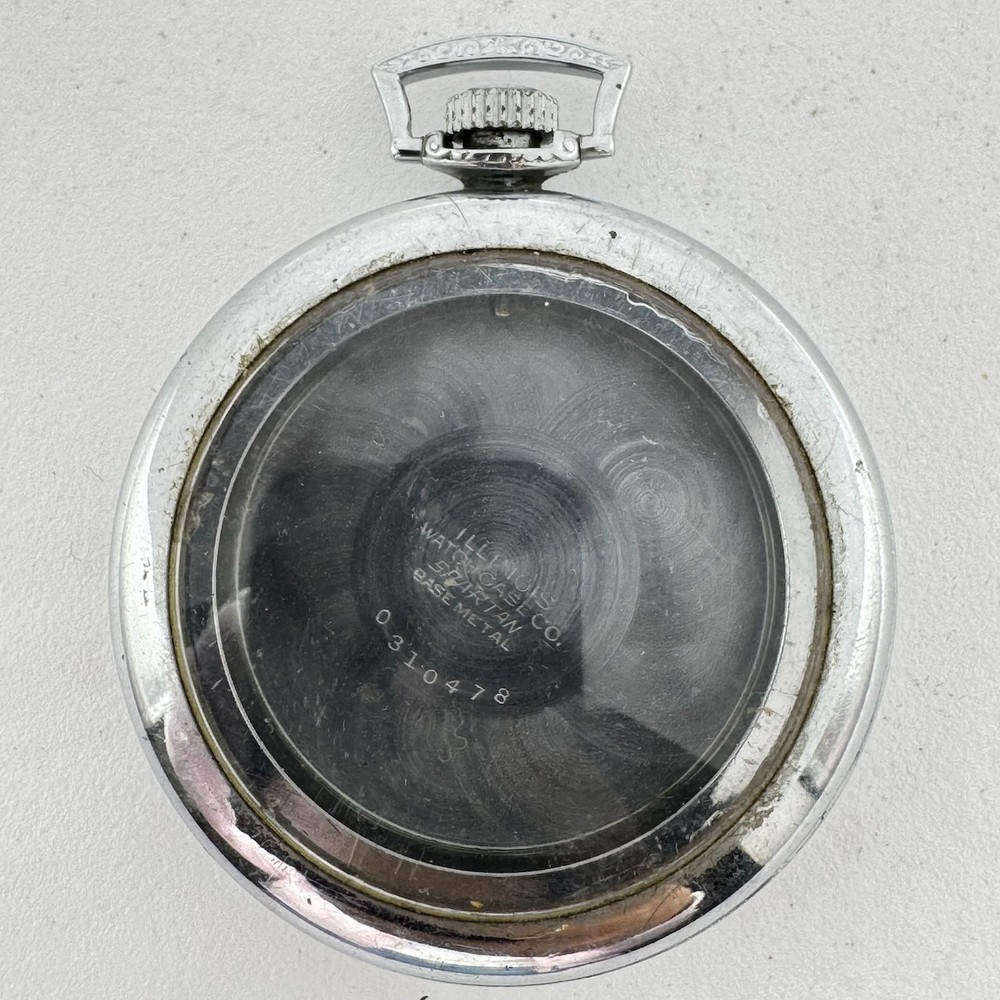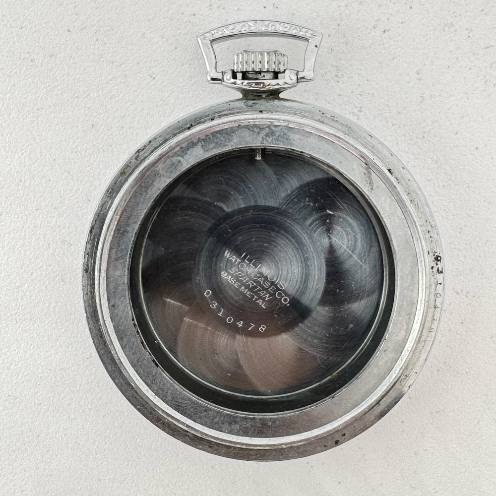 Antique 6s Illinois Spartan Open Face Pocket Watch Case Chrome PlatedPinstriped Product Description Item: Pocket Watch Case Brand: Illinois Model: Spartan Case Material: Chrome Plated Country: USA Gender: Unisex Product Measurements Inside Diameter: 35mm Outside Diameter: 47.5mm Product Condition Overall Condition: Fair, overall condition for its age. Case: There are scratches on the case. Crystal: There are scratches on the crystal.