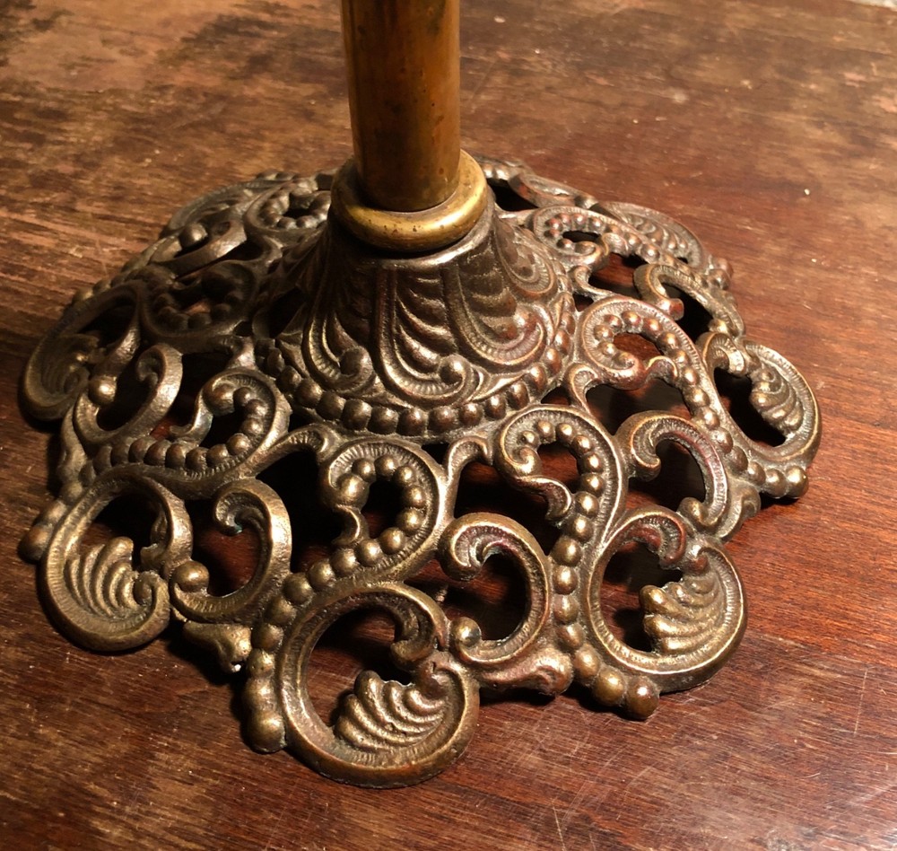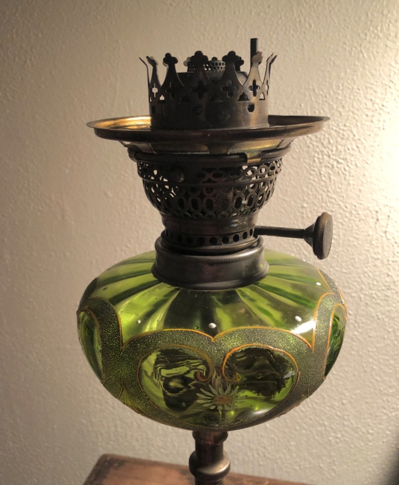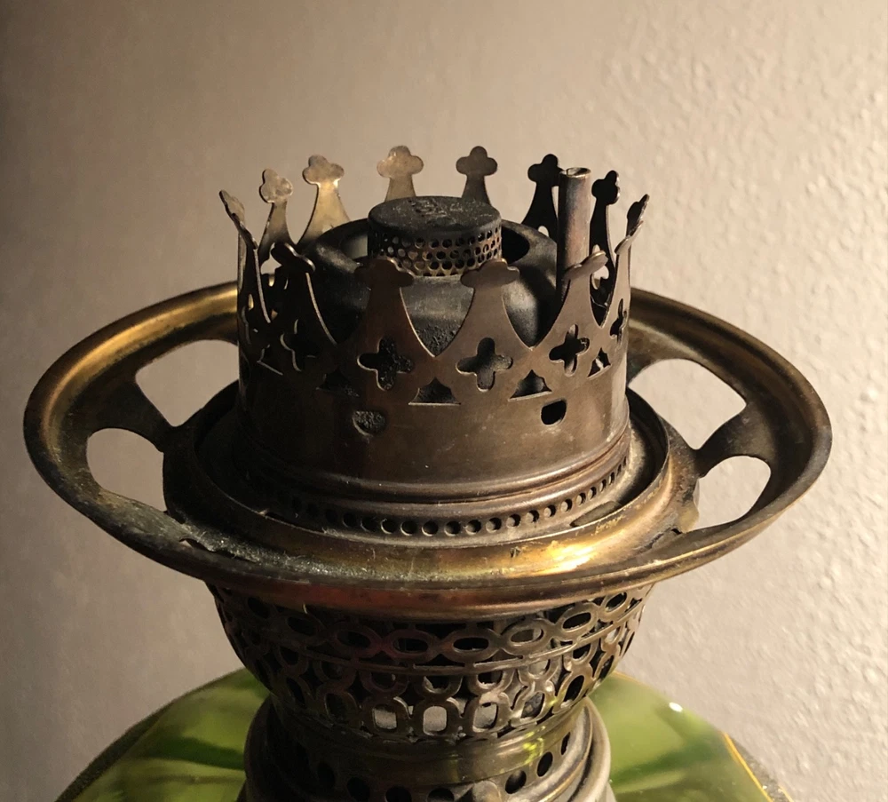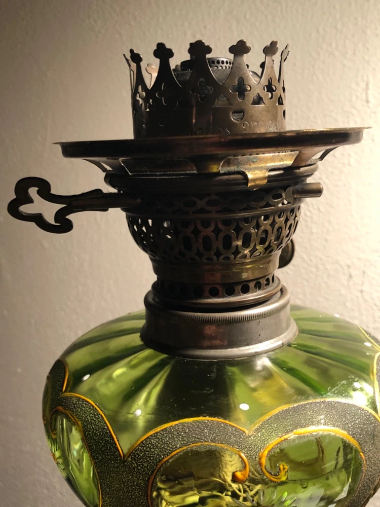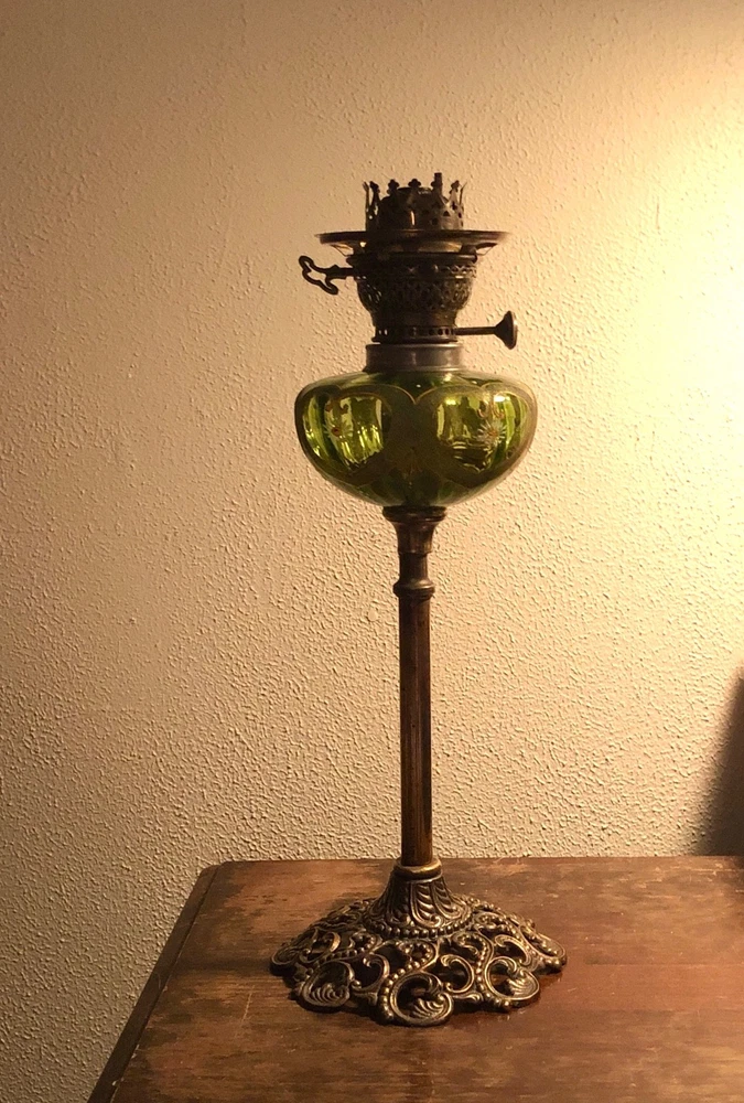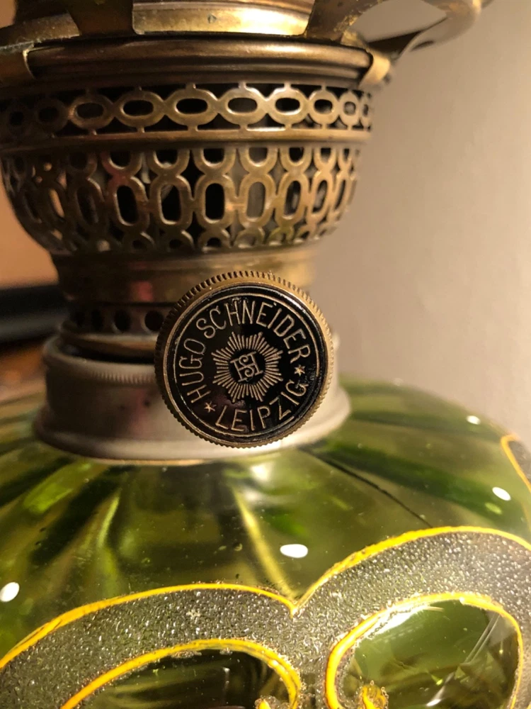 The Antique Victorian-Art Nouveau Oil Lamp with a green glass base and flower pattern is a vintage piece that exudes elegance and charm. This large-sized lamp features a lantern design with a knob control burner by Hugo Schneider, Leipzig. Made of antique brass with a finish that complements the intricate Victorian Art Nouveau style, this original oil lamp from the late 19th century is a unique and captivating addition to any collection or space. No chimney included. !!!Glass oil bowl is cracked, so lamp is unusable unless bowl replaced or repaired. See description and photos. Suitable for decor or collection display. Lamp will be disassembled for shipping. Original unused wick is attached to burner.