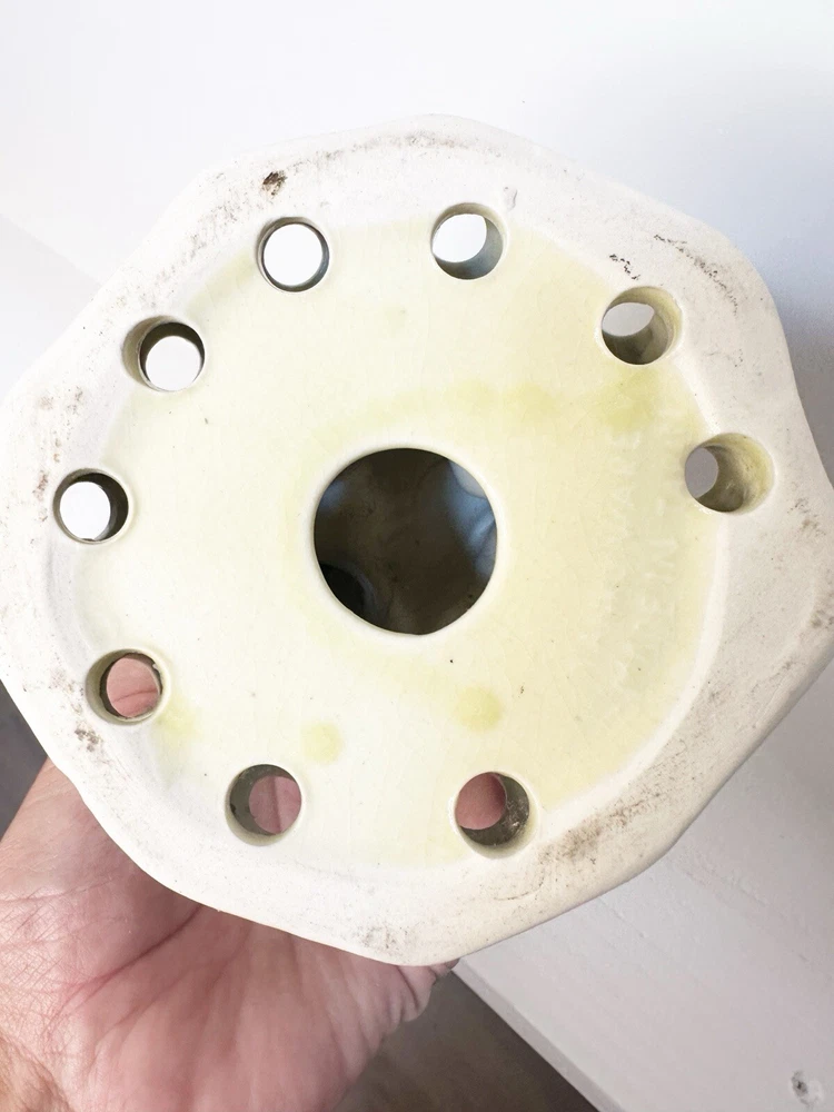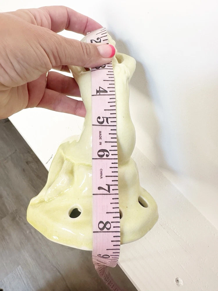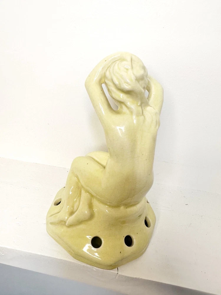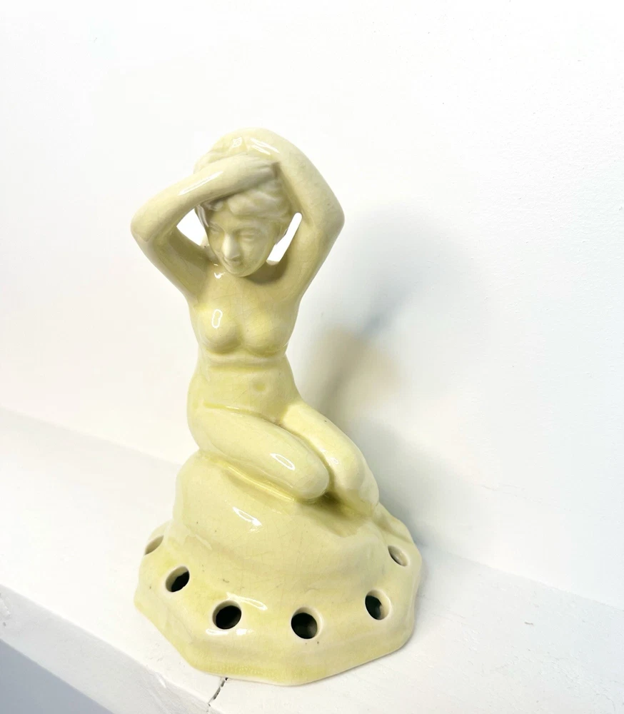 This antique art deco figural flower frog features a beautiful nude lady with a yellow flower design. Made of ceramic porcelain, it is a medium-sized collectible item that stands at 7 inches tall and weighs 1 pound and 1 ounce. Produced in Japan in the early 20th century, this original piece is a great addition to any room and is perfect for flower arrangements. The glossy finish and art deco style make it a unique and valuable decorative collectible. It is an original piece from the 1930s and is not a reproduction. The brand is Yanko Ware and it was manufactured using art pottery techniques. Excellent no chips or cracks