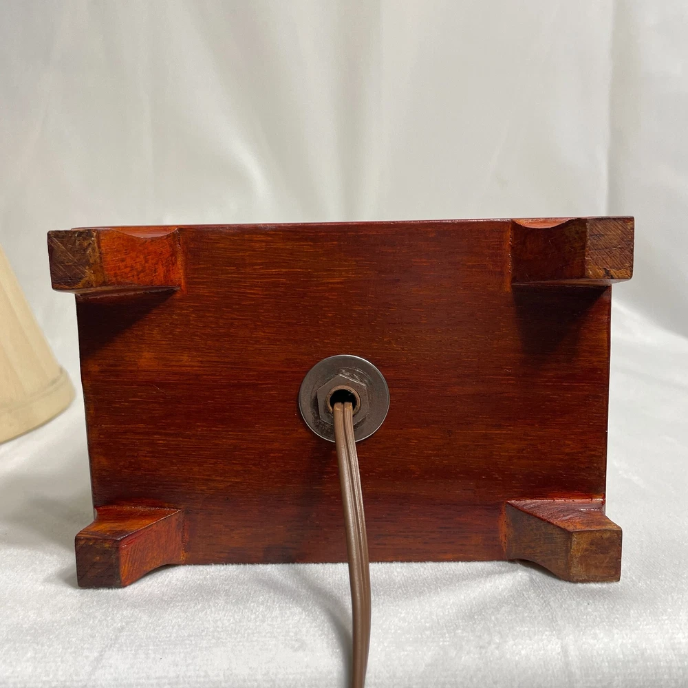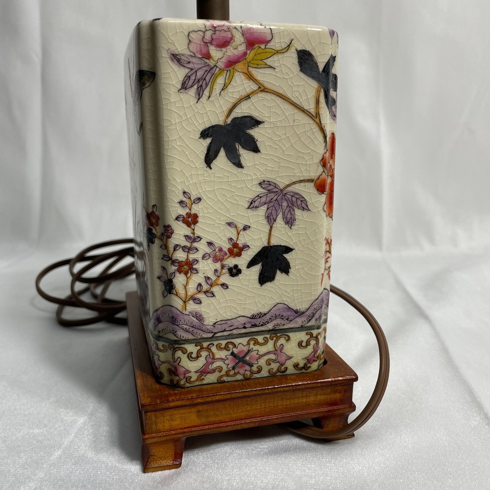 This Antique Porcelain Lamp from the 1940s features a beautiful Multi Color Floral Design on a Wood Base. The lamp has a Shaded design with a Bell-shaped Lamp Shade included. It is a vintage piece with a 1940's style and an Original design. The lamp has a Corded Electric Power Source with Knob Control and a 3-light Switch option for easy operation. Standing at 17 inches high, this Lady Lamp exudes a classic Art and Floral theme, making it a unique addition to any Unisex Adults' living space. Lamp Dimension: H 17" W 5 3/4" L 4" Cord Length: 8 ft Lamp Shad: H 8" Top Diam 8" Bottom Diam 12"