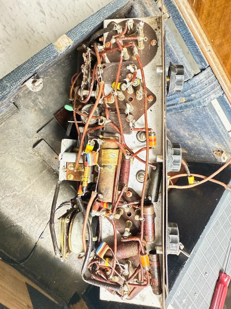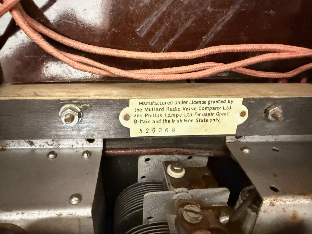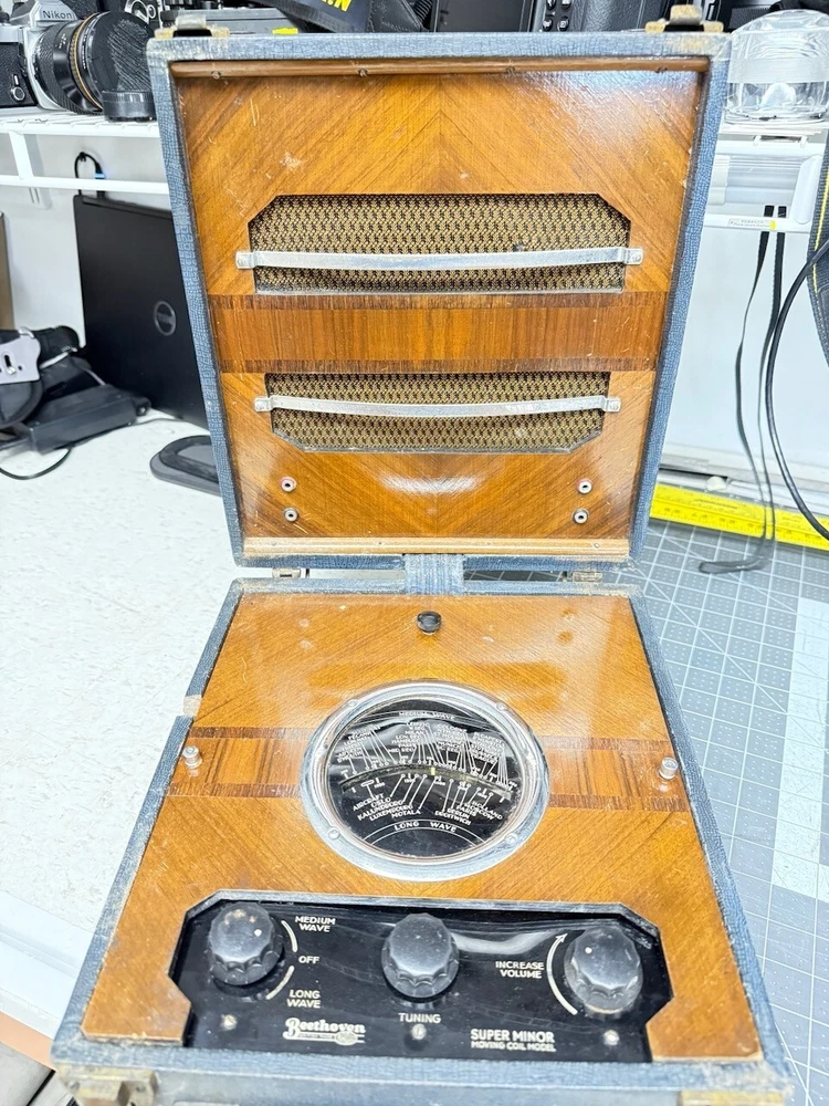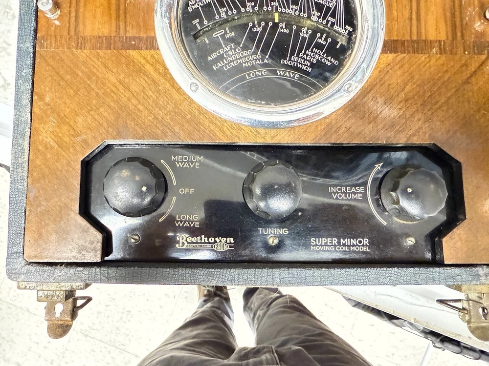 This is a Beethoven Super Minor Model battery powered radio manufactured in the UK. From the note inside regarding the "Irish Free State" it must have been manufactured before December 1937 when the IFS became Eire. I have had this radio for over 40 years and when I got it I recapped it (see photos) and had it working. I used a stack of 9V batteries for HT, one 9 V for the two grid bias (C) voltages adjusted by two pots and a 1.5V cell for the filaments. I haven't powered it on for many years but I believe it should still work. It's a great art-deco design case. It's a TRF not a superhet and the volume is actually the regeneration/reaction control. Uses VP2, PM2HL x2 and KT2 valves (tubes) and covers medium and long wave