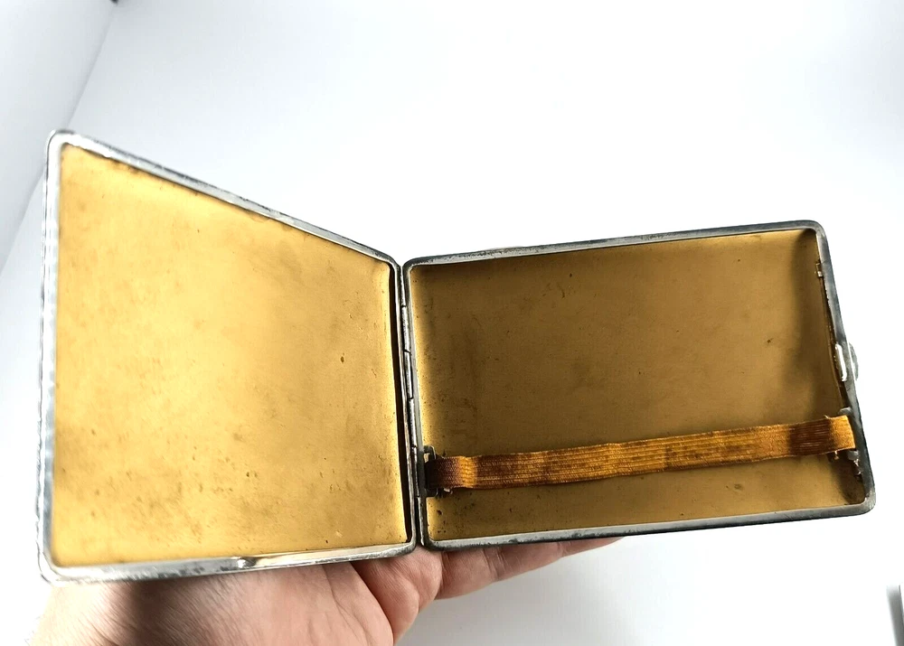 This antique cigarette case features a sleek black enamel finish with an elegant Art Deco design. The interior is gilded and retains its original elastic strap, making it a unique and stylish piece. A great addition to any vintage smoking accessory collection. antique cigarette case, vintage cigarette case, enamel cigarette case, black enamel case, Art Deco cigarette case, rare cigarette case, collector's cigarette case, vintage smoking accessory, retro cigarette case, antique smoking case, Victorian cigarette case, Edwardian cigarette case, old cigarette case, 19th century cigarette case, antique tobacco case, vintage snuff box, enamel snuff case, art nouveau case, elegant cigarette case, classic cigarette holder, ornate cigarette case, historical smoking accessory, rare case, museum quality case, engraved cigarette case, pocket cigarette case, antique curio, investment collectible, French cigarette case, Swiss cigarette case, European cigarette case, decorative case, unique smoking case, early 1900s cigarette case, rare tobacco accessory, steampunk cigarette case, bespoke cigarette case, black lacquer case, antique jewelry, rare antiques, estate collectible, gilded cigarette case, handcrafted cigarette case, sophisticated smoking case, historical artifact, retro collectible, one-of-a-kind case, gentleman’s accessory, luxurious vintage case, heritage cigarette case, timeless treasure, smoking history, exclusive collector's item, limited edition case, elegant vintage accessory, steampunk collectible, historical case, bespoke vintage case, antique elegance, early 20th century case, classic smoking collectible, stylish cigarette case, exclusive smoking collectible, rare enamel case, rare snuff box, pocket snuff case, antique decor, decorative collectible, smoking enthusiast collectible, elegant gift, stylish vintage case, rare gilded interior case, distinguished gentleman's case, premium collector's case.
