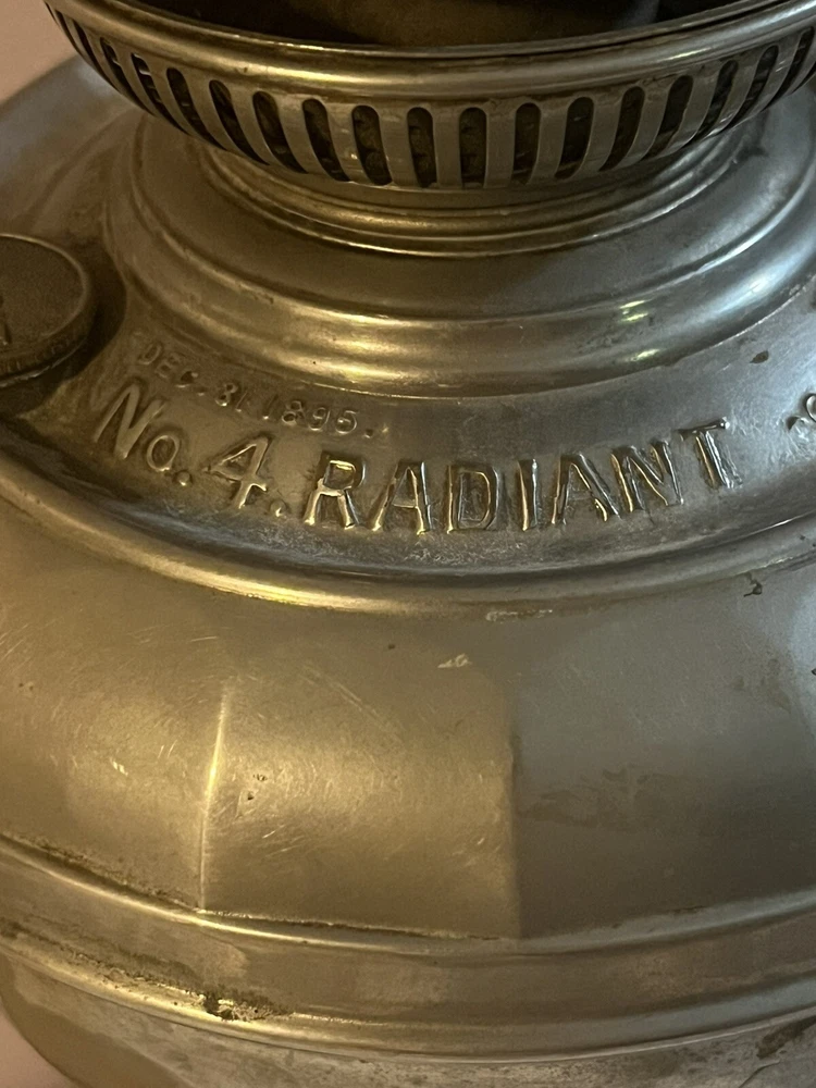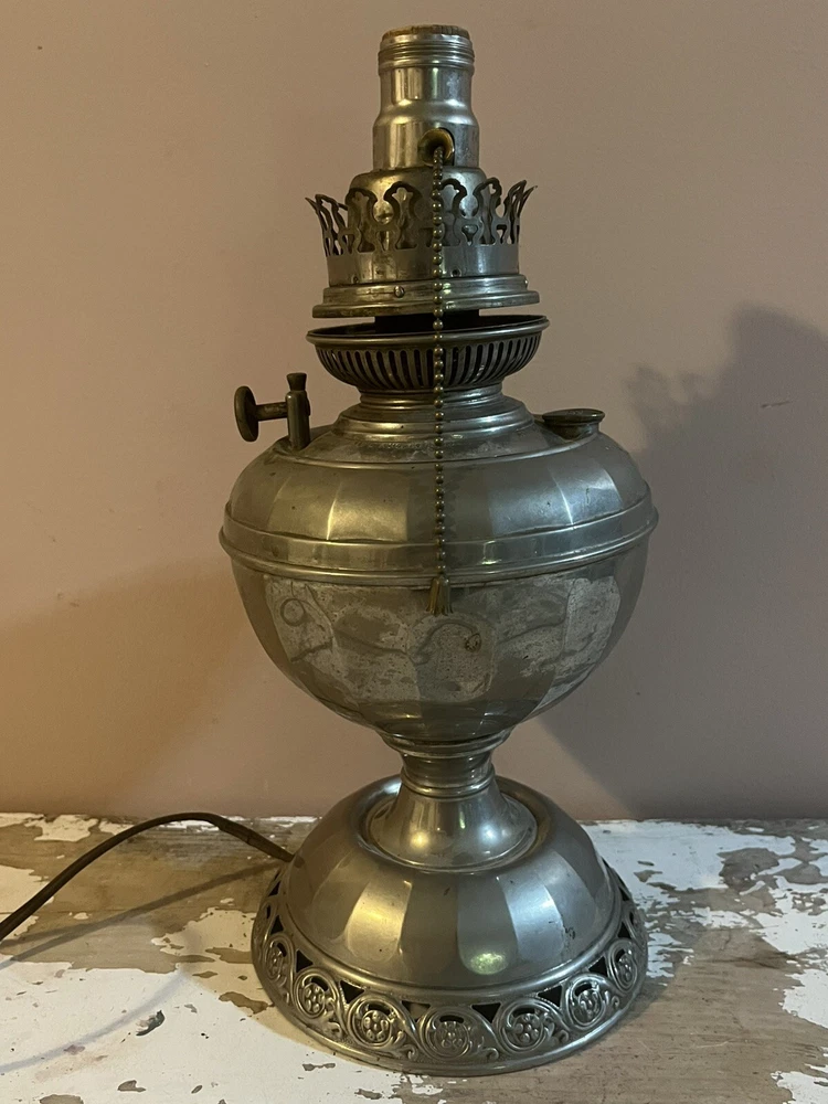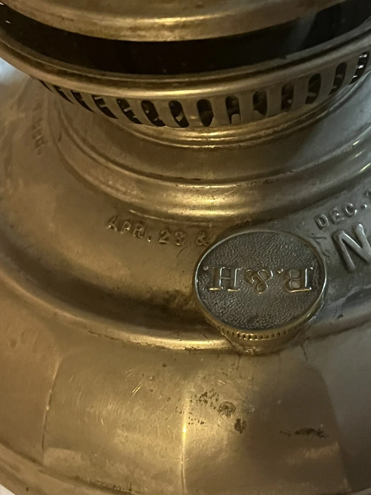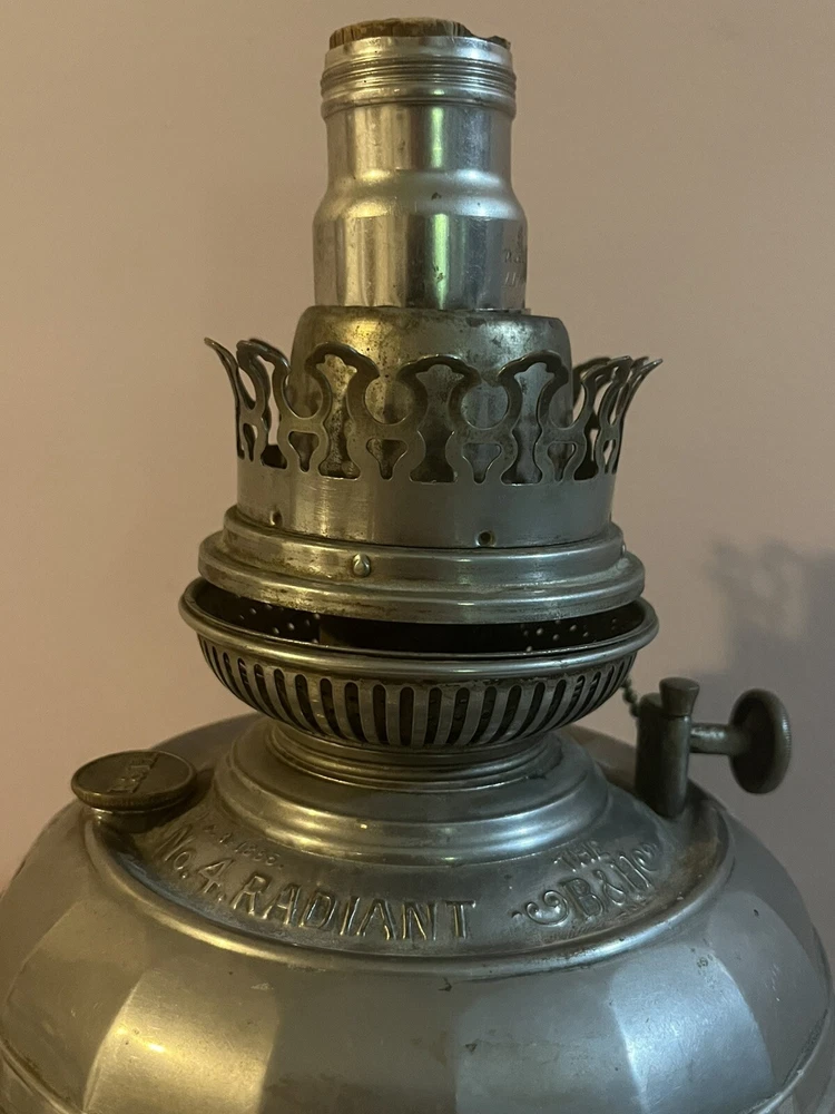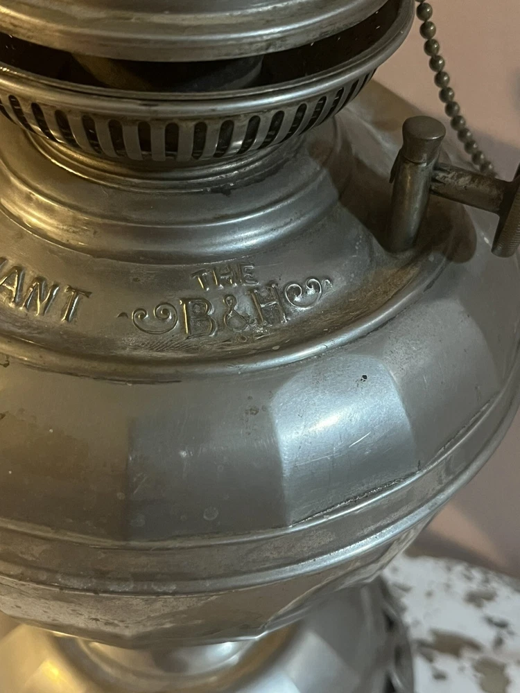 This antique brass B&H Radiant No. 4 oil lamp has been electrified and is perfect for collectors of unique lighting fixtures. The lamp features a beautiful antique brass finish that adds to its overall appeal. It is a great addition to any room in the house and is sure to catch the eye of guests. The H&H brand is known for producing high-quality lighting fixtures and this oil lamp is no exception. It is a great choice for those who appreciate the beauty and craftsmanship of antique lighting. The lamp's finish, type, and categories make it a unique and valuable addition to any collection.