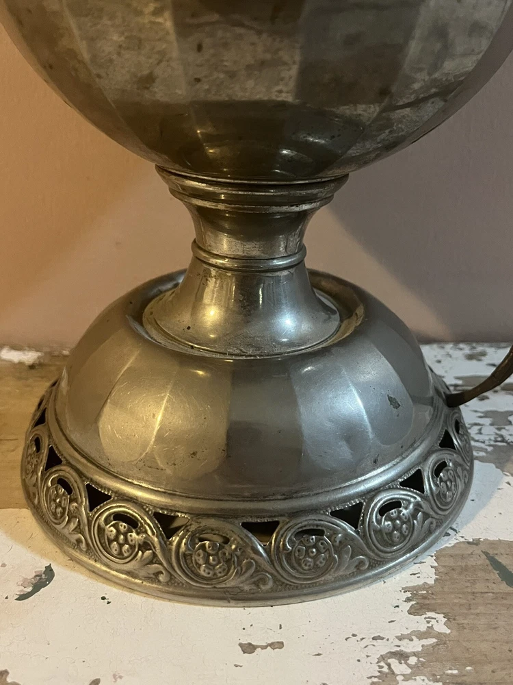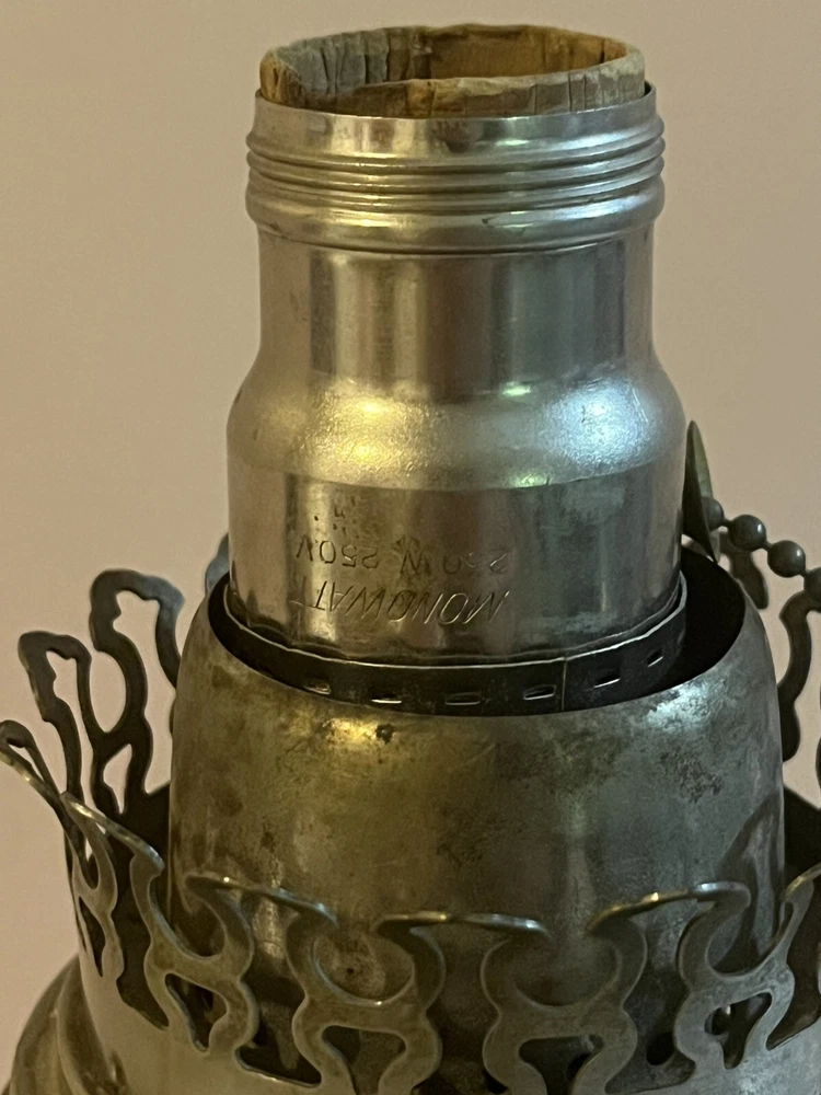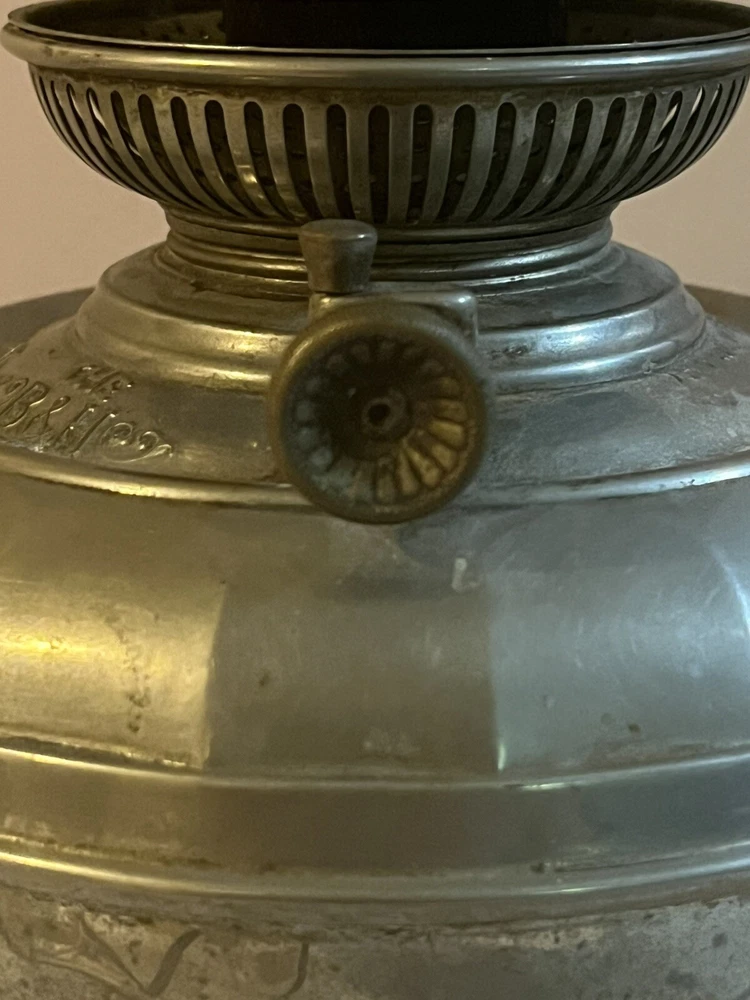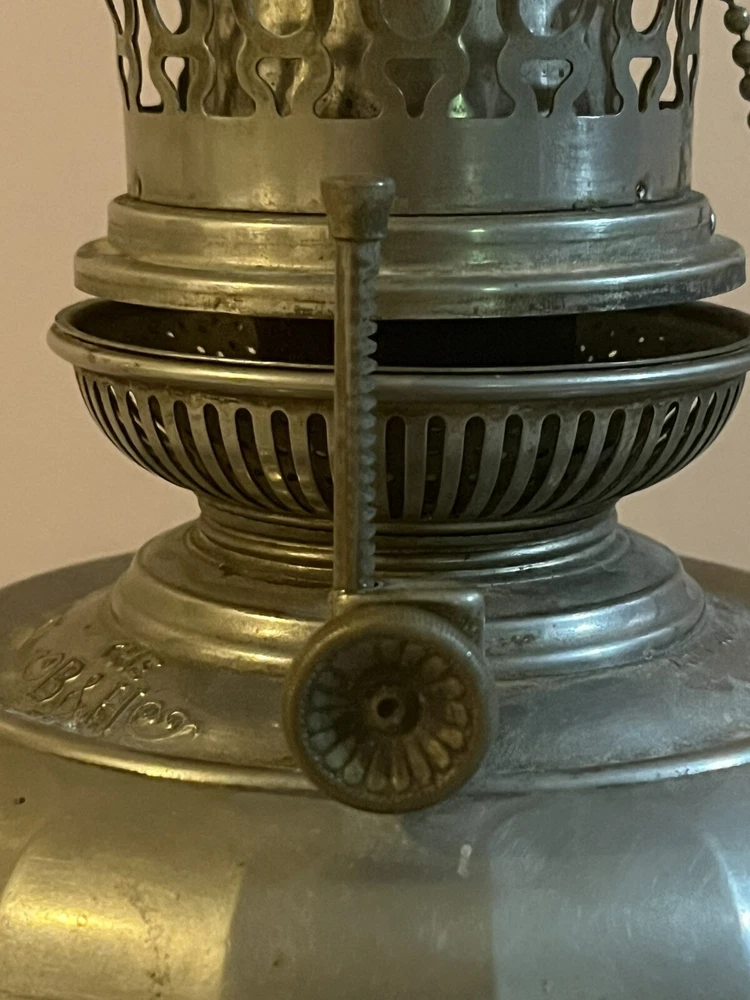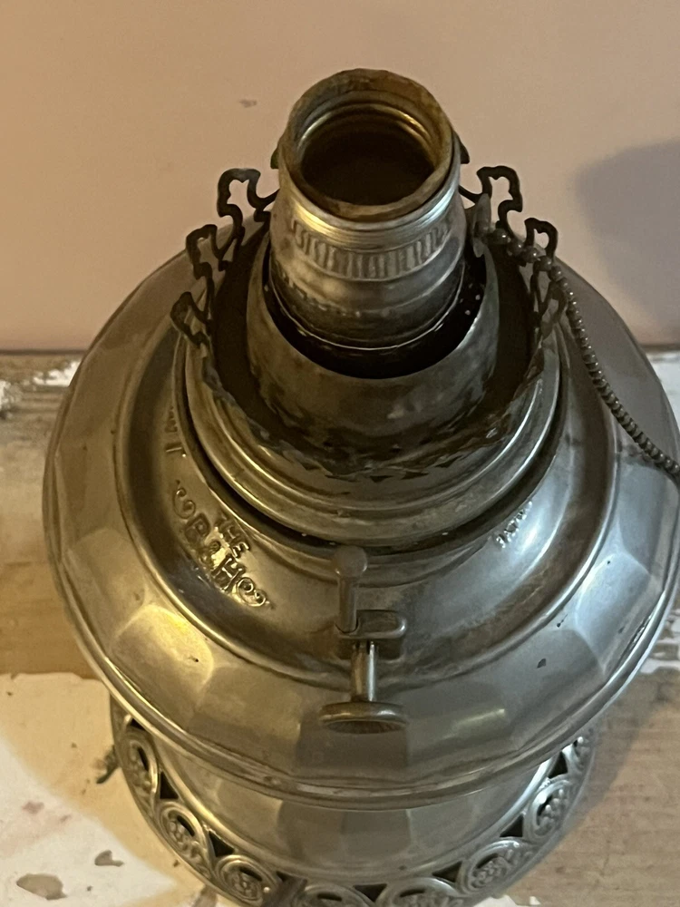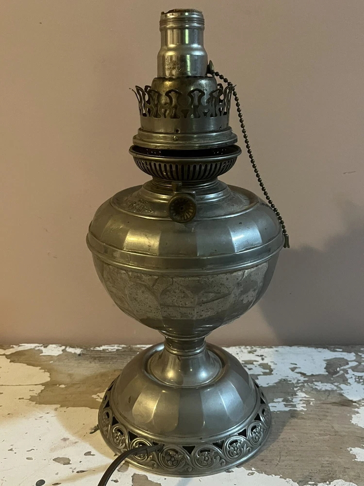 This antique brass B&H Radiant No. 4 oil lamp has been electrified and is perfect for collectors of unique lighting fixtures. The lamp features a beautiful antique brass finish that adds to its overall appeal. It is a great addition to any room in the house and is sure to catch the eye of guests. The H&H brand is known for producing high-quality lighting fixtures and this oil lamp is no exception. It is a great choice for those who appreciate the beauty and craftsmanship of antique lighting. The lamp's finish, type, and categories make it a unique and valuable addition to any collection.