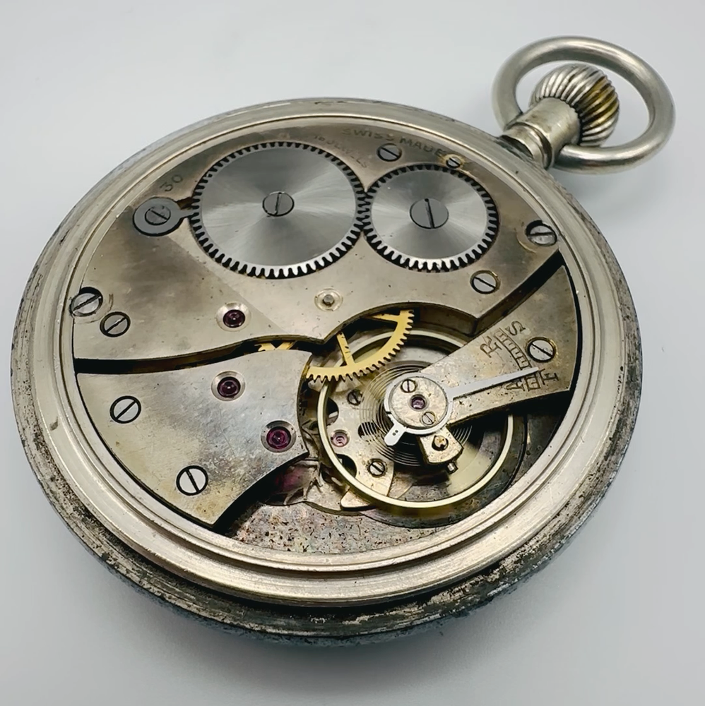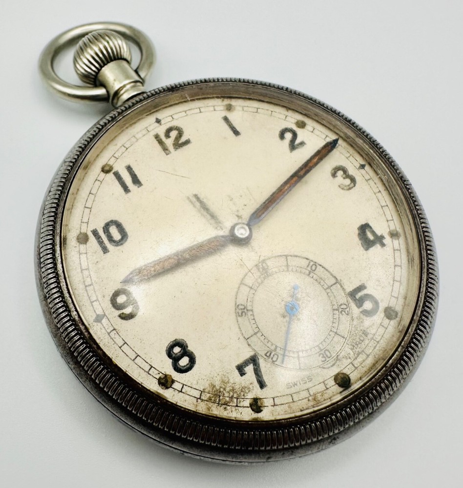 A Piece of History: Authentic British Military General Service (GSTP) Pocket Watch Presenting a genuine antique Swiss-made pocket watch, rich with military history. This timepiece is explicitly marked on its rear case with the distinctive "GS/TP" designation and the Broad Arrow (pheon) mark , identifying it as an official British General Service Time Piece . These watches were widely issued to military personnel across various branches, including the Army and Royal Air Force, for essential timekeeping during the mid-20th century, particularly throughout World War II. The watch is powered by a 15-jewel, stem-wound Swiss-made mechanical movement and is currently in working condition . It features a classic white/cream dial with bold Arabic numerals and a sub-seconds dial at 6 o'clock. The case is a robust base metal, consistent with military-issued timepieces of the era. This is an exceptional opportunity for collectors of military memorabilia or antique watches to acquire a piece with tangible historical provenance. Key Features: Authentic British Military Issue: Clearly marked "GS/TP" with the Broad Arrow, confirming its status as a British General Service Time Piece, issued to military personnel. Swiss Made Movement: Features a reliable 15-jewel, stem-wound mechanical movement. Working Condition: The watch is fully functional. Classic Military Design: A clean, legible dial with Arabic numerals and a sub-seconds indication. Historical Significance: A tangible connection to British military history from the mid-20th century. Condition: This antique military pocket watch is in good working order . Cosmetically, the case, particularly the rear, shows noticeable wear, tarnishing, and some pitting/surface corrosion , which is common and expected for a military-issued item of its age and use. The dial exhibits some natural patina and discoloration consistent with age. Please refer to the detailed photographs carefully, as they form an integral part of the description and best illustrate the watch's exact condition and character gained through decades of service. Markings: Rear Case: "GS/TP" with Broad Arrow, and "075183" (serial/issue number). Inner Case: "3330280" (case number). Movement: "SWISS MADE", "15 JEWELS". Dimensions: Case Diameter: 51.8mm (approximately 2.04 inches). Don't miss this chance to own a piece of military horological history! As usual, this item will be packaged carefully and dispatched with tracking. International shipping is available upon request.