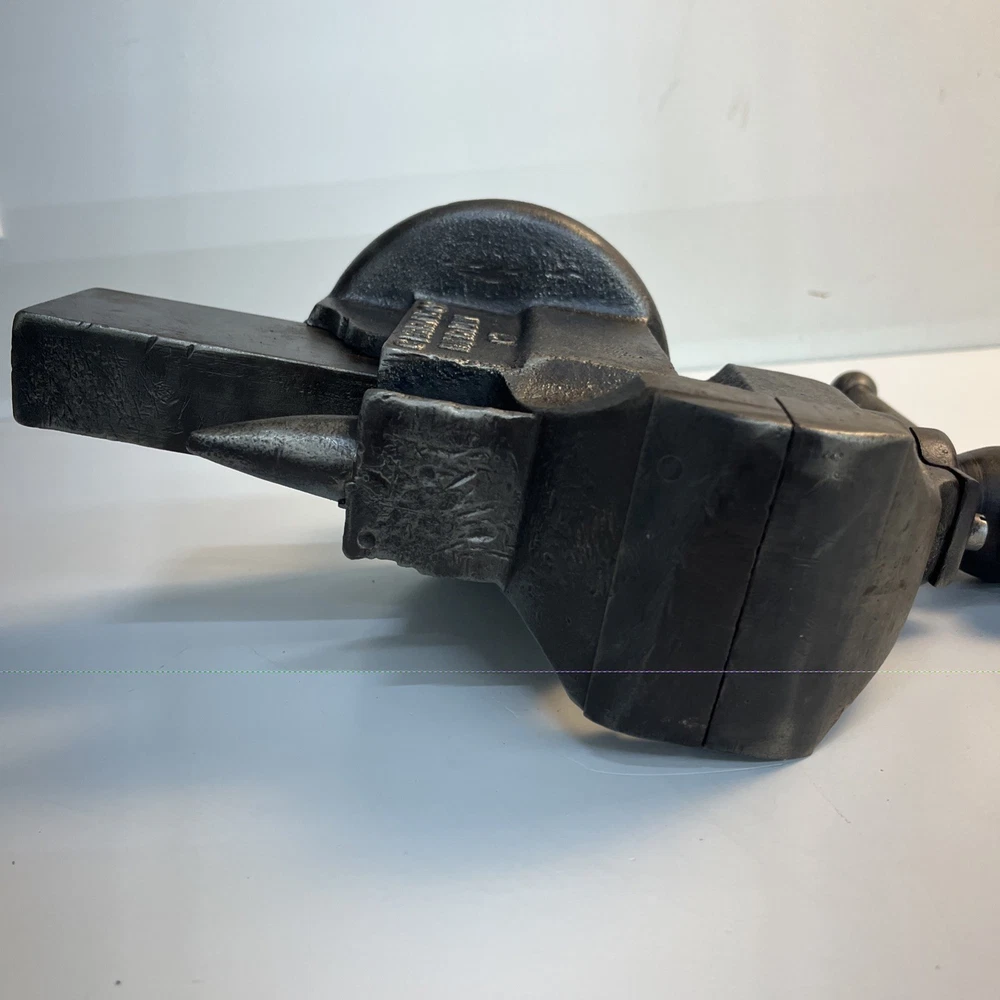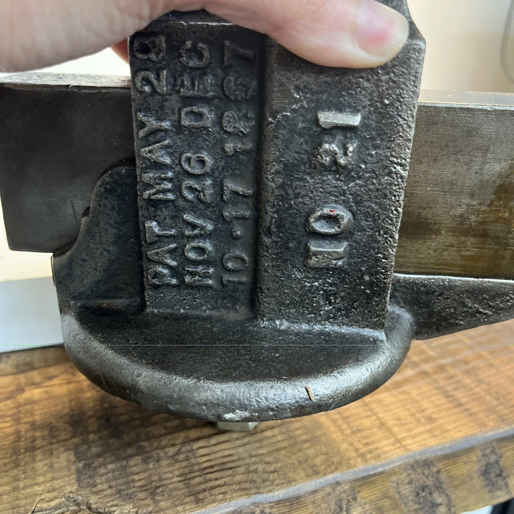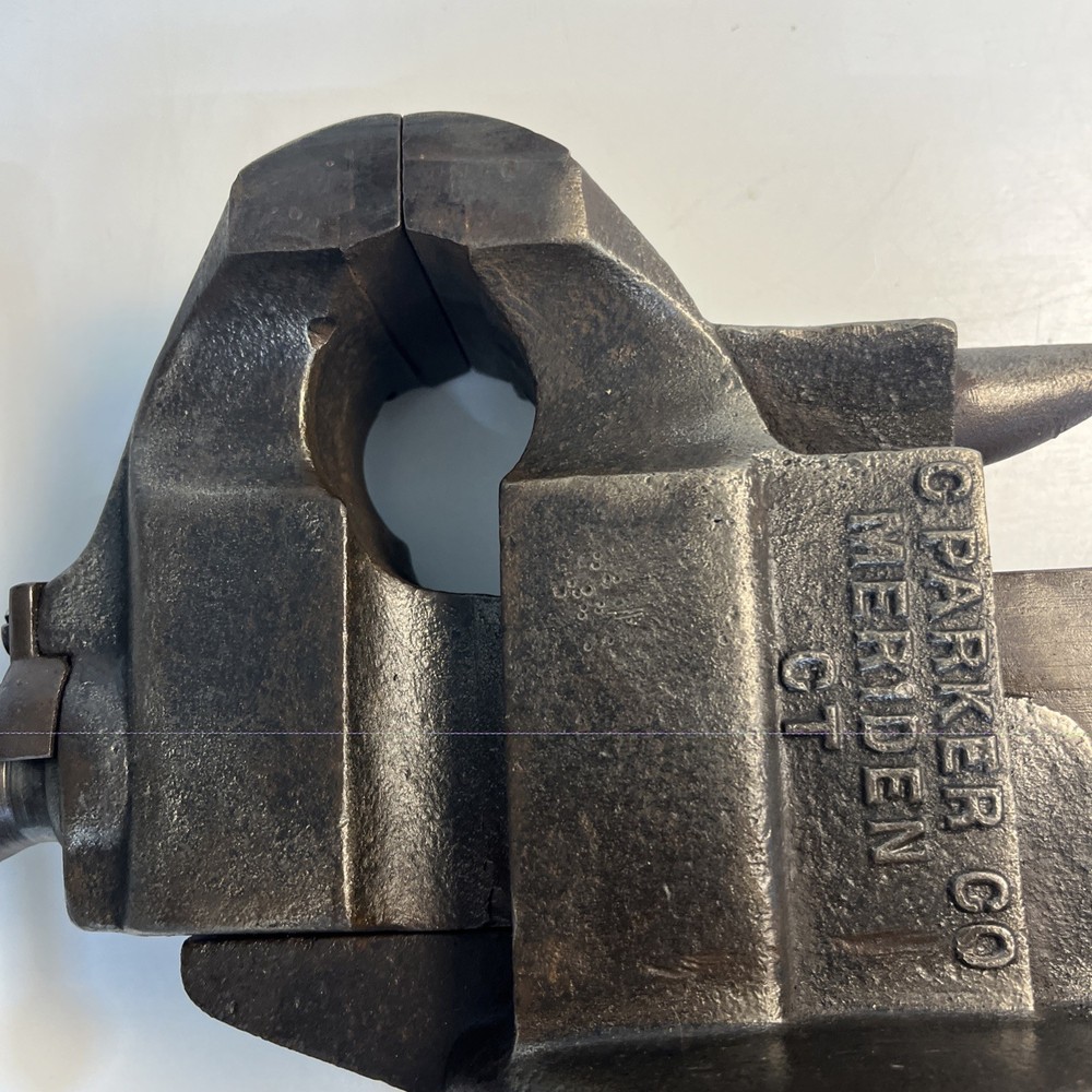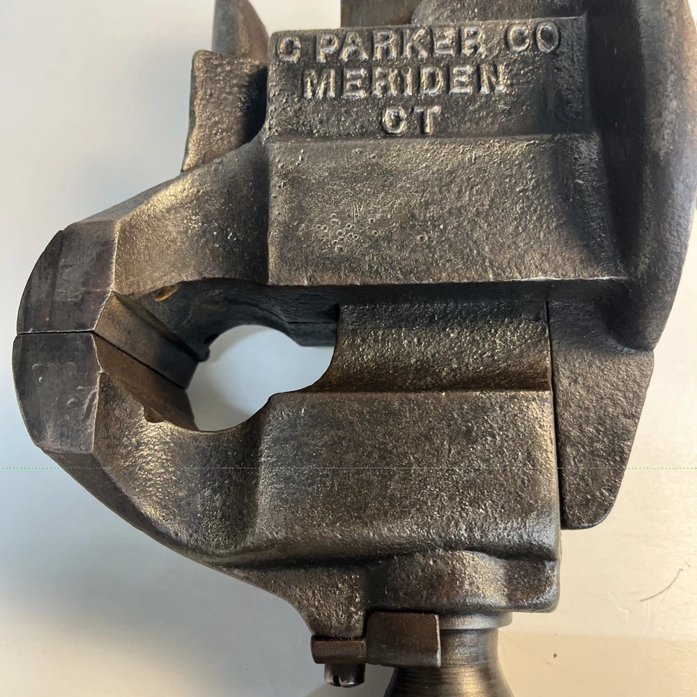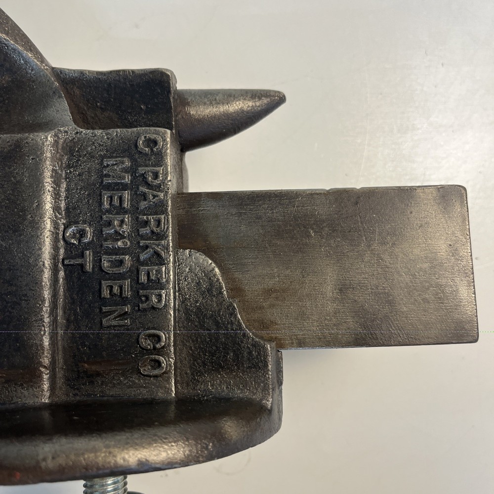 Vintage C. Parker Co. bench vise, No. 21, made in Meriden, Connecticut. This vise features 3 1/8” wide jaws and early patent dates cast into the body: • Patented 1867 Heavy cast construction with original early form. The vise opens and closes smoothly and the jaw faces seat evenly. A replacement bolt/nut is present on the mounting assembly, as shown. Weight is 22.5 lbs. Ideal for: • Period workshop restoration • Blacksmith or machinist bench setup • Antique tool collecting • Industrial décor / display • Functional shop use (built to last) ⸻ Condition Preowned vintage tool in working condition. Shows expected age wear, surface darkening, and light oxidation. Replacement hardware present on base bolt. Jaws align and move properly. Please review photos for exact condition and patina.