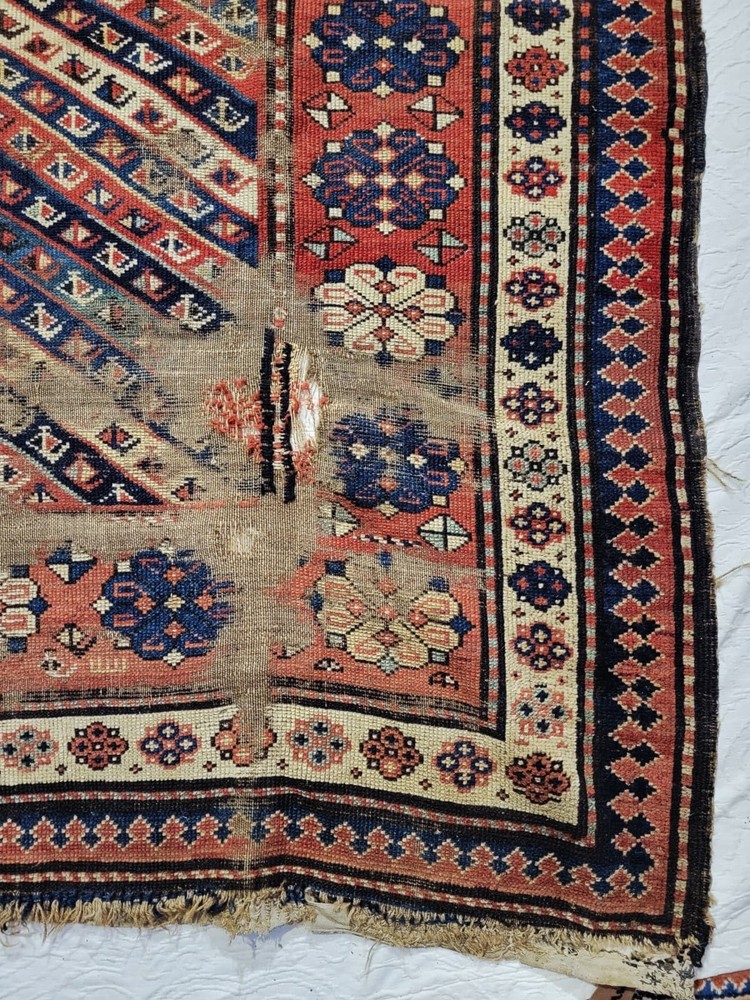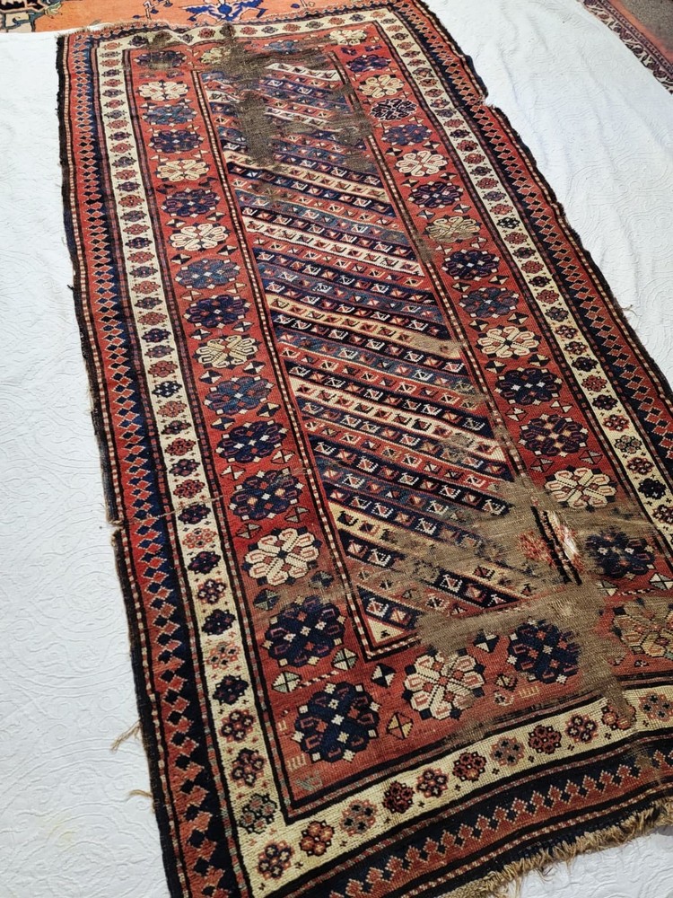 This Antique Caucasian Hand Knotted Wool Runner is a unique and authentic piece with a Geometric tribal design typical of the Shirvan and Kuba regions. Measuring 4x8 feet, this rectangular rug is made of wool and hand-knotted with intricate details. The multicolor palette and tribal style add a touch of history and culture to any space, making it a valuable addition to any collection or decor. Crafted between 1920-1949 using traditional knotted production techniques, this runner embodies the rich heritage and craftsmanship of Caucasian rug-making.
