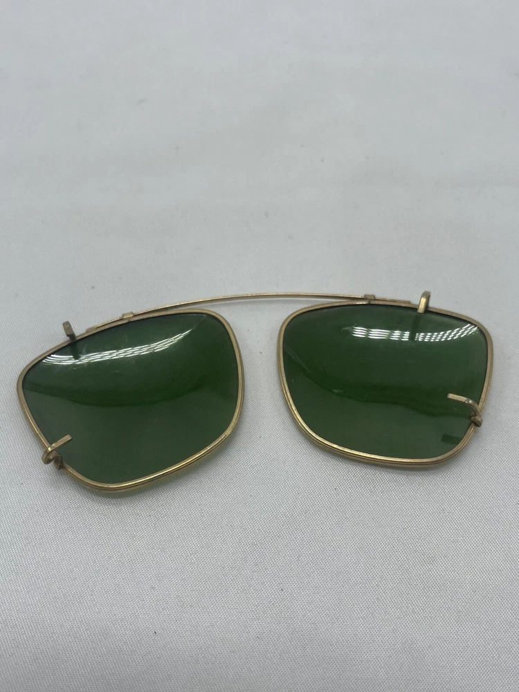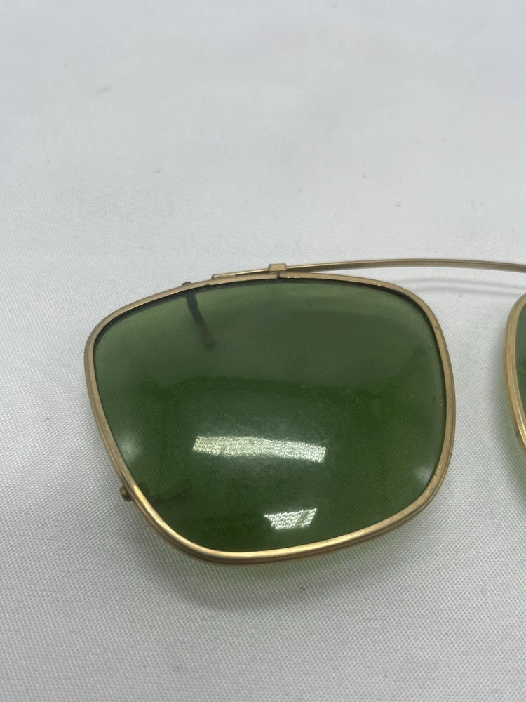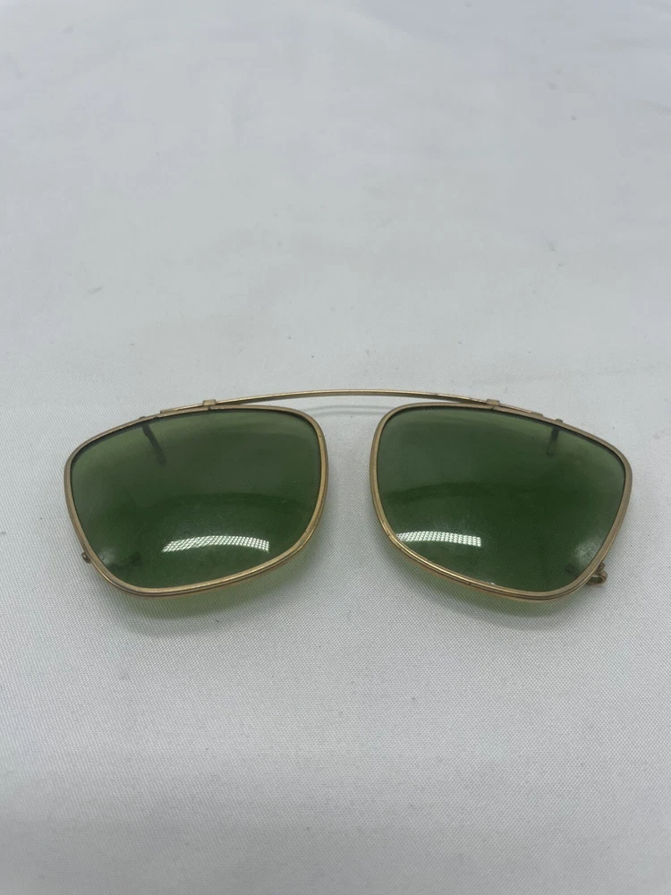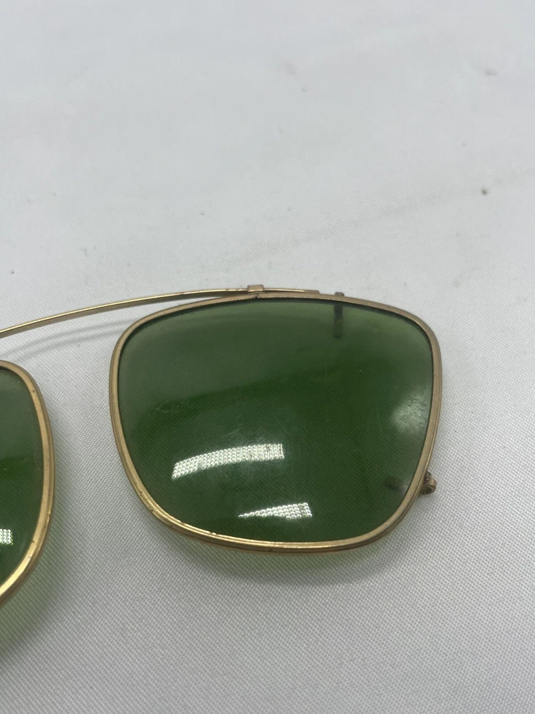 Antique Clip On Sunglasses Polarized Eyeglasses Wire Rim Gold Color Green Lenses. Great used condition. Minor scratches and smudges. See photos for condition.