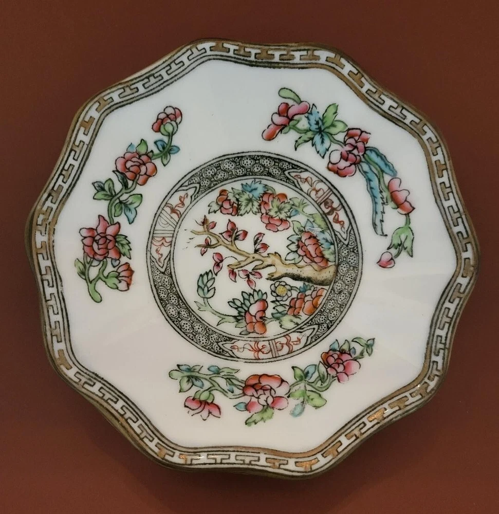 Antique Coalport Indian Tree Pattern Saucers Floral Tree Motifs Vibrant Colors, 5" across with a gold scalloped edge. Old mark of A.D. 1750 when the renown English porcelain manufacturer Coalport was established.