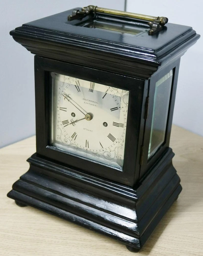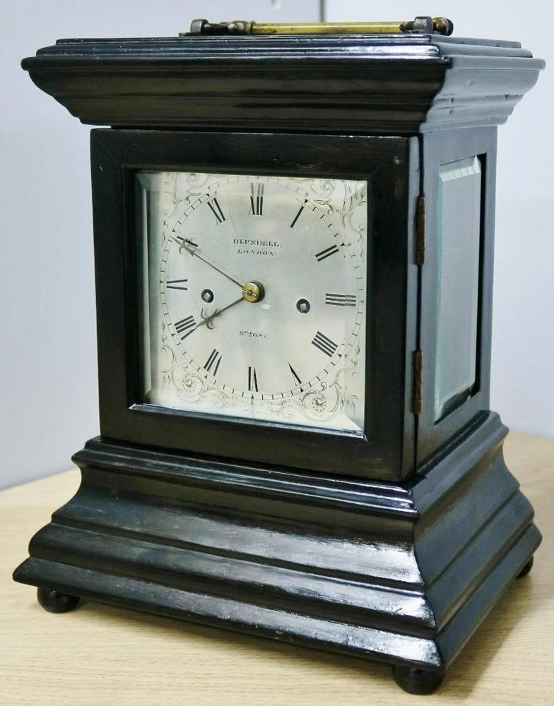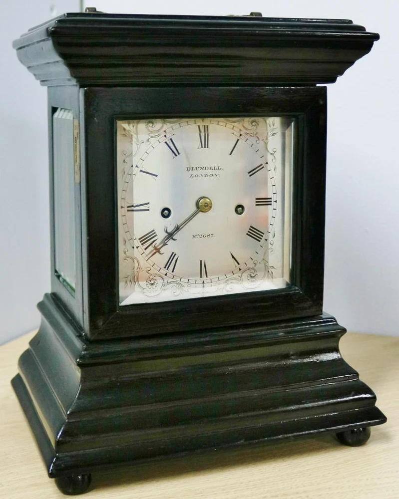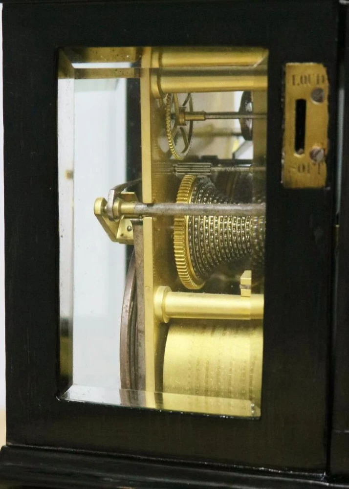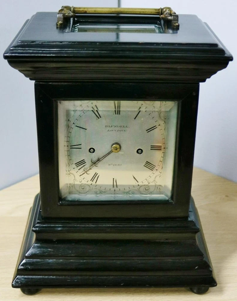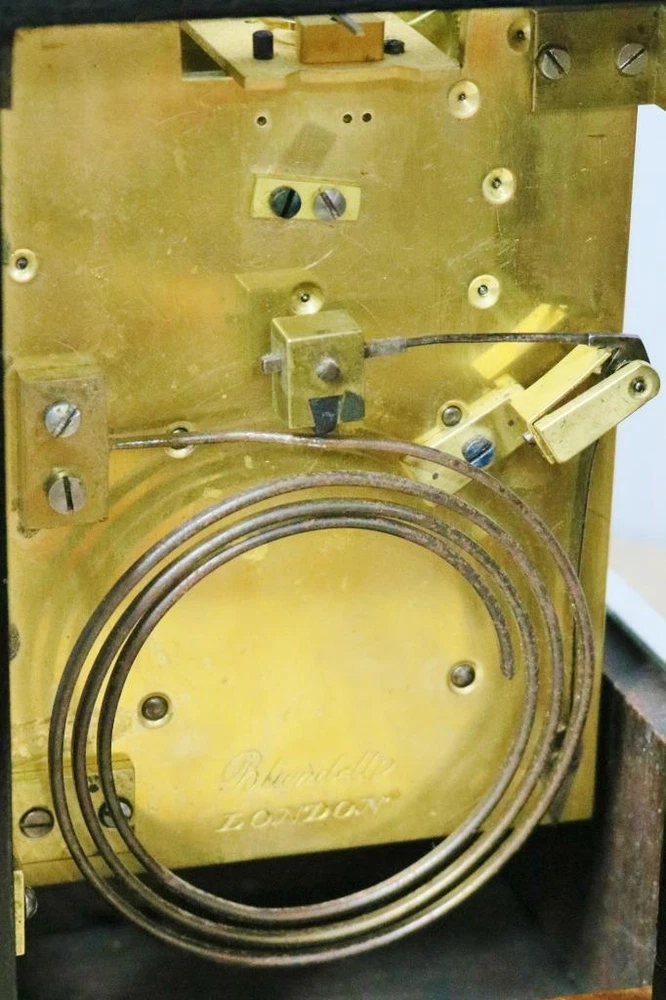 Description Beautiful very rare twin fusee library bracket clock with stunning patina and colour to the wonderful ebonised finish The case is made of solid wood with this stunning patina ebonised finish which gives this absolutely amazing display finish The clock has a classic library clock design with the glass panels on all sides and top with a hinged front and back door, all glass panes are thick bevelled edged panes and all in excellent condition Case is in excellent original condition for age and looks stunning on display with a good age patina Silvered dial with engraved spandrels to the corners, signed by the maker Blundell of London Serial No. 2687 who dates from the early -mid 19th century Engraved Roman numerals and original steel hands Dial is in excellent original condition and looks fantastic Rare English 8 day twin fusee gong striking movement with original platform escapement The movement strikes the bell the amount of hours on each hour Original platform escapement and a new brass winding key Extremely high quality has can be expected and is also signed by the maker Blundell of London Movement is in full working order keeping good time and striking as it should The clock has small proportions and measures 12 inches high x 8 inches wide x 6 inches deep Antique English 8 Day Ebonised Twin Fusee 5 Glass Library Bracket Carriage Clock Antique English 8 Day Ebonised Twin Fusee 5 Glass Library Bracket Carriage Clock Description Main reasons why you should purchase your antique clock from Times & Chimes Ltd !!! We understand buying an antique clock is a big decision and we are very well experienced in current market's as well as fully trained and experienced horologists. We have many years experience in buying and selling original antique clocks which are carefully sourced and many from private collections and we know exactly what buyers expect when purchasing such a prized possession and a future investment. Here are some of the main reasons why you should buy your antique clocks from us for complete piece of mind 1 - We offer the very best customer service before, during and after the sale 2 - Fully trained and hugely experienced horologists 3 - Six month return to base warranty on mechanisms 4 - All our original antique clocks are of high quality and carefully sourced 5 - Every clock we sell are tested for a minimum of 1 week before being offered for sale 6 - We have earned a consistently excellent track record of sales with 100% Feedback 7 - All our items are professionally packed and dispatched promptly 8 - All clocks are sent with world leading couriers on a priority service with full online tracking PLEASE NOTE: I have just received some excellent quality bracket clocks from a private collection all of which have been well looked after all of which will be listed over the next few weeks. Some excellent quality bracket clocks please keep your eyes open over the next few months Description Beautiful very rare twin fusee library bracket clock with stunning patina and colour to the wonderful ebonised finish The case is made of solid wood with this stunning patina ebonised finish which gives this absolutely amazing display finish The clock has a classic library clock design with the glass panels on all sides and top with a hinged front and back door, all glass panes are thick bevelled edged panes and all in excellent condition Case is in excellent original condition for age and looks stunning on display with a good age patina Silvered dial with engraved spandrels to the corners, signed by the maker Blundell of London Serial No. 2687 who dates from the early -mid 19th century Engraved Roman numerals and original steel hands Dial is in excellent original condition and looks fantastic Rare English 8 day twin fusee gong striking movement with original platform escapement The movement strikes the bell the amount of hours on each hour Original platform escapement and a new brass winding key Extremely high quality has can be expected and movement is also signed by the maker Blundell of London Movement is in full working order keeping good time and striking as it should The clock has great proportions and measures 12 inches high x 8 inches wide x 6 inches deep Summary This is a perfect investment clock and a beautiful display piece. Looks absolutely fantastic wherever it is displayed and a true talking point of any room. Exceptional clock which will only grow in value and one of the best ones i have ever had the pleasure to offer for sale and you wont find one quite like this for a while Important Please Read: ALL antique clocks after transport no matter how well they have been looked after or serviced may require setting up, adjustments and setting into beat when you receive them and i always recommend a professional or an experienced clock person to do this correctly for you. Unfortunately with some clocks it is not a matter of unpacking them, putting the pendulum on and away they go, some clocks will need the extra adjustments and setting into beat so please remember you may require a professional for initial setup before bidding. Most clocks will be ok and will not need any additional adjustments but please bear in mind this may not be the case. Any clocks returned because of setting up issues or adjustments needed after transit then a fee will be applicable. For your piece of mind we test all our clocks here before they are sent out and any issues are either sorted or described in the add, the clock will not have any problems unless stated in the add as they are tested vigorously before sending. Please read my full terms and conditions by clicking on the returns tab above. Good luck and happy bidding Click images to enlarge Payment PayPal Cheque Bank Transfer Cash on collection You are more than welcome to personally collect any item free of charge Shipping All my items will be packed professionally Shipping prices include professional packaging materials, boxes, and priority ser