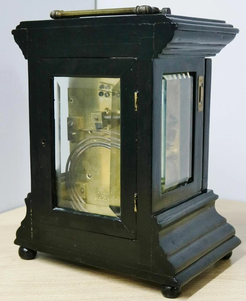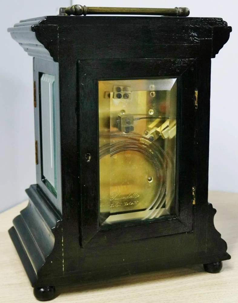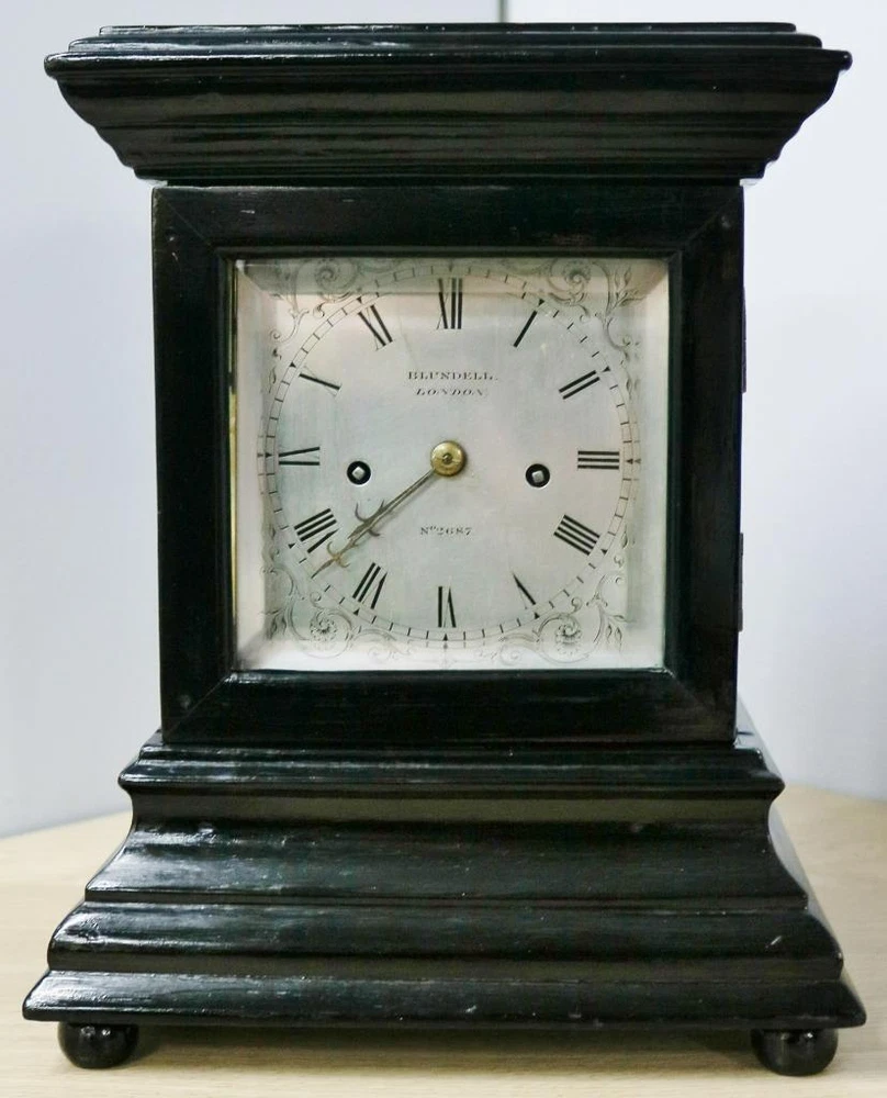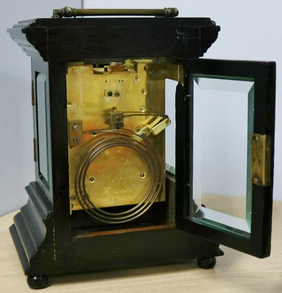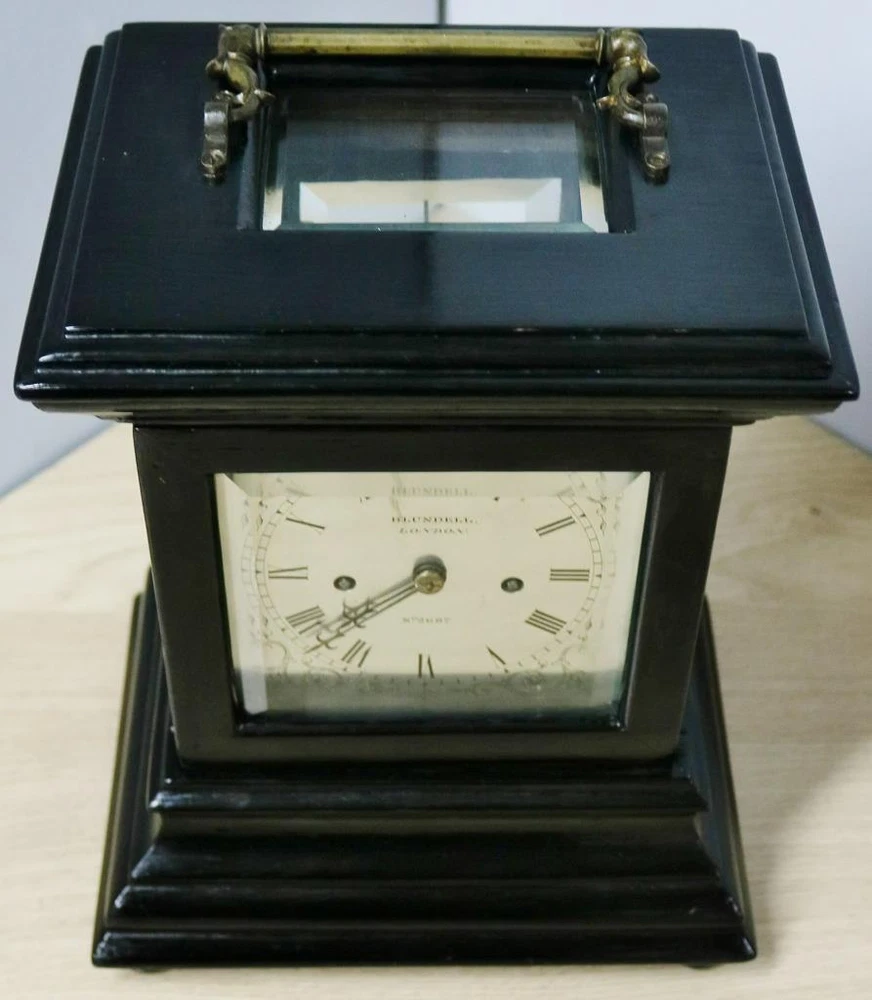 Description Beautiful very rare twin fusee library bracket clock with stunning patina and colour to the wonderful ebonised finish The case is made of solid wood with this stunning patina ebonised finish which gives this absolutely amazing display finish The clock has a classic library clock design with the glass panels on all sides and top with a hinged front and back door, all glass panes are thick bevelled edged panes and all in excellent condition Case is in excellent original condition for age and looks stunning on display with a good age patina Silvered dial with engraved spandrels to the corners, signed by the maker Blundell of London Serial No. 2687 who dates from the early -mid 19th century Engraved Roman numerals and original steel hands Dial is in excellent original condition and looks fantastic Rare English 8 day twin fusee gong striking movement with original platform escapement The movement strikes the bell the amount of hours on each hour Original platform escapement and a new brass winding key Extremely high quality has can be expected and is also signed by the maker Blundell of London Movement is in full working order keeping good time and striking as it should The clock has small proportions and measures 12 inches high x 8 inches wide x 6 inches deep Antique English 8 Day Ebonised Twin Fusee 5 Glass Library Bracket Carriage Clock Antique English 8 Day Ebonised Twin Fusee 5 Glass Library Bracket Carriage Clock Description Main reasons why you should purchase your antique clock from Times & Chimes Ltd !!! We understand buying an antique clock is a big decision and we are very well experienced in current market's as well as fully trained and experienced horologists. We have many years experience in buying and selling original antique clocks which are carefully sourced and many from private collections and we know exactly what buyers expect when purchasing such a prized possession and a future investment. Here are some of the main reasons why you should buy your antique clocks from us for complete piece of mind 1 - We offer the very best customer service before, during and after the sale 2 - Fully trained and hugely experienced horologists 3 - Six month return to base warranty on mechanisms 4 - All our original antique clocks are of high quality and carefully sourced 5 - Every clock we sell are tested for a minimum of 1 week before being offered for sale 6 - We have earned a consistently excellent track record of sales with 100% Feedback 7 - All our items are professionally packed and dispatched promptly 8 - All clocks are sent with world leading couriers on a priority service with full online tracking PLEASE NOTE: I have just received some excellent quality bracket clocks from a private collection all of which have been well looked after all of which will be listed over the next few weeks. Some excellent quality bracket clocks please keep your eyes open over the next few months Description Beautiful very rare twin fusee library bracket clock with stunning patina and colour to the wonderful ebonised finish The case is made of solid wood with this stunning patina ebonised finish which gives this absolutely amazing display finish The clock has a classic library clock design with the glass panels on all sides and top with a hinged front and back door, all glass panes are thick bevelled edged panes and all in excellent condition Case is in excellent original condition for age and looks stunning on display with a good age patina Silvered dial with engraved spandrels to the corners, signed by the maker Blundell of London Serial No. 2687 who dates from the early -mid 19th century Engraved Roman numerals and original steel hands Dial is in excellent original condition and looks fantastic Rare English 8 day twin fusee gong striking movement with original platform escapement The movement strikes the bell the amount of hours on each hour Original platform escapement and a new brass winding key Extremely high quality has can be expected and movement is also signed by the maker Blundell of London Movement is in full working order keeping good time and striking as it should The clock has great proportions and measures 12 inches high x 8 inches wide x 6 inches deep Summary This is a perfect investment clock and a beautiful display piece. Looks absolutely fantastic wherever it is displayed and a true talking point of any room. Exceptional clock which will only grow in value and one of the best ones i have ever had the pleasure to offer for sale and you wont find one quite like this for a while Important Please Read: ALL antique clocks after transport no matter how well they have been looked after or serviced may require setting up, adjustments and setting into beat when you receive them and i always recommend a professional or an experienced clock person to do this correctly for you. Unfortunately with some clocks it is not a matter of unpacking them, putting the pendulum on and away they go, some clocks will need the extra adjustments and setting into beat so please remember you may require a professional for initial setup before bidding. Most clocks will be ok and will not need any additional adjustments but please bear in mind this may not be the case. Any clocks returned because of setting up issues or adjustments needed after transit then a fee will be applicable. For your piece of mind we test all our clocks here before they are sent out and any issues are either sorted or described in the add, the clock will not have any problems unless stated in the add as they are tested vigorously before sending. Please read my full terms and conditions by clicking on the returns tab above. Good luck and happy bidding Click images to enlarge Payment PayPal Cheque Bank Transfer Cash on collection You are more than welcome to personally collect any item free of charge Shipping All my items will be packed professionally Shipping prices include professional packaging materials, boxes, and priority ser