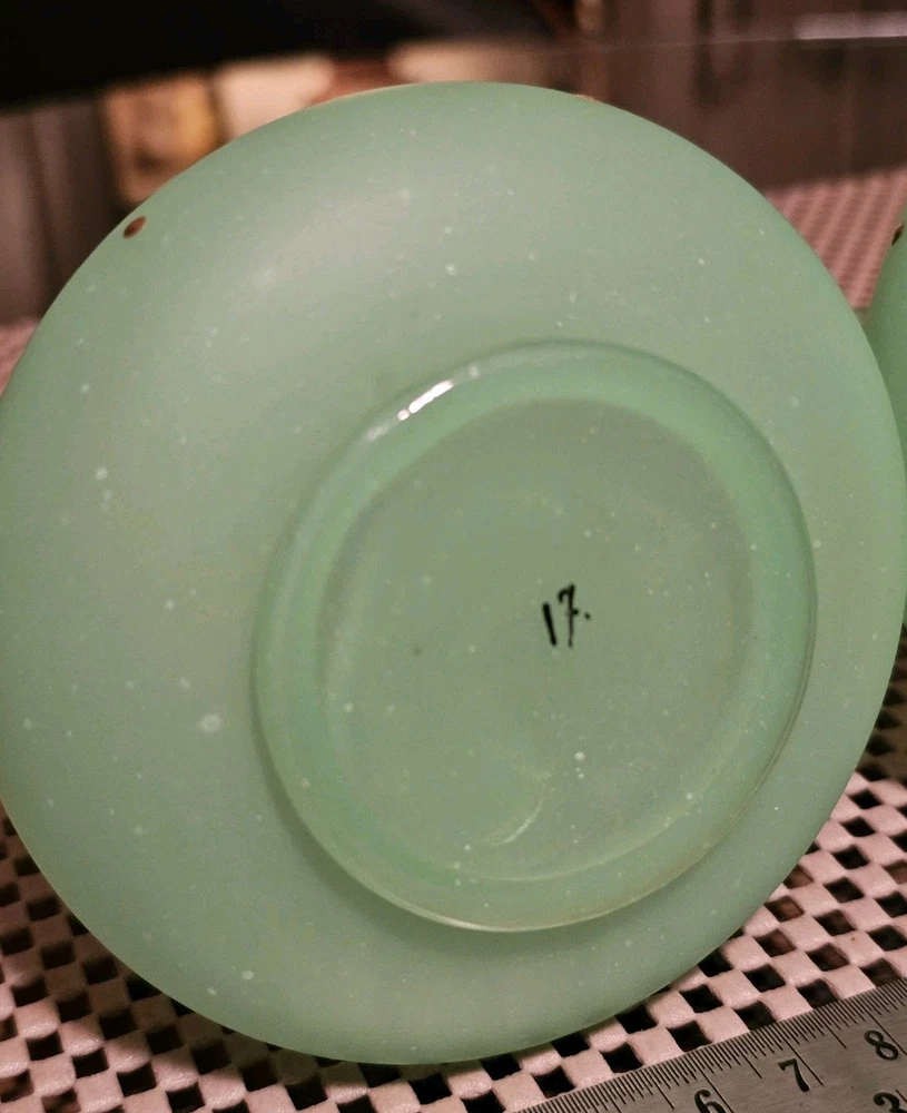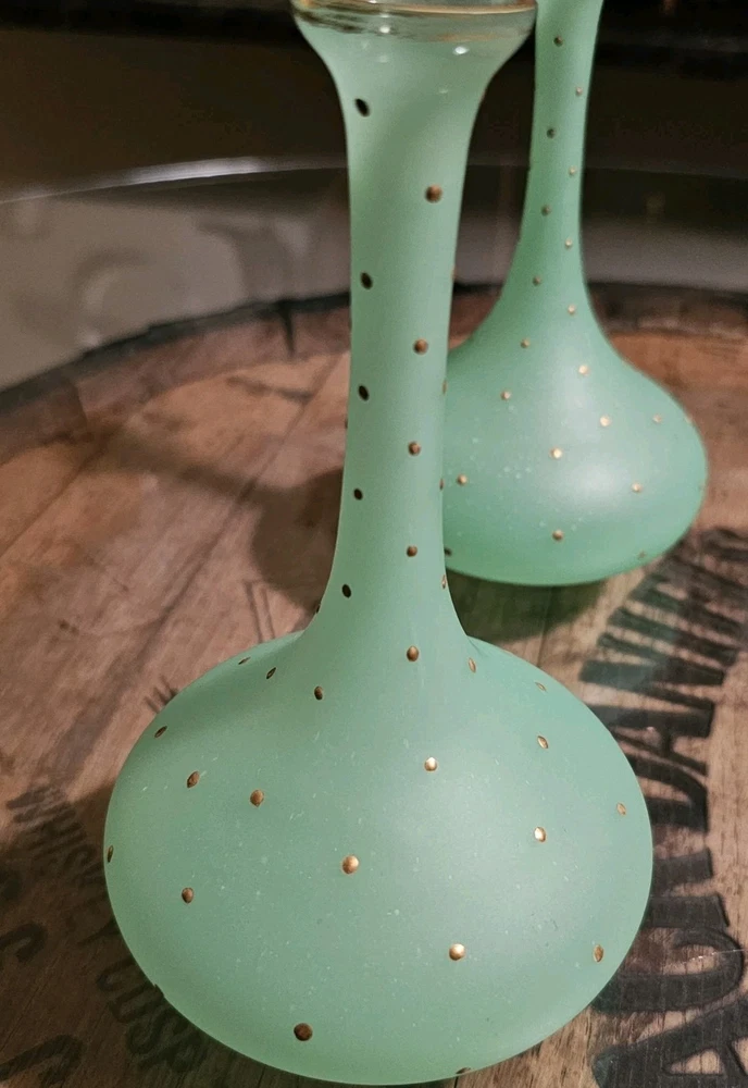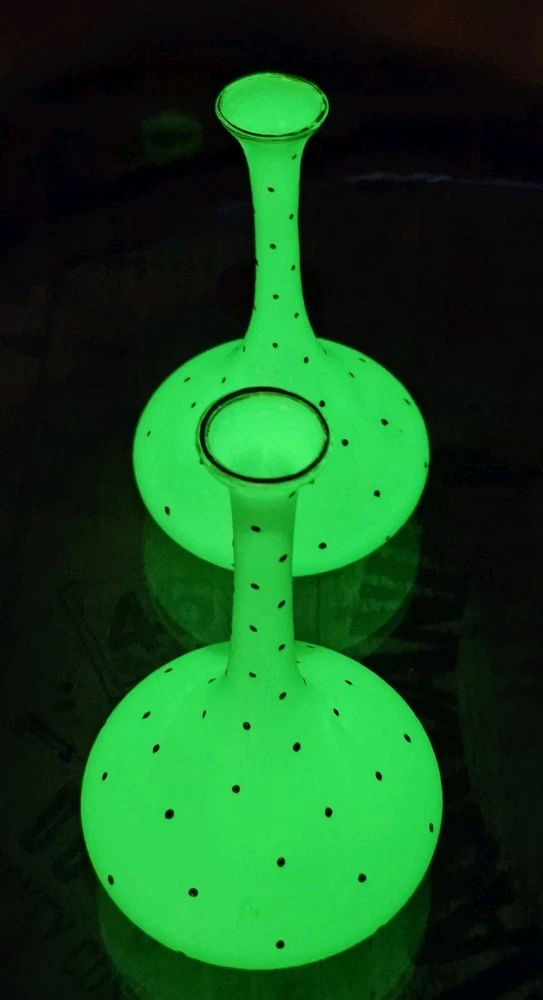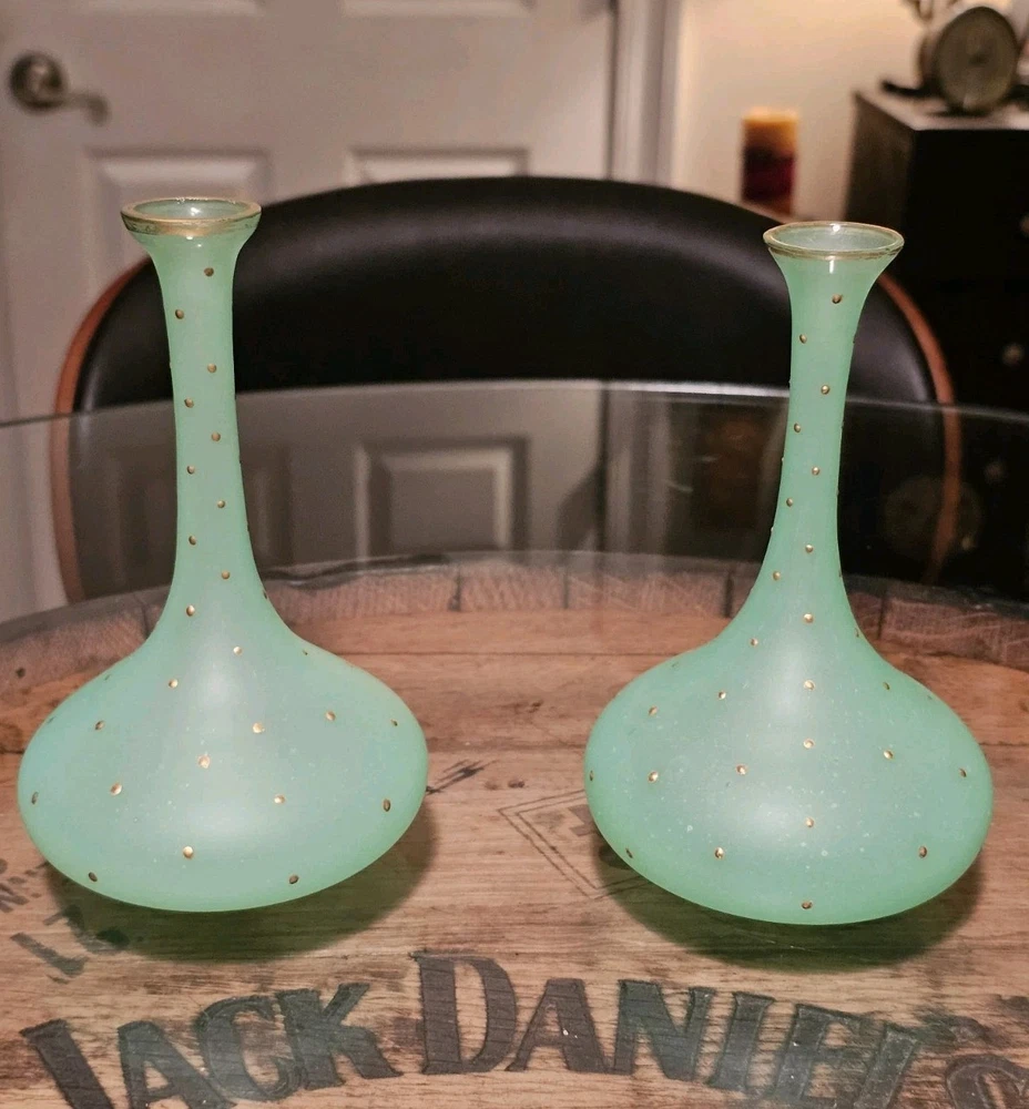 These are a gorgeous pair of early Victorian Jade opaline uranium glass gold gilt dotted patterns. They are in excellent condition with minor wear on the gold gilt around the top rim. There are no chips or cracks. They glow crazy under both 365nm and 395nm blacklights. There is a number on the bottom of each one. One has an 18, and the other has a 24. I have heard some people say they might be Baccarat. That would be good if they were, but if not, I think they are awesome. They have a great look, and I love that shape! If you have any questions, please ask.