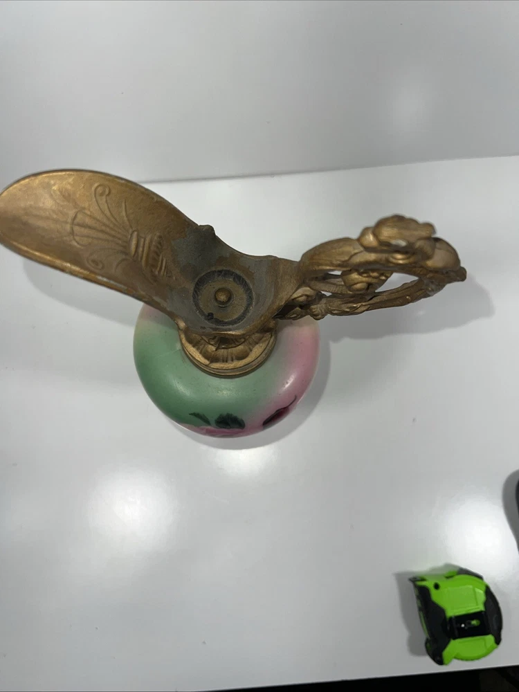 This antique French ewer is a stunning hand-painted glass vase with painted metal mounts. Standing 15 inches tall, this vase features a floral pattern and a French style, making it a beautiful and unique decorative piece. The vase is from the late 19th or early 20th century, originating from France, and weighs 2.5 lbs. Its antique finish adds to its charm, and the intricate detailing showcases its craftsmanship. Perfect for collectors or those looking to add a touch of vintage elegance to their home decor.