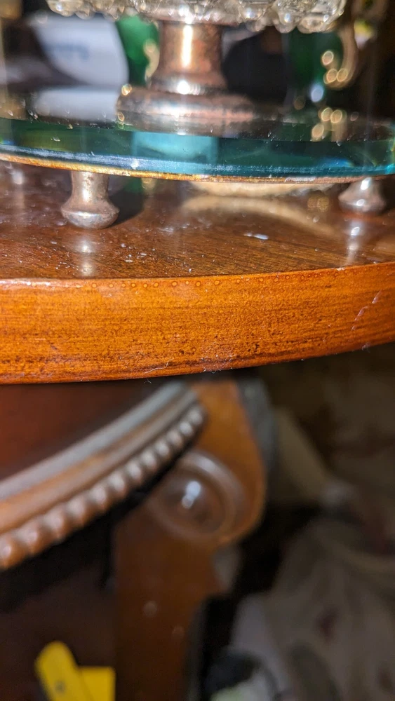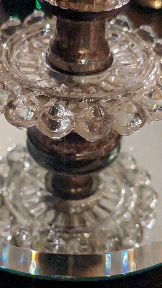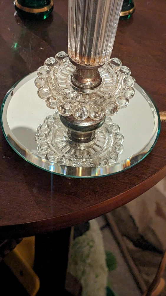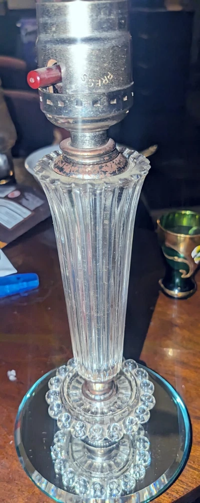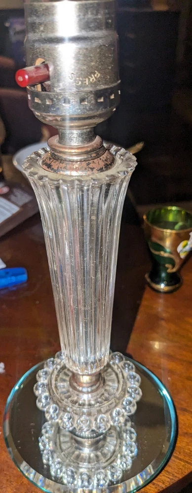 Cute little lamp. I would say it's more of a bedside lamp. Cloth cord probably needs to be replaced I'm sure. No chips in the mirror or any of the glass. Does not come with a lampshade. I really don't know the amperage etc on a lamp. Call me ignorance which I am when comes to volts etc. sorry I could take pictures if you'd like some more. Thanks for looking