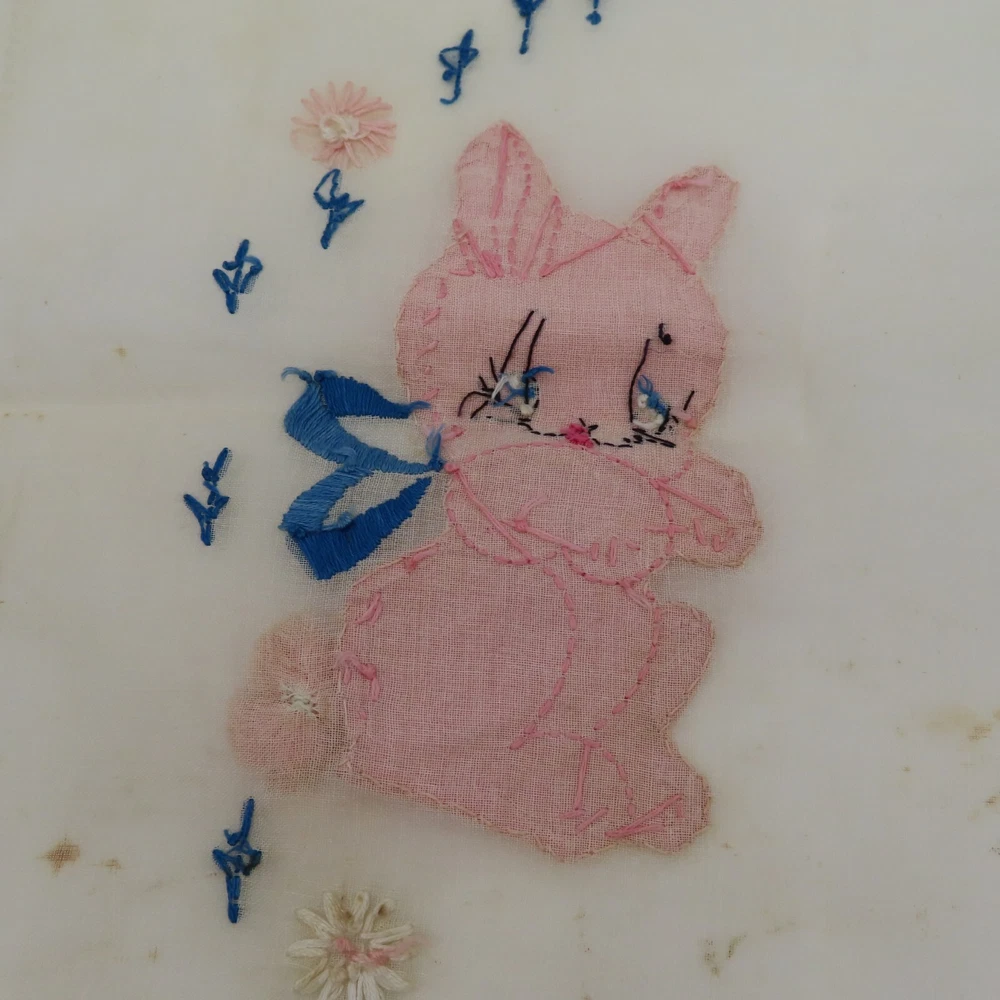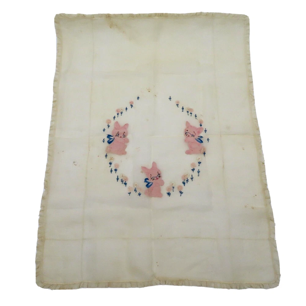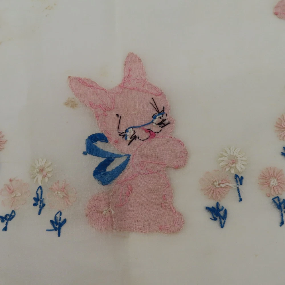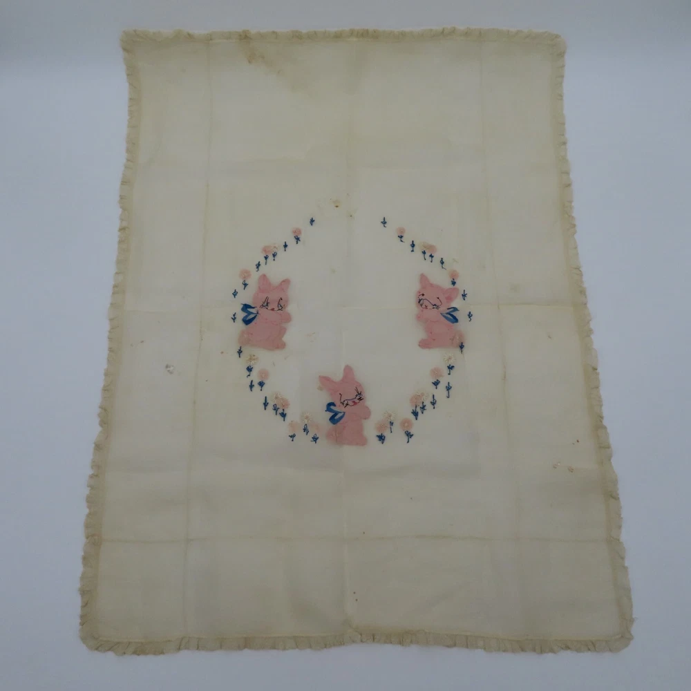 Antique hand embroidered linen piece Features bunny rabbits and flowers 28.5" x 37.5" **measurements are approximate, taken with item laying flat Condition: used, surface wear/holes and stains- see photos, smoke free home Please review all photos closely as these will be the best description of the item. Thank you for shopping!