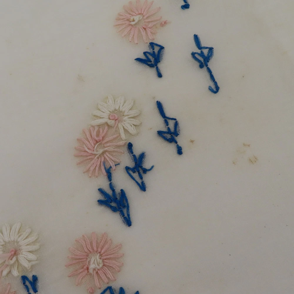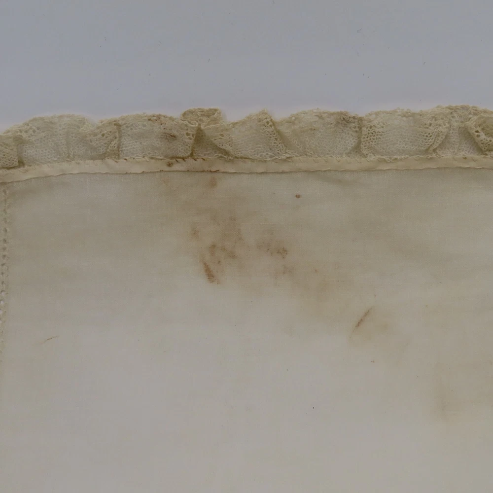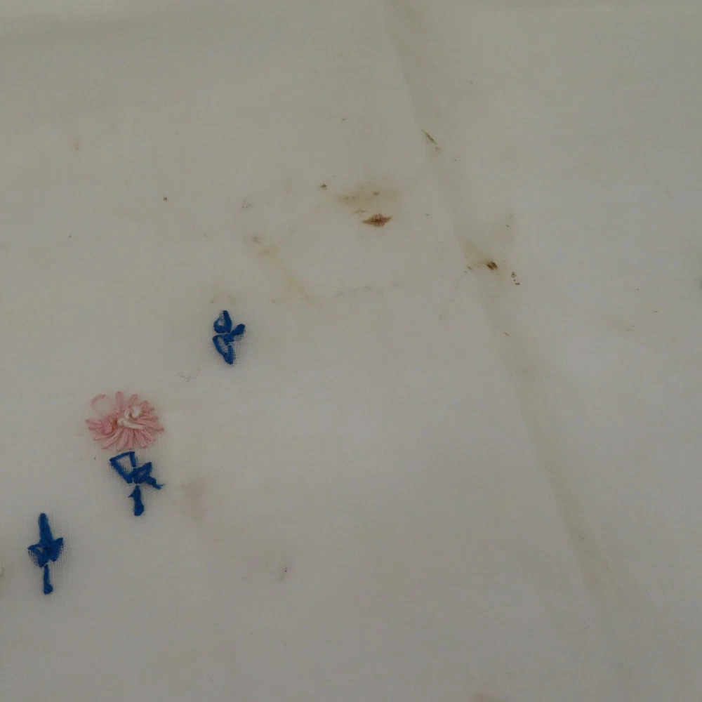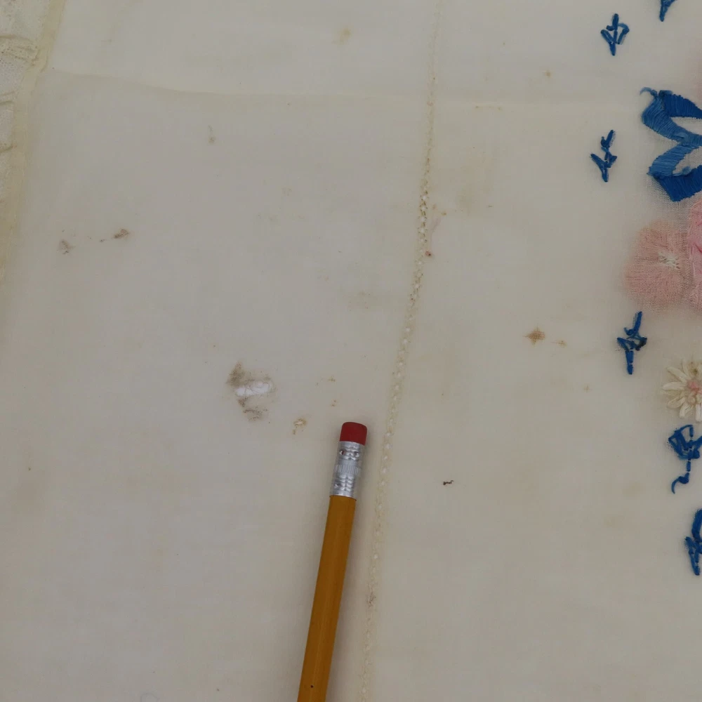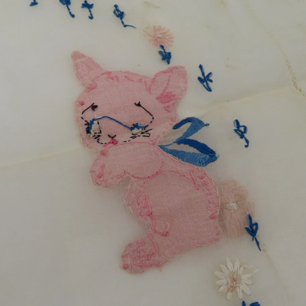 Antique hand embroidered linen piece Features bunny rabbits and flowers 28.5" x 37.5" **measurements are approximate, taken with item laying flat Condition: used, surface wear/holes and stains- see photos, smoke free home Please review all photos closely as these will be the best description of the item. Thank you for shopping!