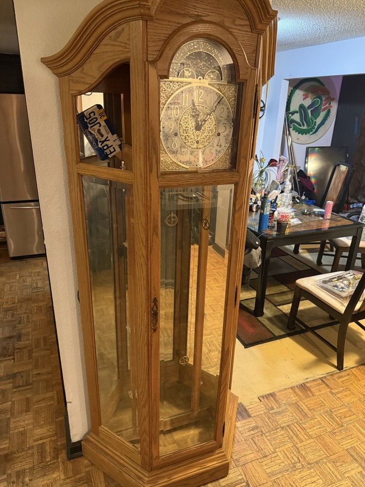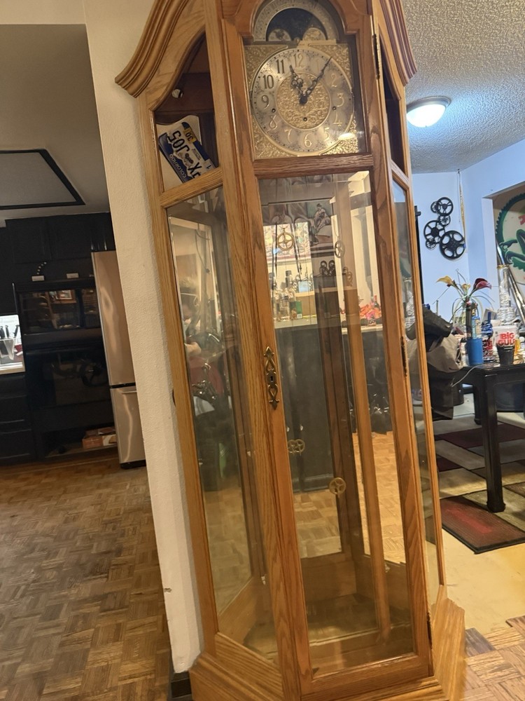 This stunning antique grandfather clock adds timeless elegance to any room. The rich wood finish and intricate craftsmanship make it a true showpiece. The soothing chime keeps perfect time while creating a warm, classic ambiance. It’s not just a clock—it’s a beautiful heirloom that becomes the centerpiece of your home. Absolutely love it!