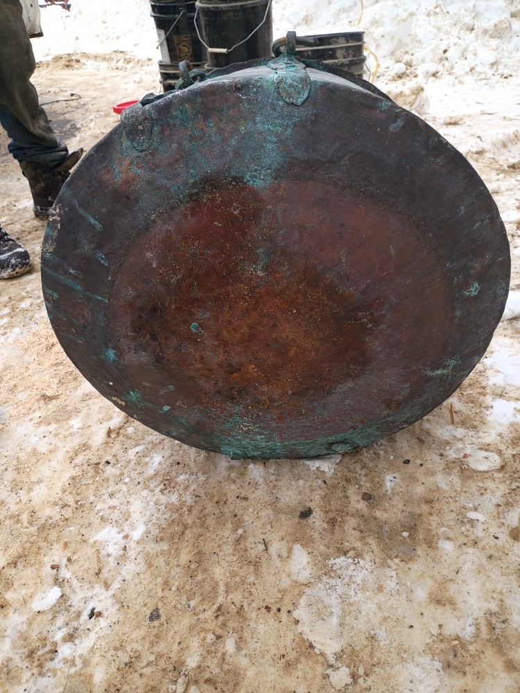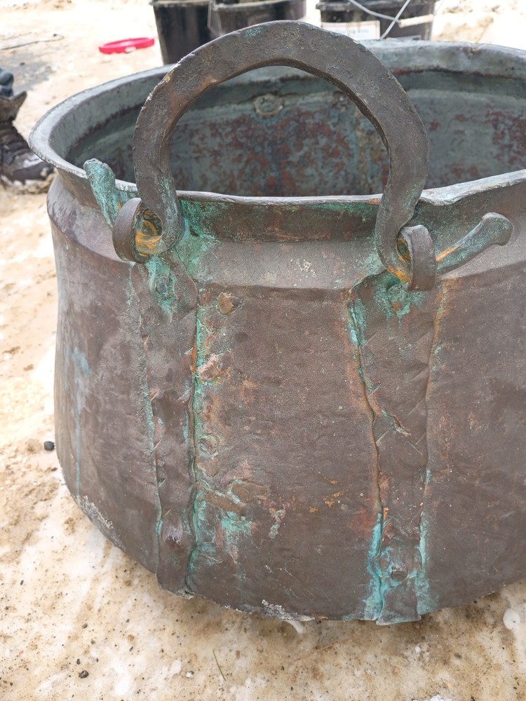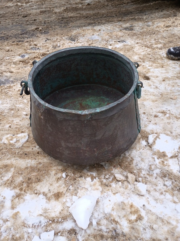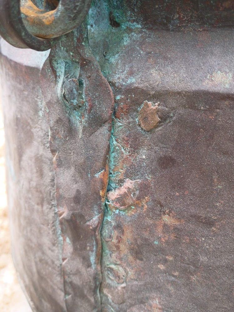 This antique handmade large copper pot with handles and patina is a unique and collectible piece that exudes craftsmanship and history. The rich patina on the copper surface adds a touch of vintage charm to any kitchen or collector's display. With its authentic handmade quality and traditional design, this pot is a one-of-a-kind treasure that would make a special addition to any home or collection. note small hole on bottom of cauldron.
