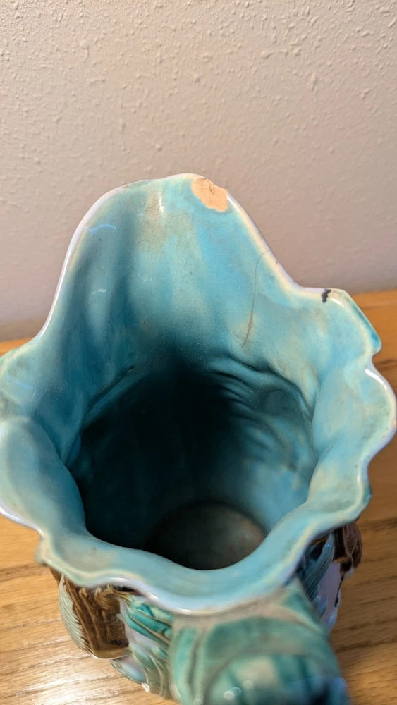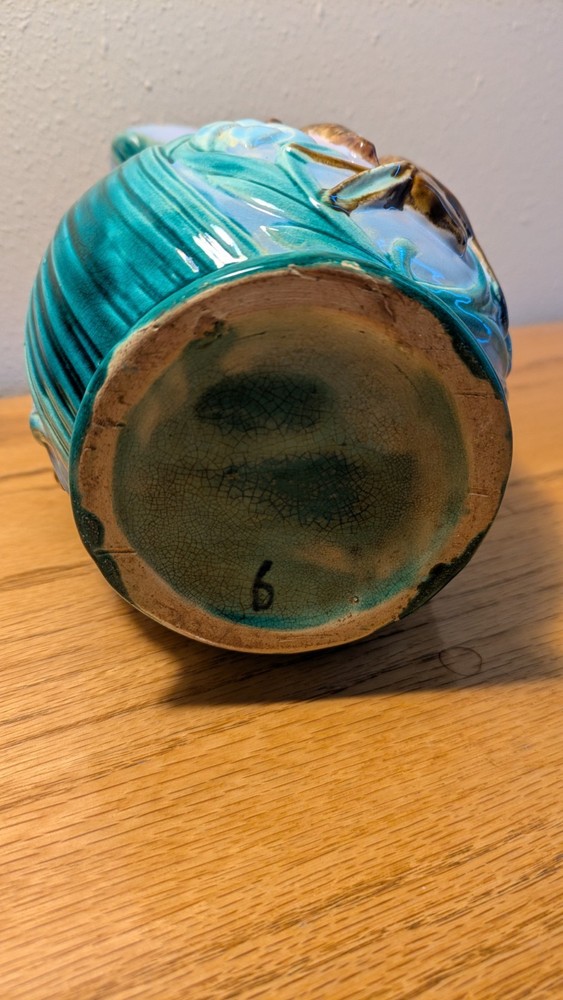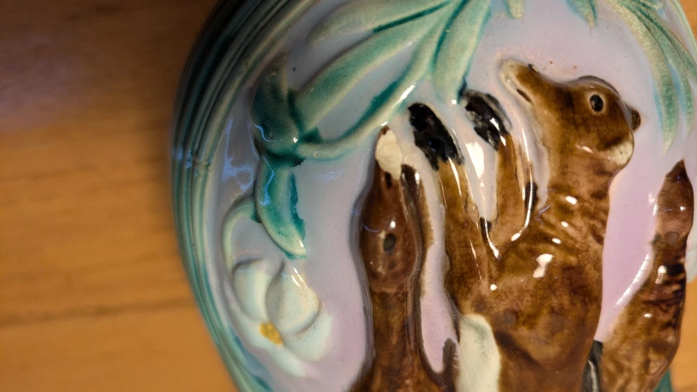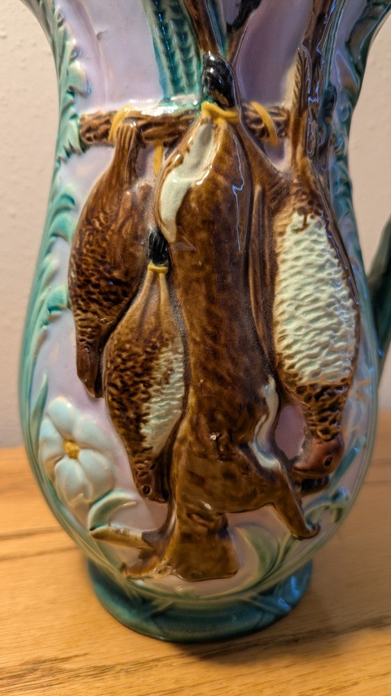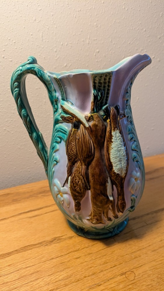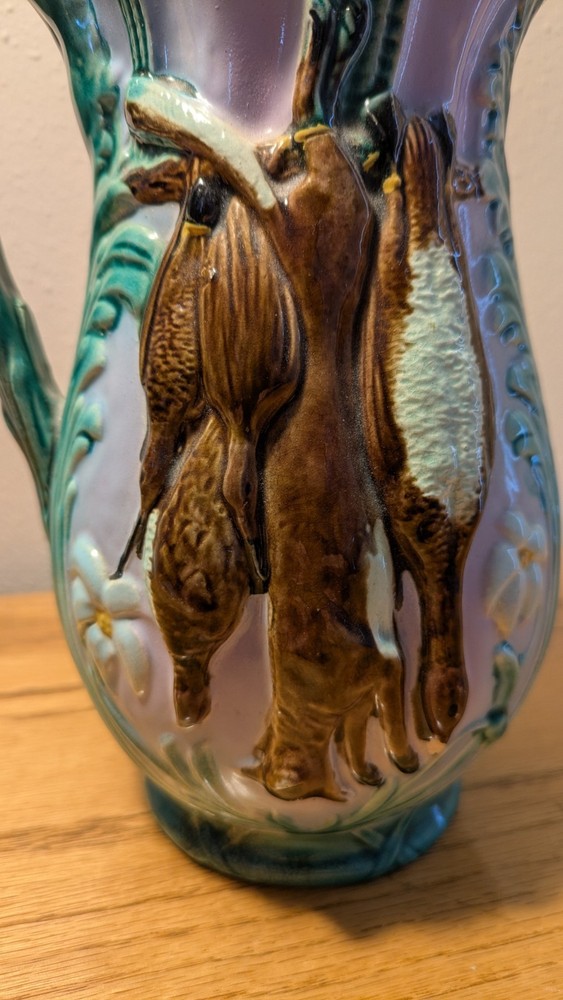 Beautiful Joseph Holdcroft pitcher made circa 1870, featuring game on both sides, along with ferns or leaves as further decoration. Rabbit and gamebirds are on one side, fox with gamebirds on the other. The number 6 or 9 is handwritten on the bottom, which measures 3" across. There are two chips - one on the spout and another at the bottom of a gamebirds. See photos.
