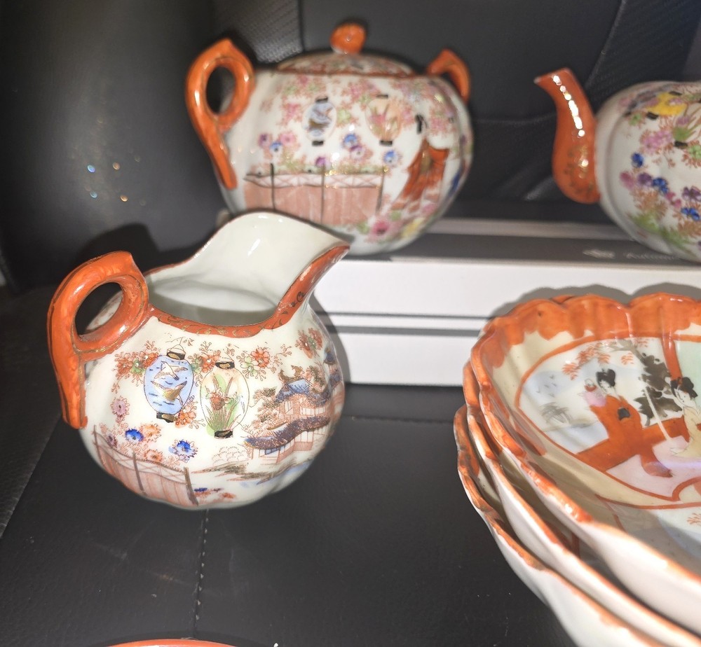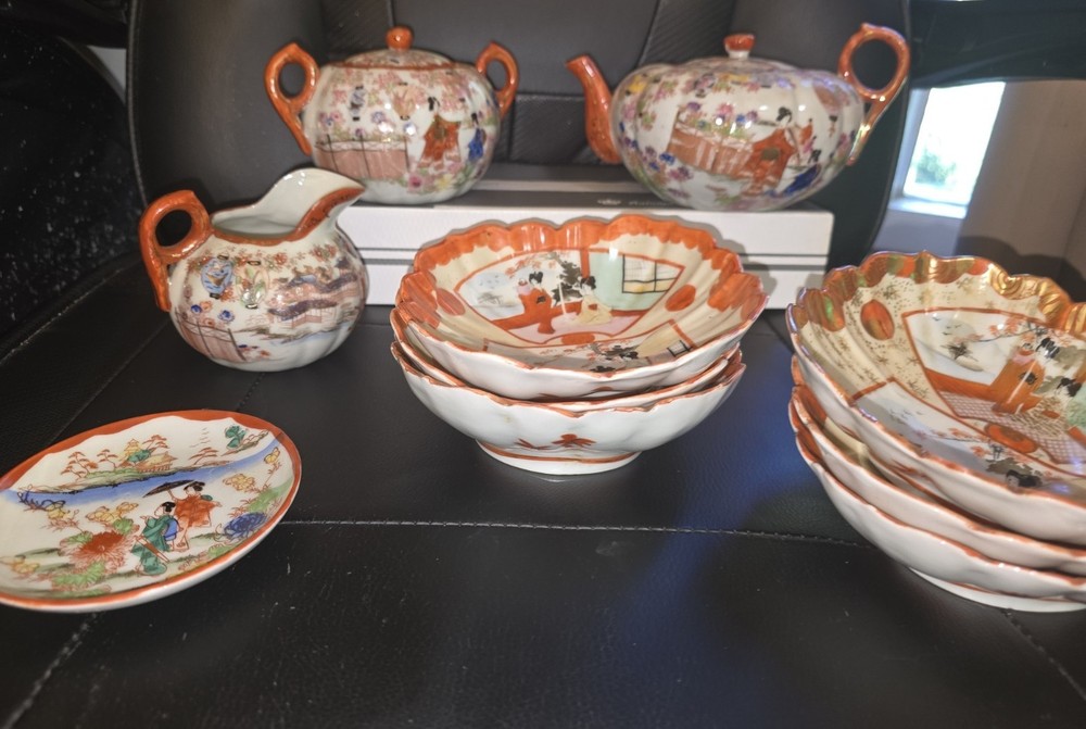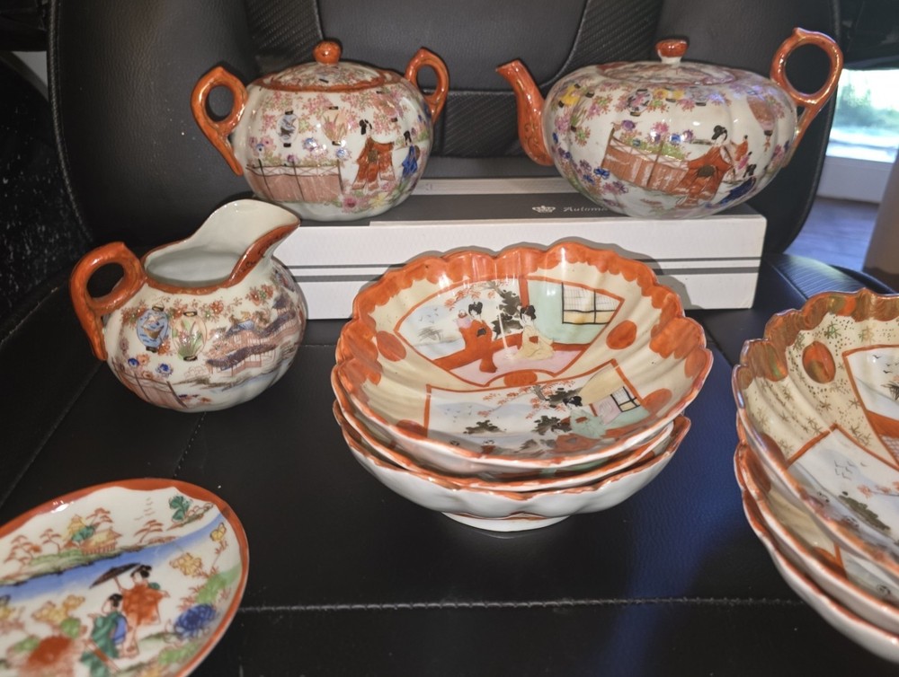 Exquisite Antique Japanese Kutani Tea Set – Hand-Painted Porcelain with Gilded Detail Beautifully hand-decorated in vivid shades of orange, gold, and multi-color enamel, this vintage Kutani-style Japanese porcelain tea set features traditional Geisha and garden scenes framed by gold and red patterns. The intricate scalloped bowls, ornate teapots, and hand-applied gilt accents reflect the artistry typical of mid-20th-century Kutani or Satsuma porcelain from Japan. ✦ Included in this set: • (2) Hand-painted teapots with matching lids • (1) Creamer / milk pitcher • (1) Small saucer plate (decorative or serving) • (6) Scalloped dessert / rice bowls (hand-painted with interior scene and gold detailing) ✦ Features & Details: • Origin: Japan (red hand-marked base) • Hand-painted scenes: Courtyard Geisha, floral, and landscape motifs • Material: Fine porcelain with enamel and gold trim • Colors: Burnt orange, gold, pastel greens, and black outlines • Finish: High-gloss glaze with textured gilt accents • Approximate era: 1930s–1950s (Taisho–Showa period) ✦ Condition: Excellent vintage condition overall – minimal paint wear or fading. No visible chips or cracks on major pieces. Teapots and creamer handles intact. Gold accents retain beautiful luster. Light age toning typical of hand-painted Kutani ware. ✦ Collector’s Value: Kutani porcelain is prized for its hand-painted artistry and symbolic depictions of Japanese life. Similar sets often retail well with collectors and interior designers seeking authentic Japanese decor or unique tableware. ✦ Display or Gift Idea: Perfect as a display centerpiece, heirloom collection addition, or an unforgettable vintage gift for lovers of Asian art and culture. Ships securely packaged with each piece individually wrapped for protection.