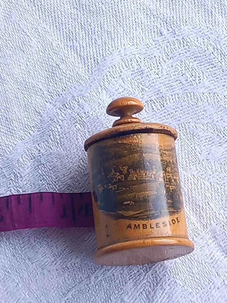 Antique Mauchline ware wooden tape measure with view of Ambleside . It still has original tape but the end is missing,and it winds up The wood is in good condition,it is 4cms tall