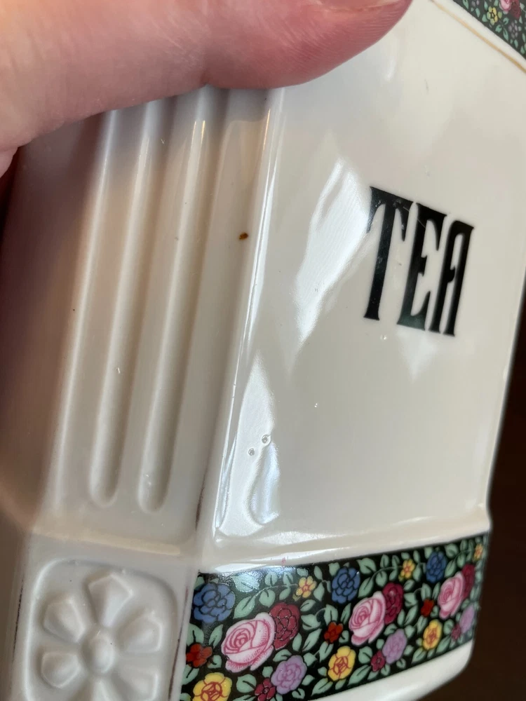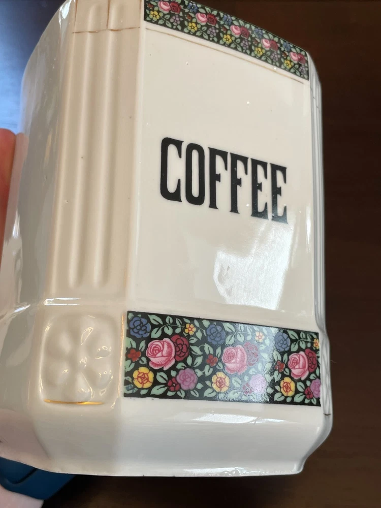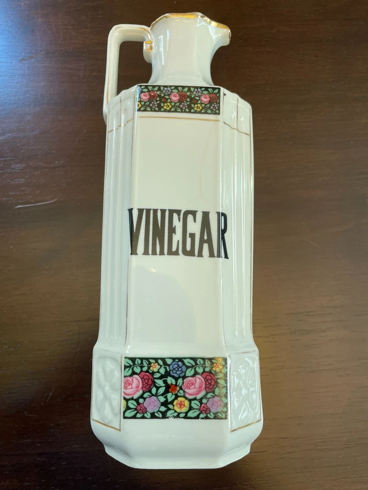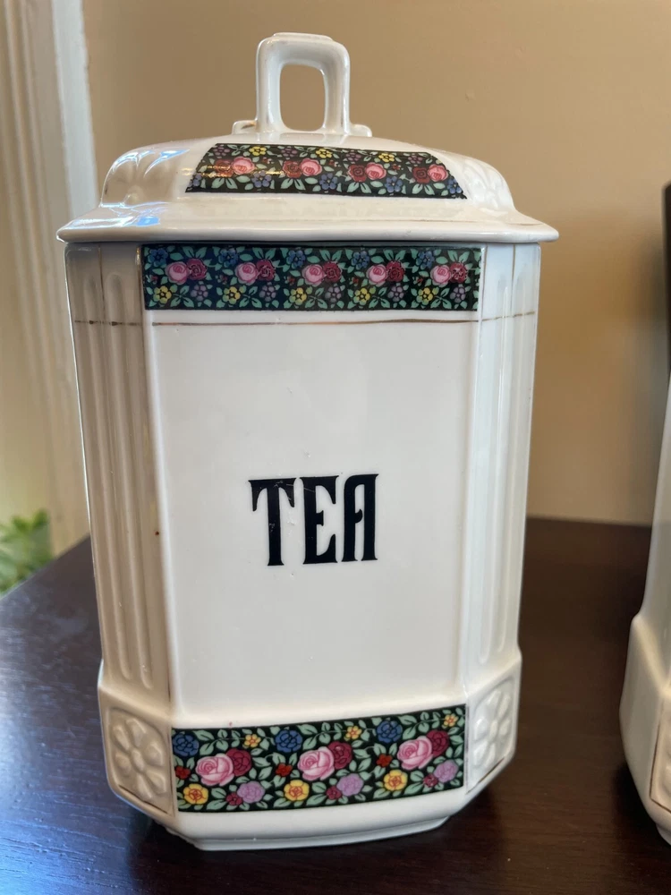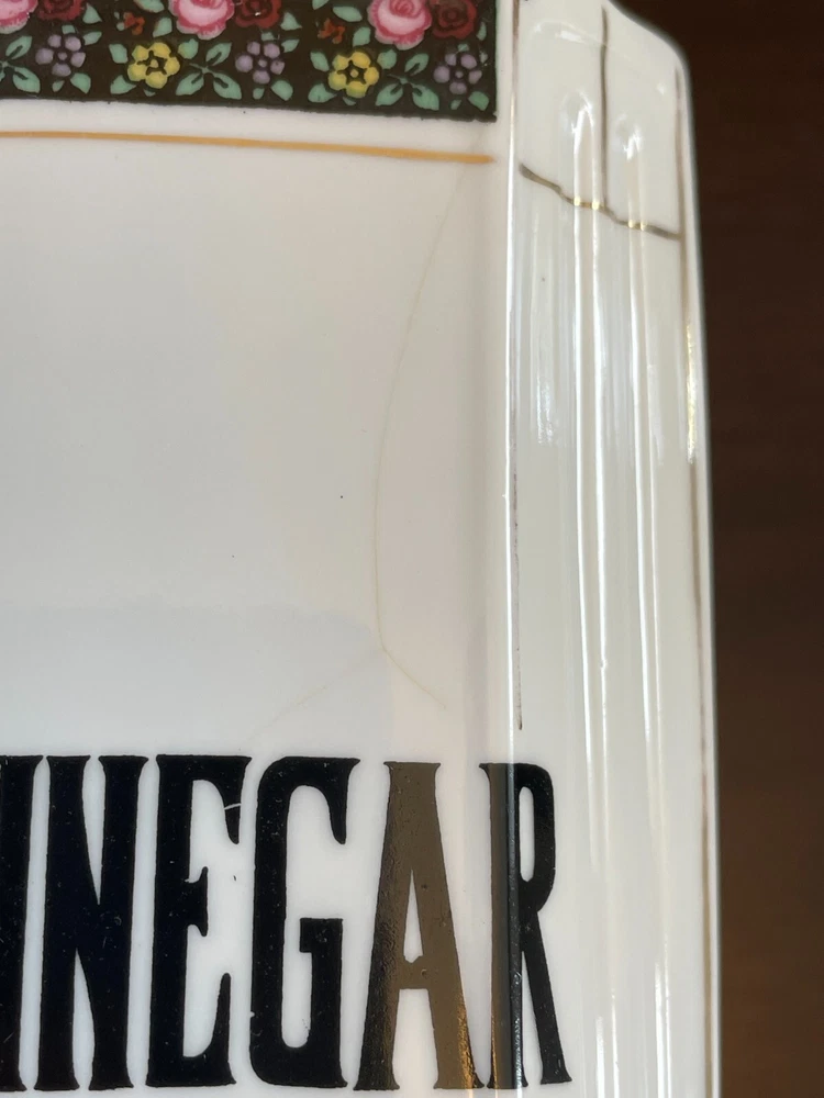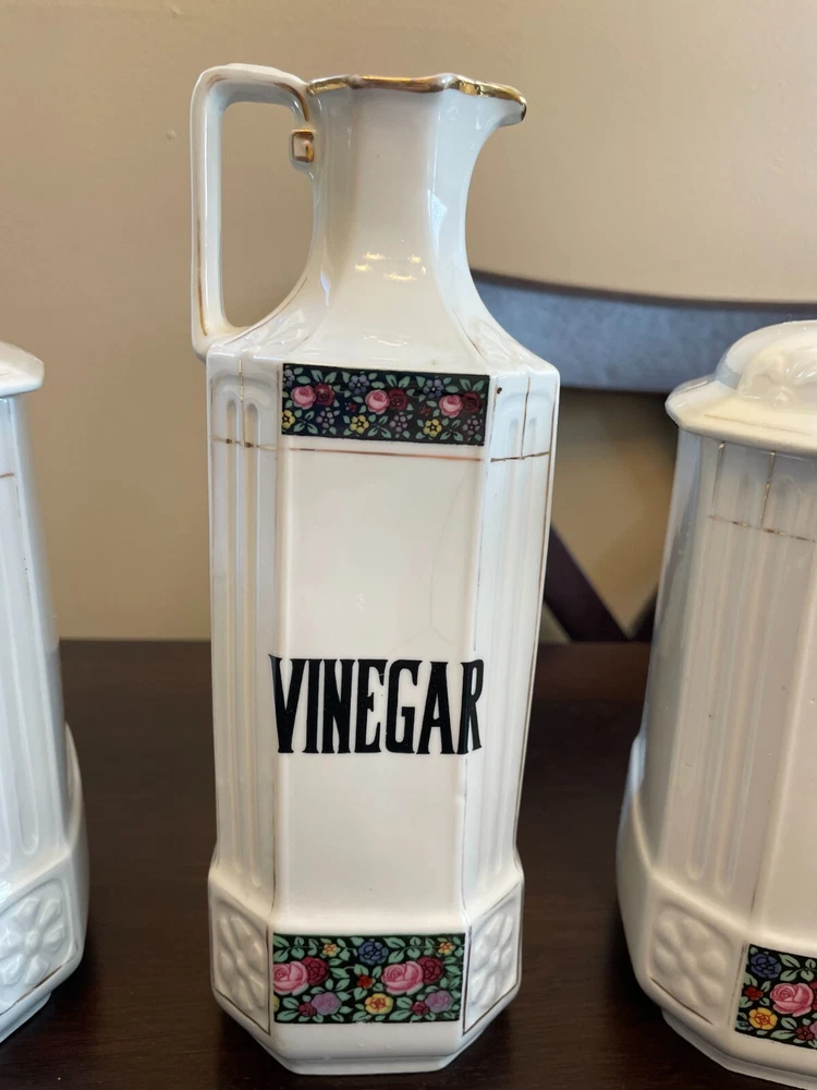 Good vintage condition. The coffee and tea jars are in very good shape. No cracks or issues with them. The vinegar jar is missing the stopper, and the rim has a large chip on the edge. There is also a faint cracking on the front. Please view photos for close ups of issues. Set is being sold as is, no refunds on these items. **Every item is examined thoroughly and description is to the best of ability. Unless grossly mis-represented, all items are sold in as is condition. All found defects will be noted in the listing and in photos to the best of my ability. Some items may have residual odors from closets, attics, etc. I will try my best to note any items that have an odor, but every persons sense of smell may be different. If you need additional size measurements, I will be happy to provide before purchase. Please ask any questions before bidding or purchasing, and ensure you are ok with my no return/refund policy. Will combine shipping. Thank you for viewing!