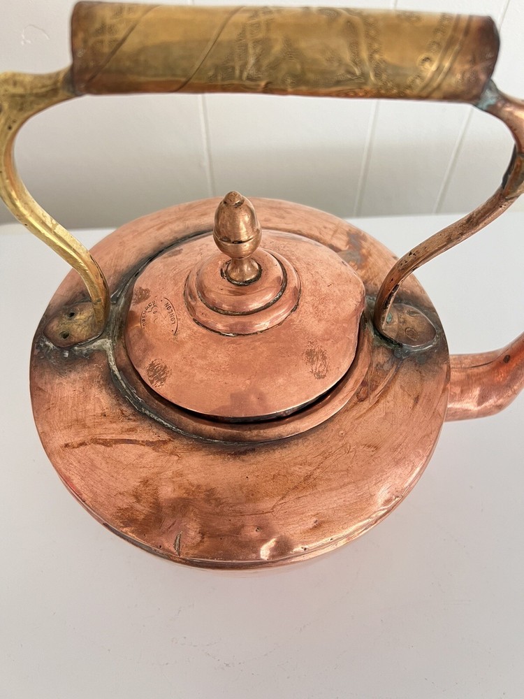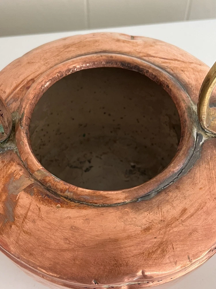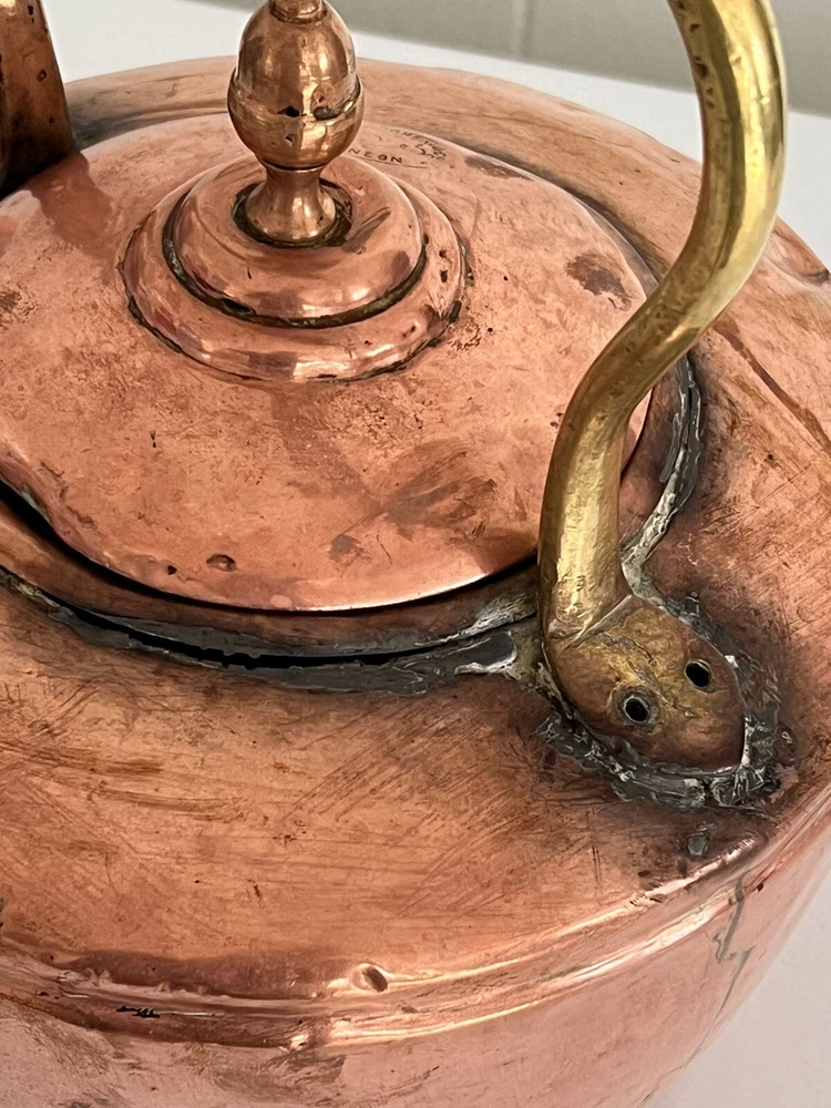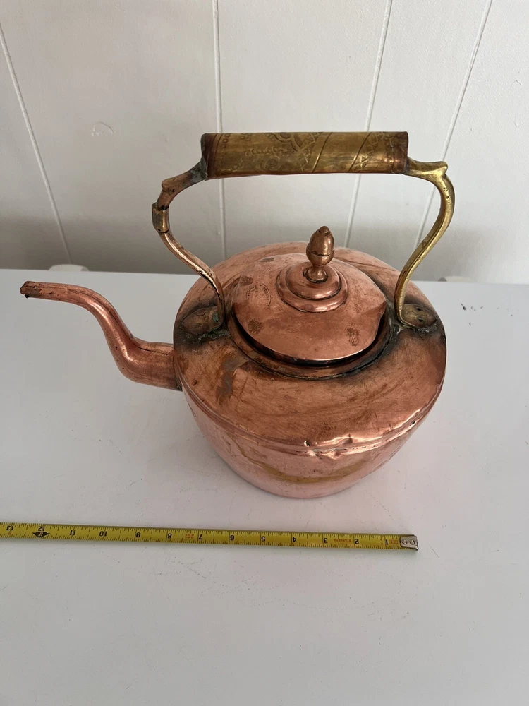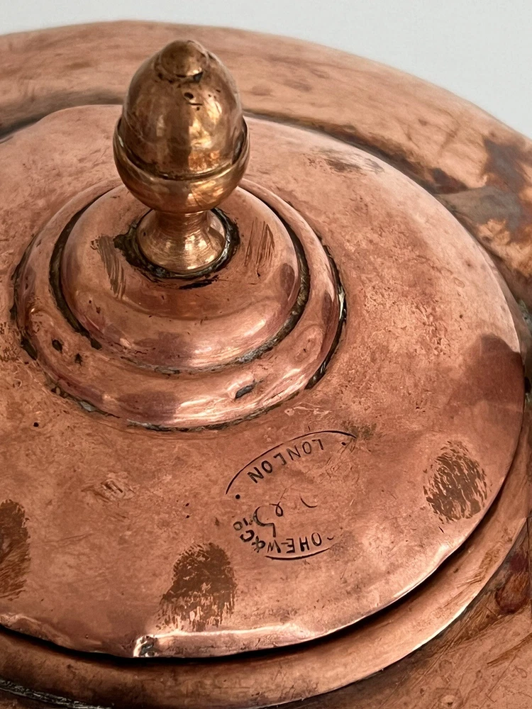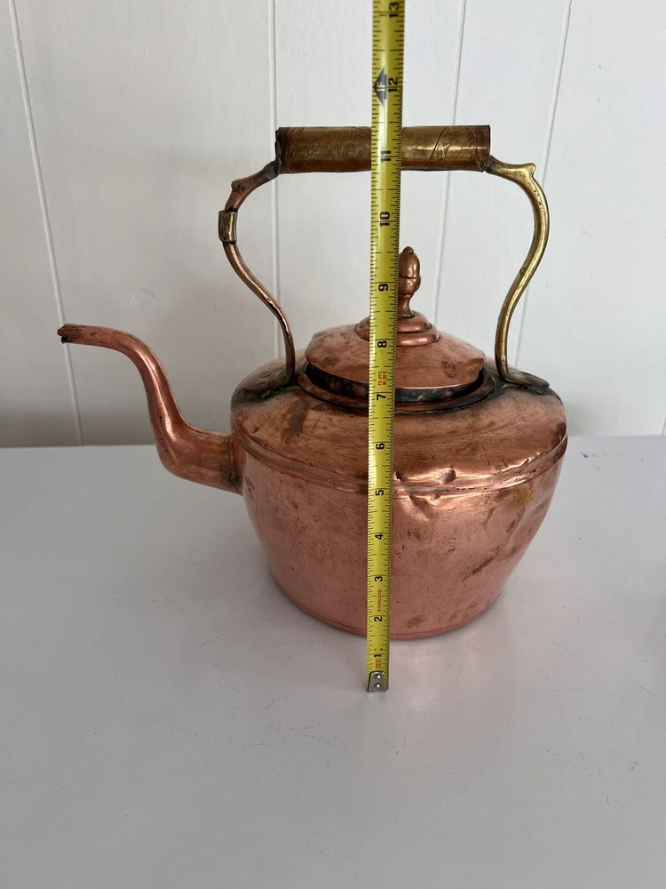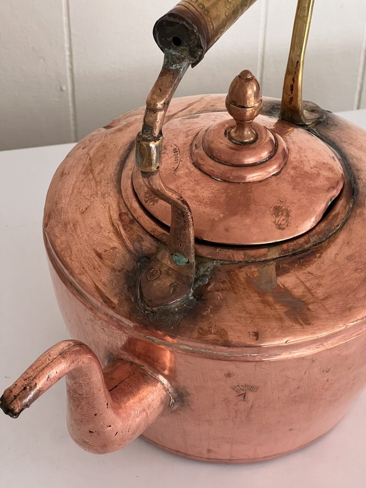 Maurice Cohen kettle in good condition with expected signs of age/use related wear. A large, antique copper kettle with a swan spout and acorn finial lid, the kettle dates back between 1850-1900's, manufactured in London by Maurice Cohen & Co. Measurements: height 12 Inch, diameter 8.5" weighs 4 Lb. Please see images for details. Antique 1800s Gooseneck Copper Tea Kettle made by Maurice Cohen & Co London England Preowned with normal wear consistent with age. Gorgeous natural patina, It has been cleaned or polished. Showing some dings and dents, verdigris and tarnish. Please see Photos with Yellow Markers .Good Antique condition !! Top ring starts coming off as showing in the photos. Just needs to be professionally fixed ( glue.. ect ) Please look at all pictures carefully before purchasing. Please message me if you have any questions.