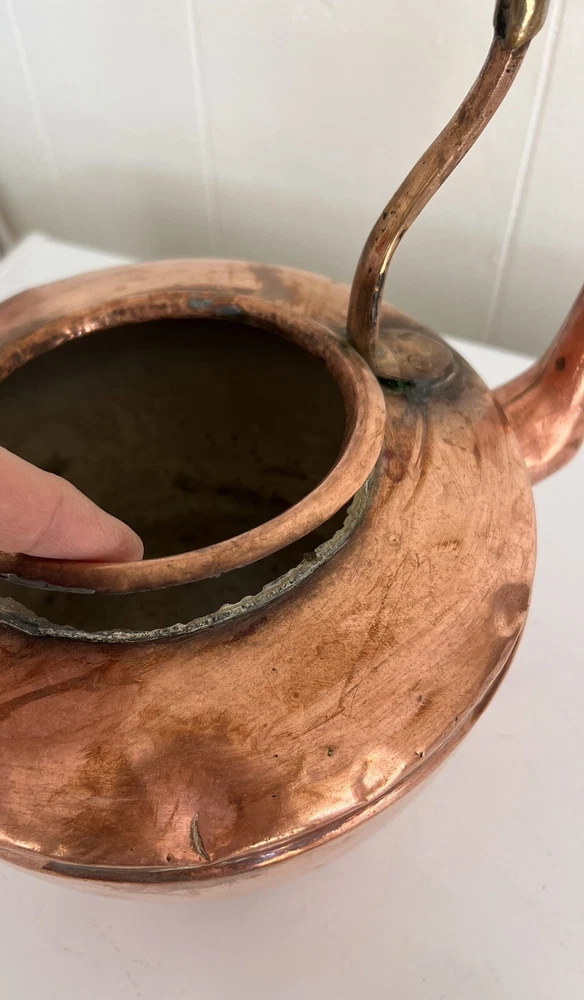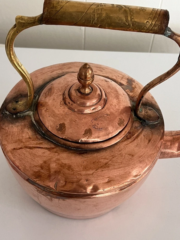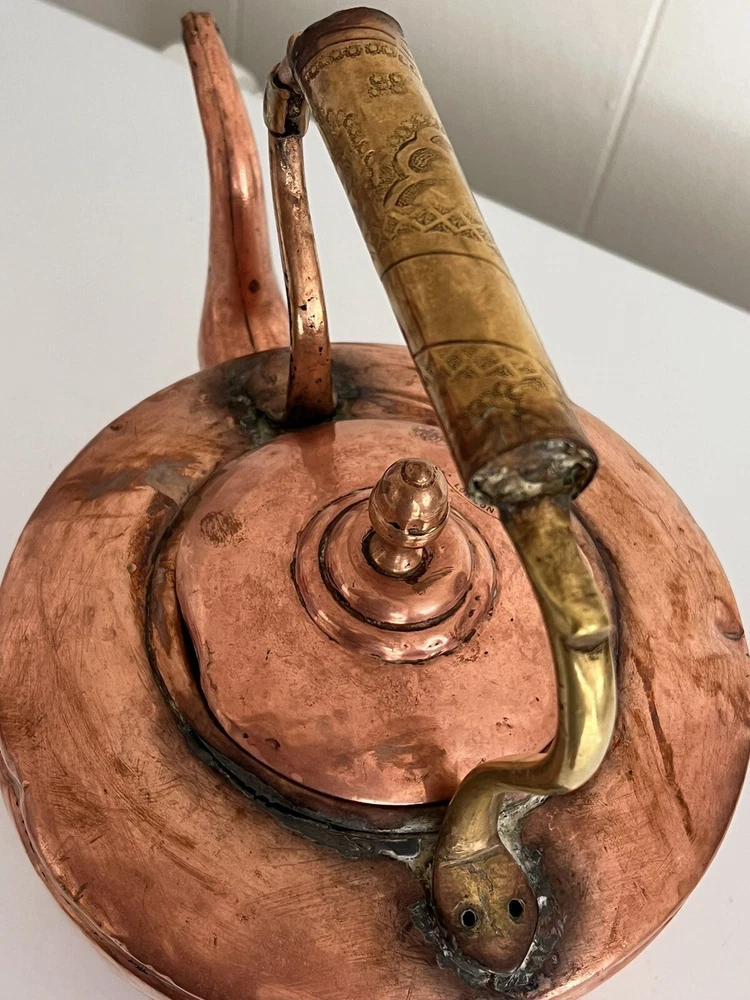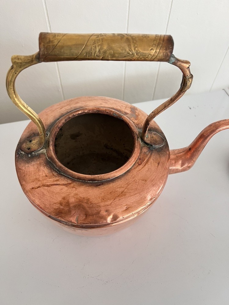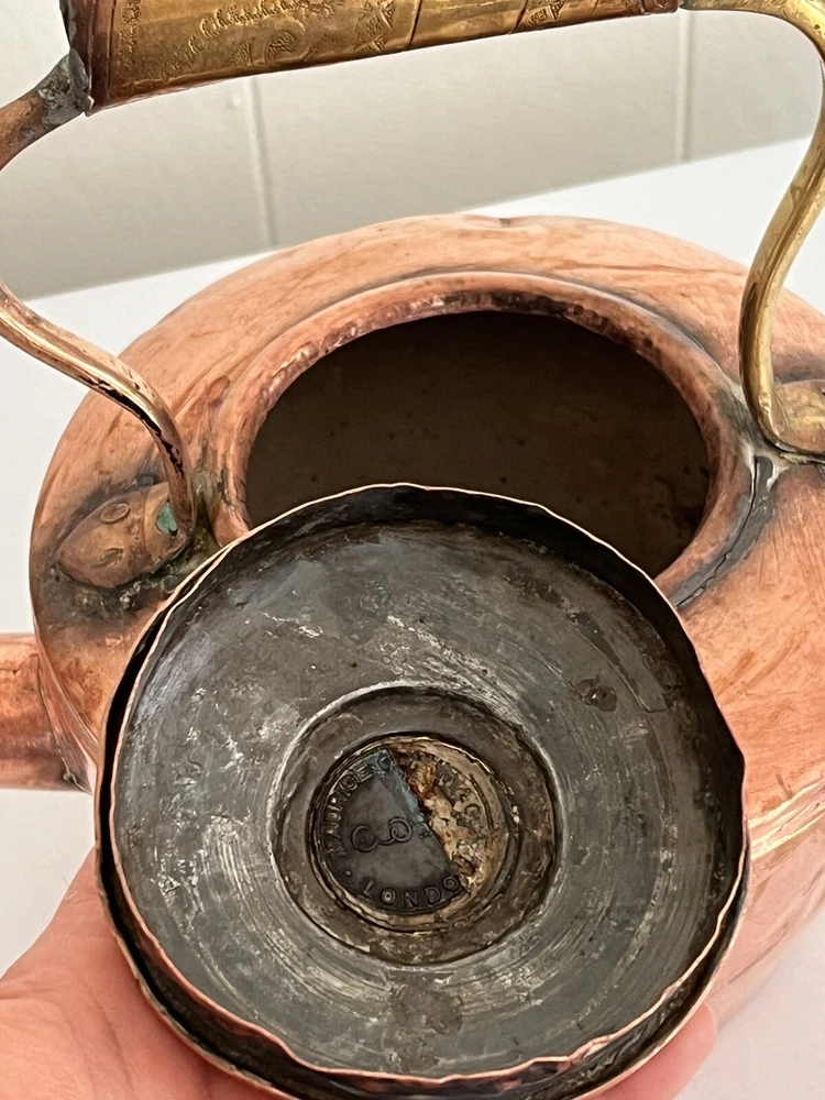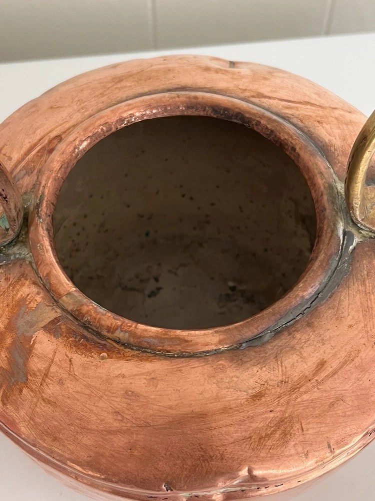 Maurice Cohen kettle in good condition with expected signs of age/use related wear. A large, antique copper kettle with a swan spout and acorn finial lid, the kettle dates back between 1850-1900's, manufactured in London by Maurice Cohen & Co. Measurements: height 12 Inch, diameter 8.5" weighs 4 Lb. Please see images for details. Antique 1800s Gooseneck Copper Tea Kettle made by Maurice Cohen & Co London England Preowned with normal wear consistent with age. Gorgeous natural patina, It has been cleaned or polished. Showing some dings and dents, verdigris and tarnish. Please see Photos with Yellow Markers .Good Antique condition !! Top ring starts coming off as showing in the photos. Just needs to be professionally fixed ( glue.. ect ) Please look at all pictures carefully before purchasing. Please message me if you have any questions.