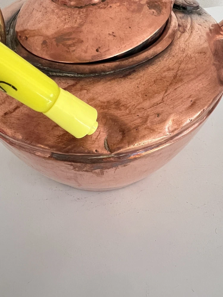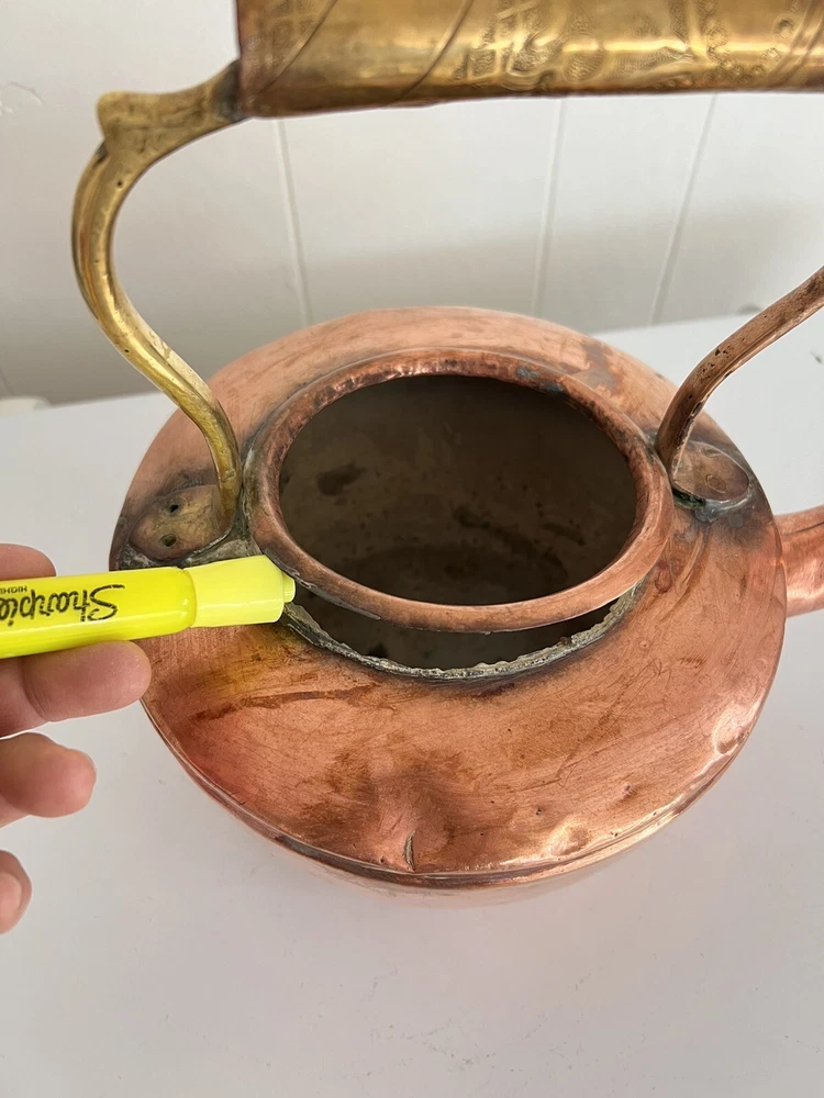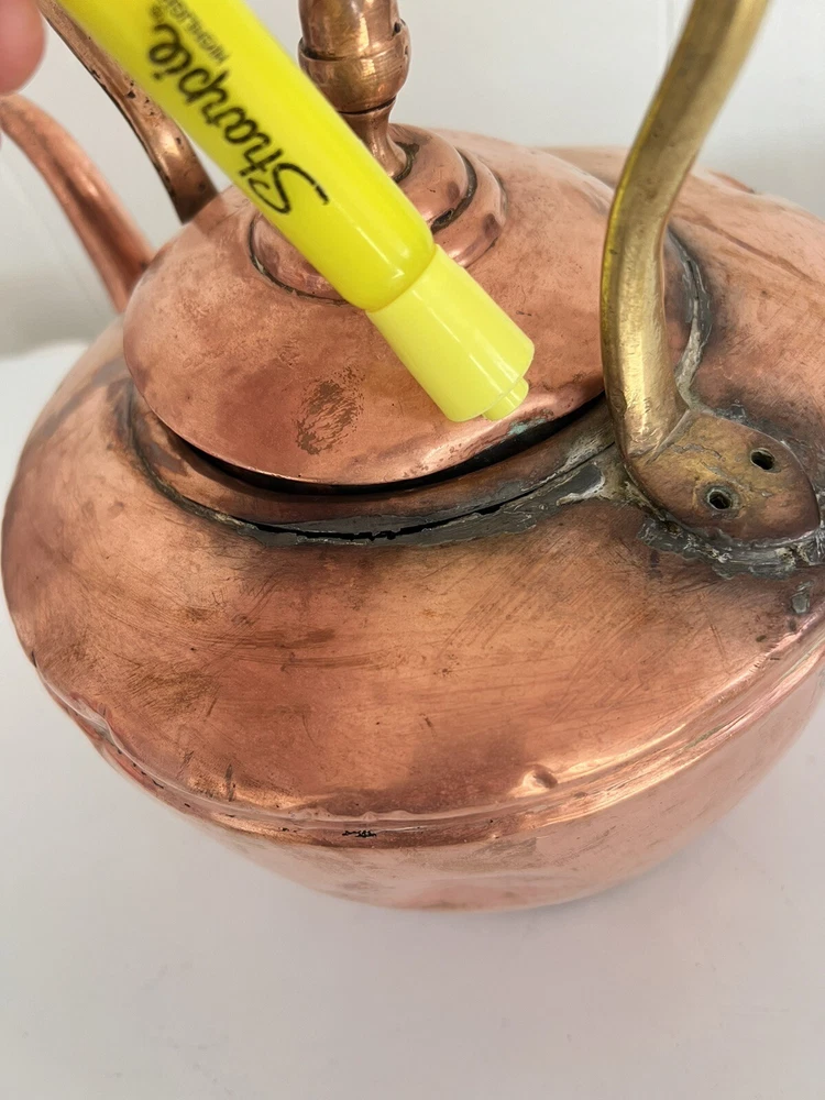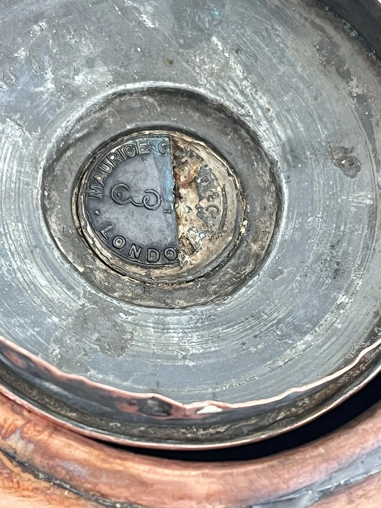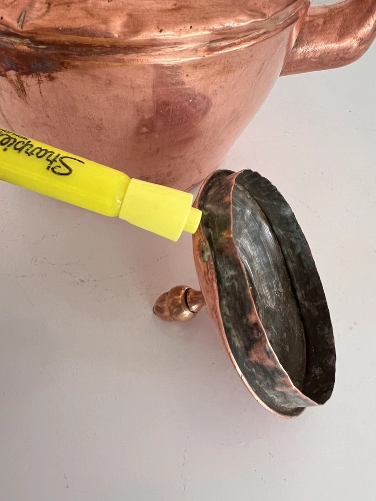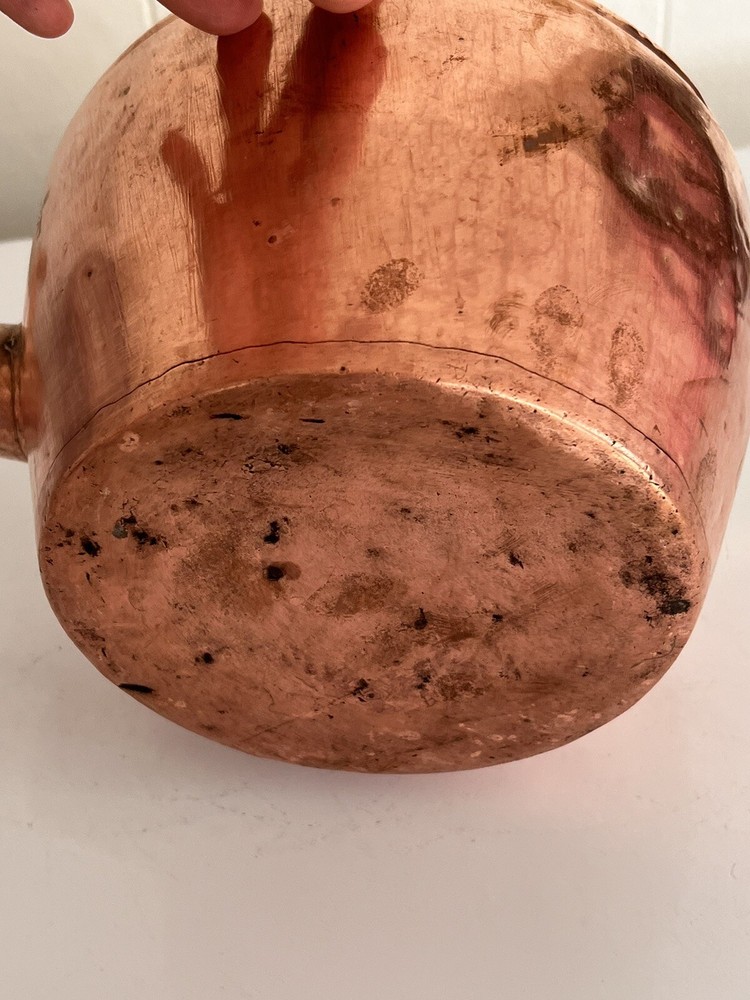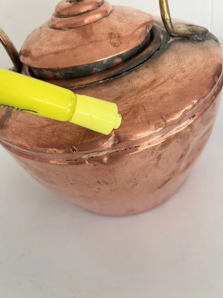 Maurice Cohen kettle in good condition with expected signs of age/use related wear. A large, antique copper kettle with a swan spout and acorn finial lid, the kettle dates back between 1850-1900's, manufactured in London by Maurice Cohen & Co. Measurements: height 12 Inch, diameter 8.5" weighs 4 Lb. Please see images for details. Antique 1800s Gooseneck Copper Tea Kettle made by Maurice Cohen & Co London England Preowned with normal wear consistent with age. Gorgeous natural patina, It has been cleaned or polished. Showing some dings and dents, verdigris and tarnish. Please see Photos with Yellow Markers .Good Antique condition !! Top ring starts coming off as showing in the photos. Just needs to be professionally fixed ( glue.. ect ) Please look at all pictures carefully before purchasing. Please message me if you have any questions.