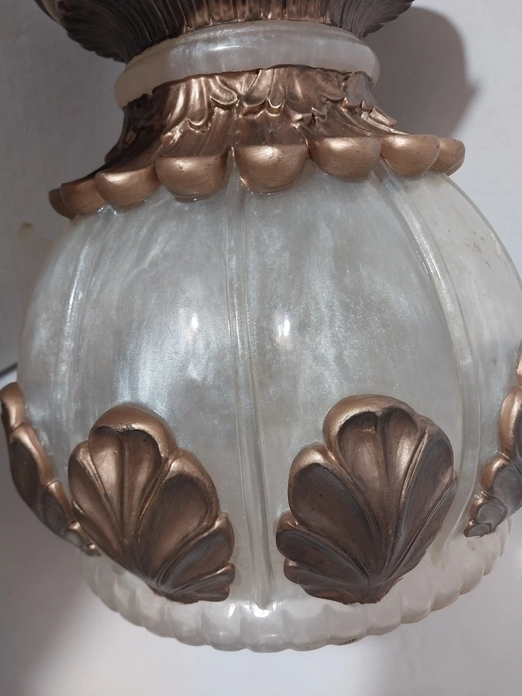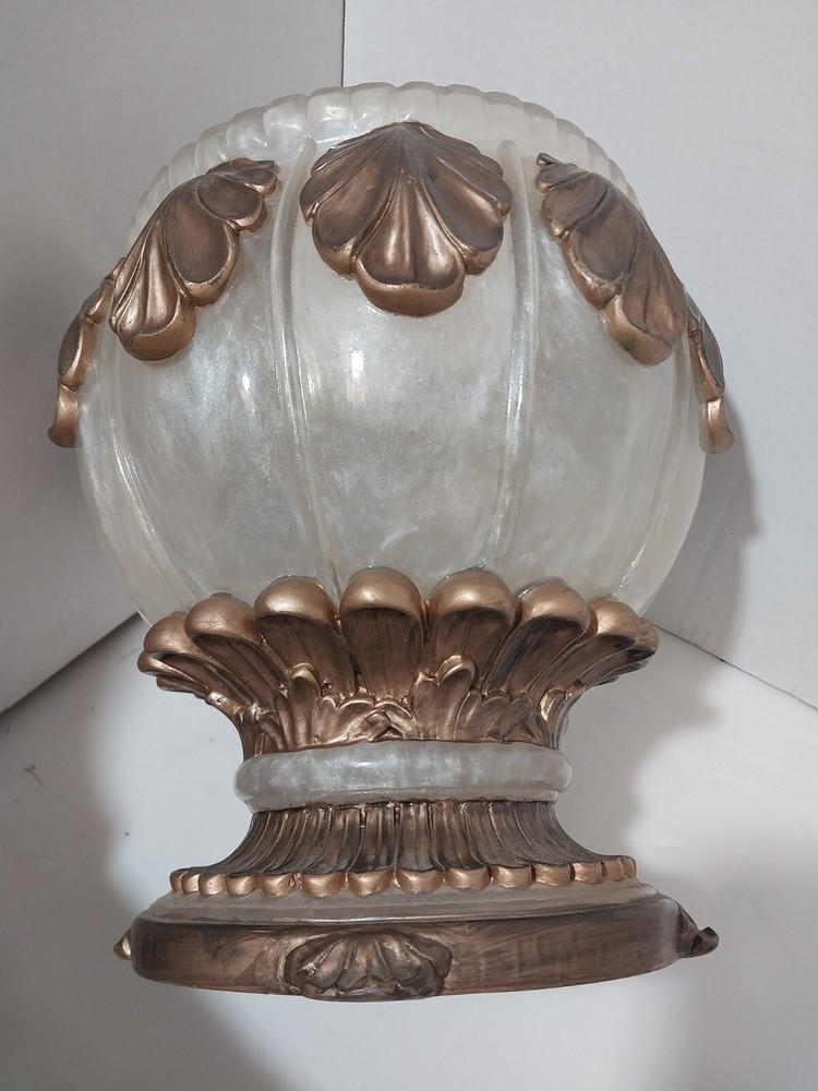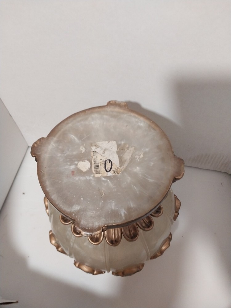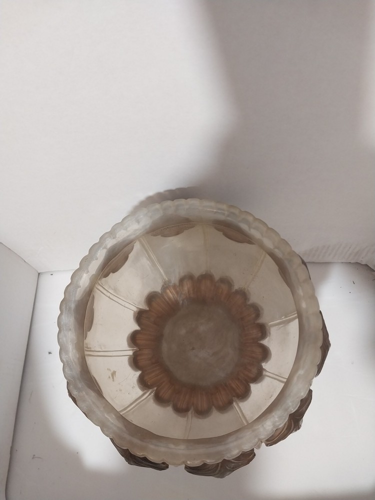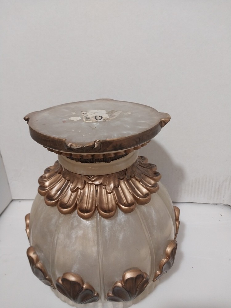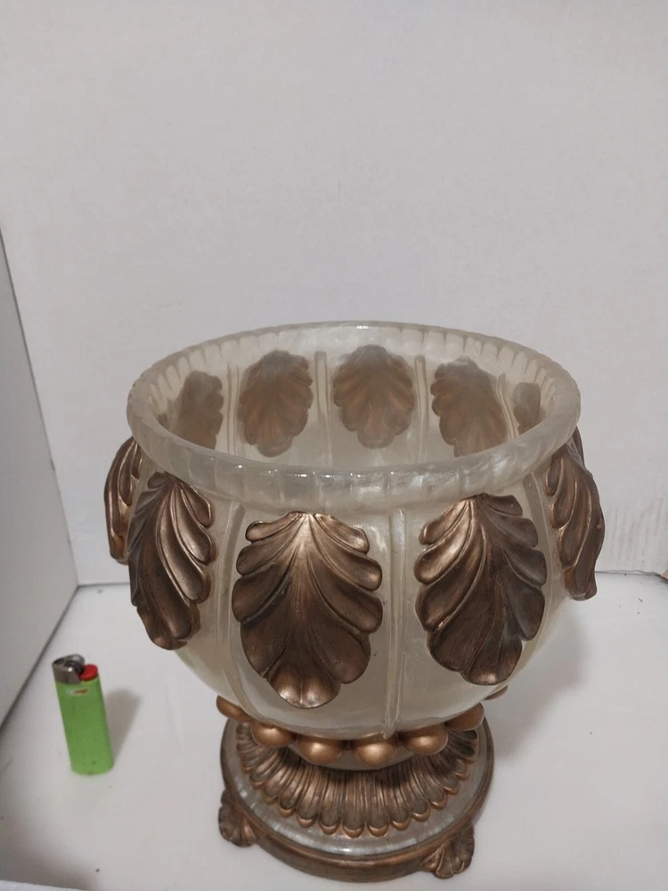 This antique item is a mounted bowl made of bronze with decorative leaves. It is placed on a pedestal stand, giving it an elegant and classic look. The material of the bowl is either acrylic or glass, enhancing its appeal. The design features intricate detailing and a timeless style reminiscent of antique decor.