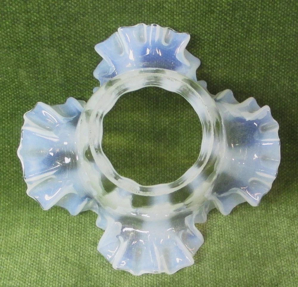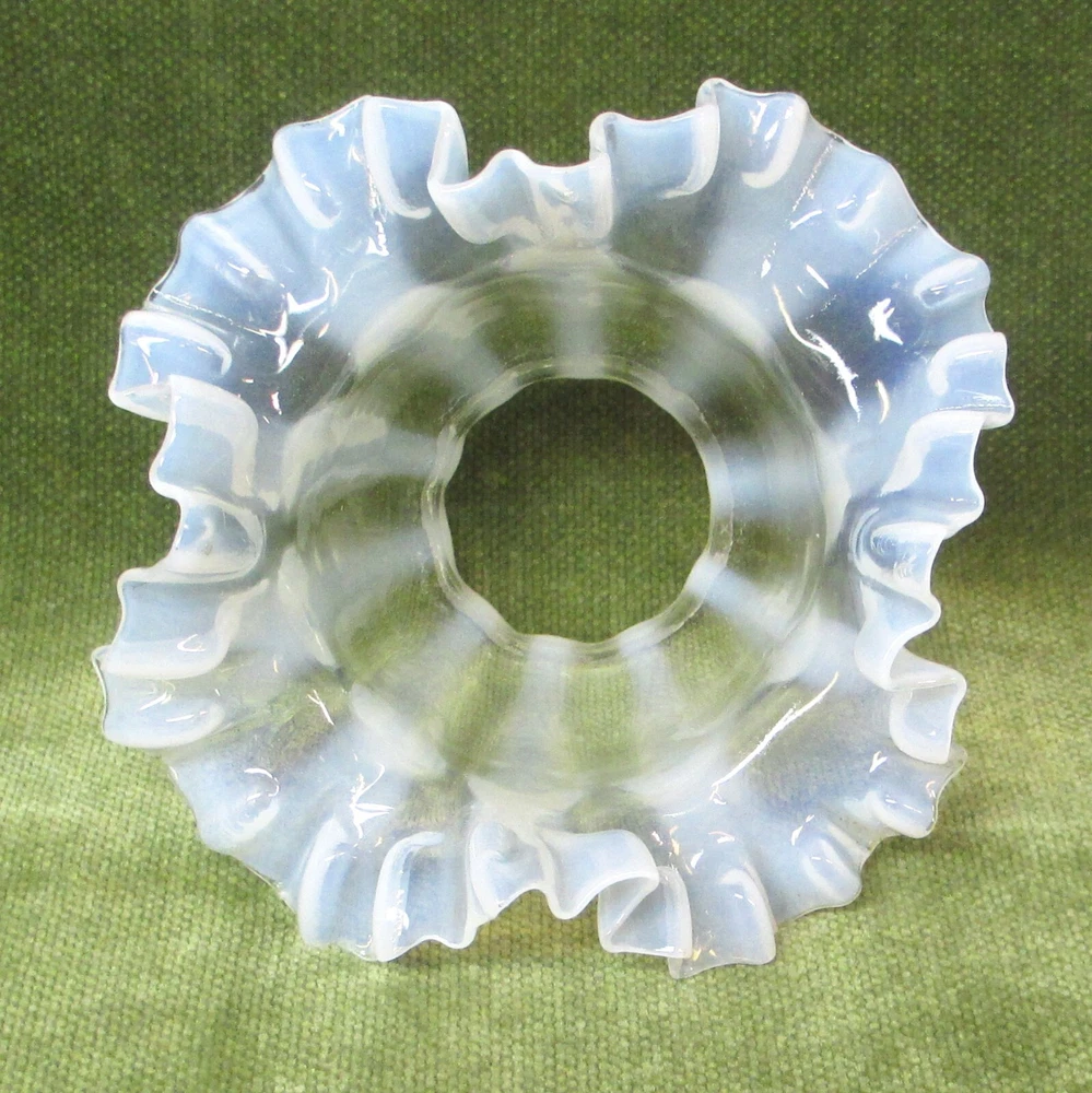 Add a touch of historical elegance to your lighting with this Antique Opalescent Ruffled Stripe Glass Shade. With its timeless Victorian style and classic bell shape, this piece is a testament to the craftsmanship of the late 19th century. The opalescent glass diffuses light beautifully, providing a warm, inviting glow in any setting. The lamp shade features a distinctive striped pattern that is sure to catch the eye, while its 2-1/4" fitter diameter makes it compatible with a variety of ceiling lamps, ceiling fans, and hanging lamps or accent lamp. Whether you're restoring a vintage home or simply appreciate the charm of bygone eras, this original piece is an exquisite addition to any decor. Overall 5-1/2" diameter x 4" tall. No chips or cracks.