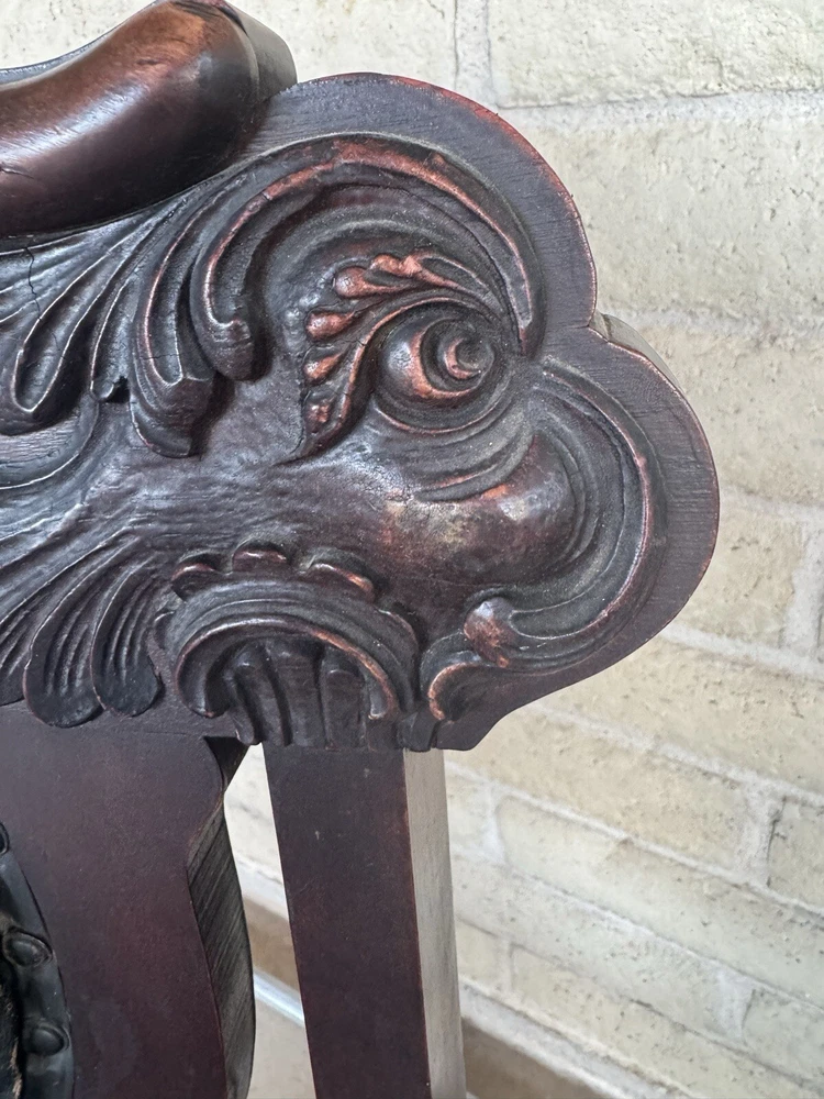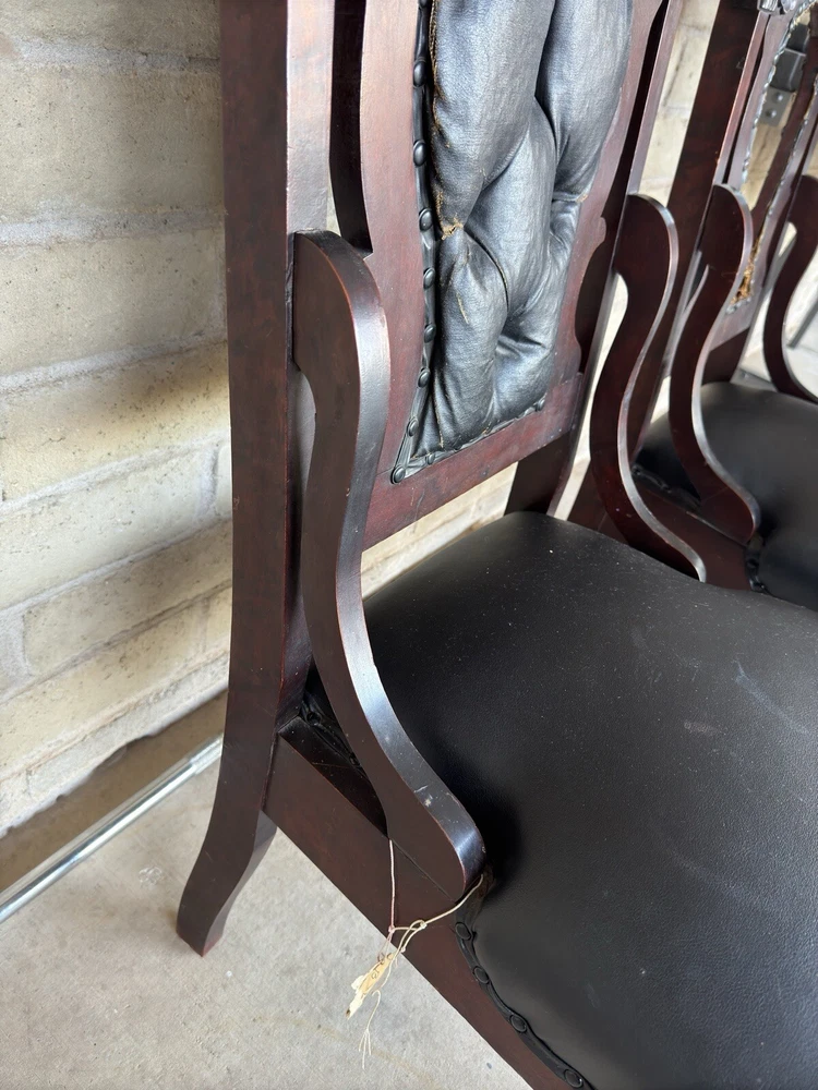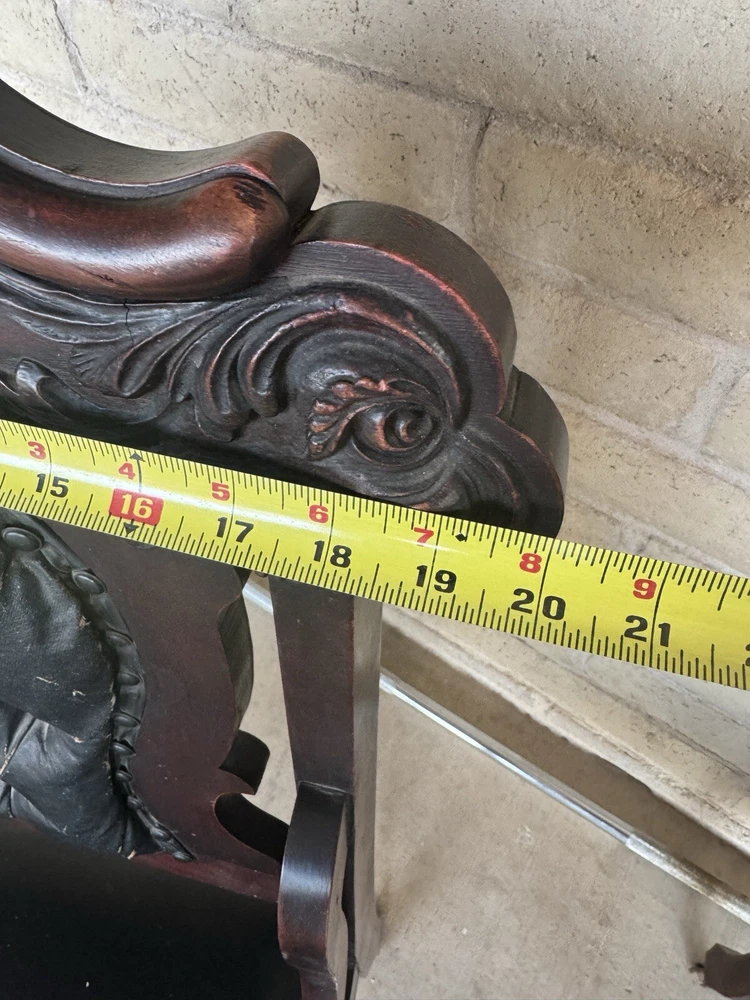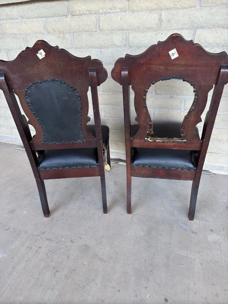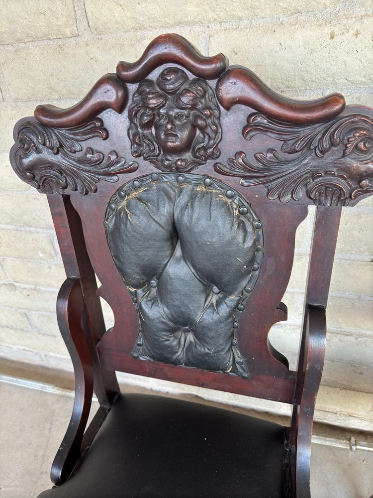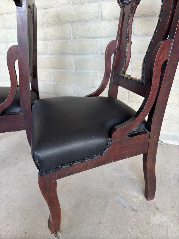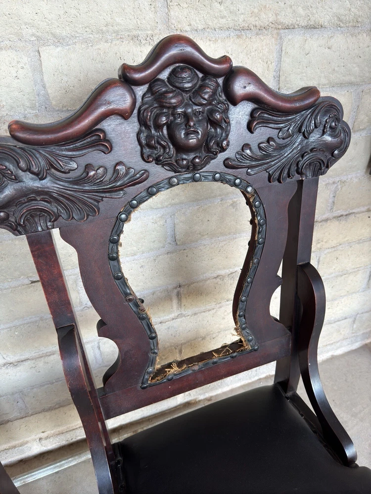 Antique pair of Renaissance Revival chairs Beautiful carved faces on chairs Black leather seats and backs One needs leather repair Smoke free home Construction is solid Original front wheels Nice design Great patina