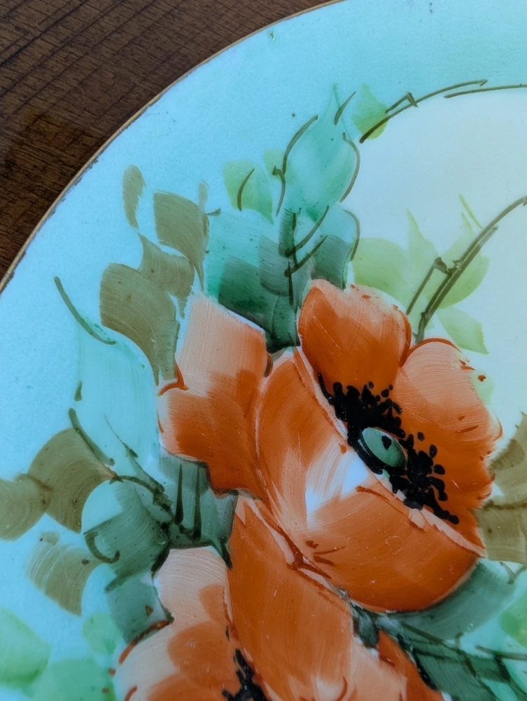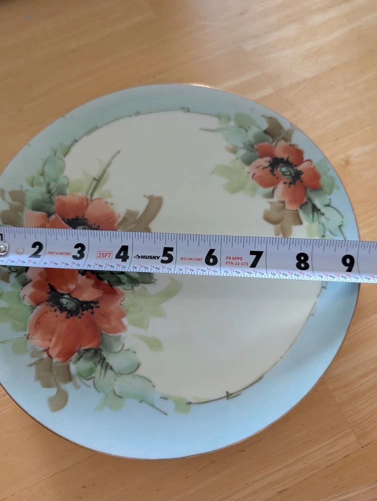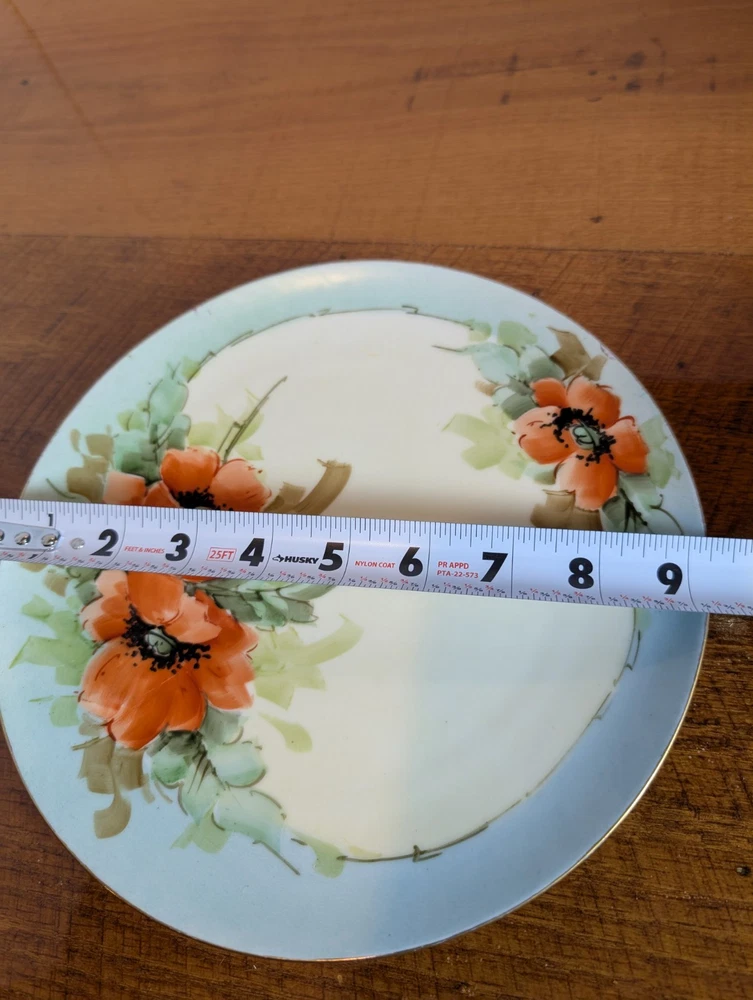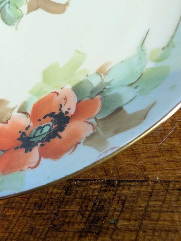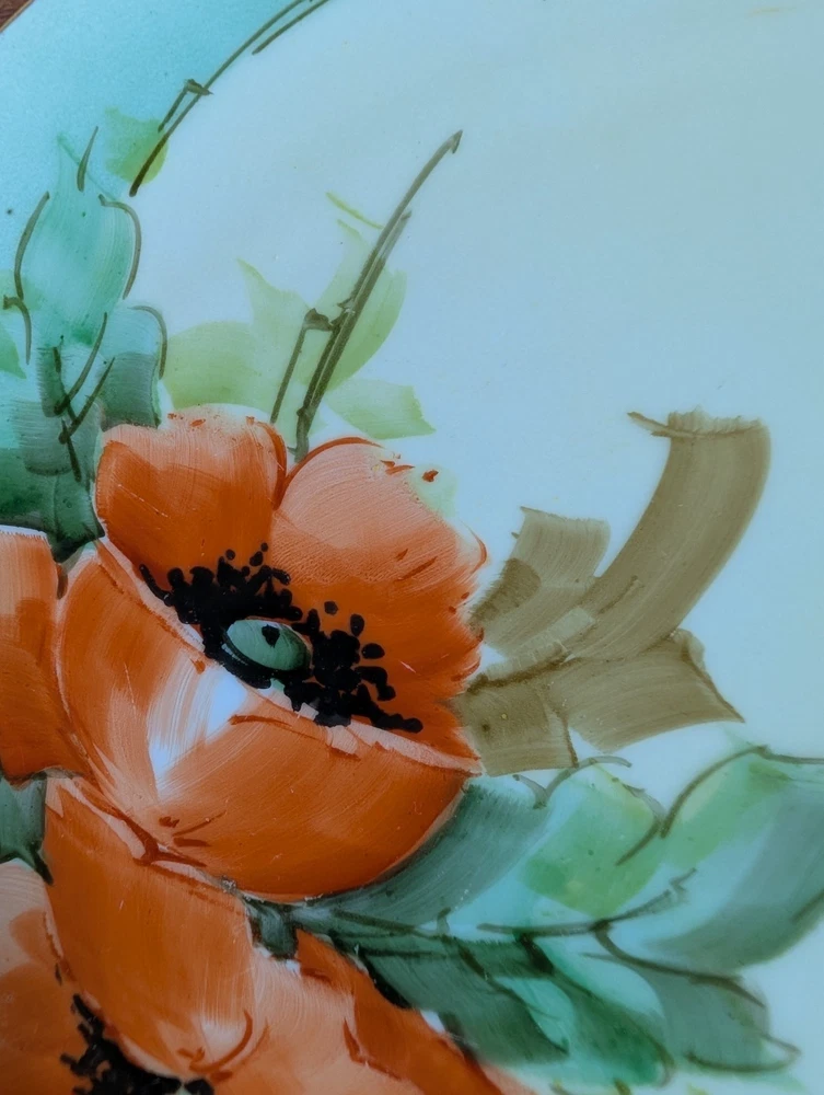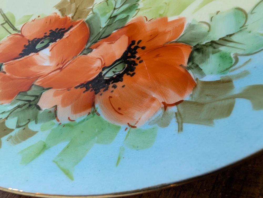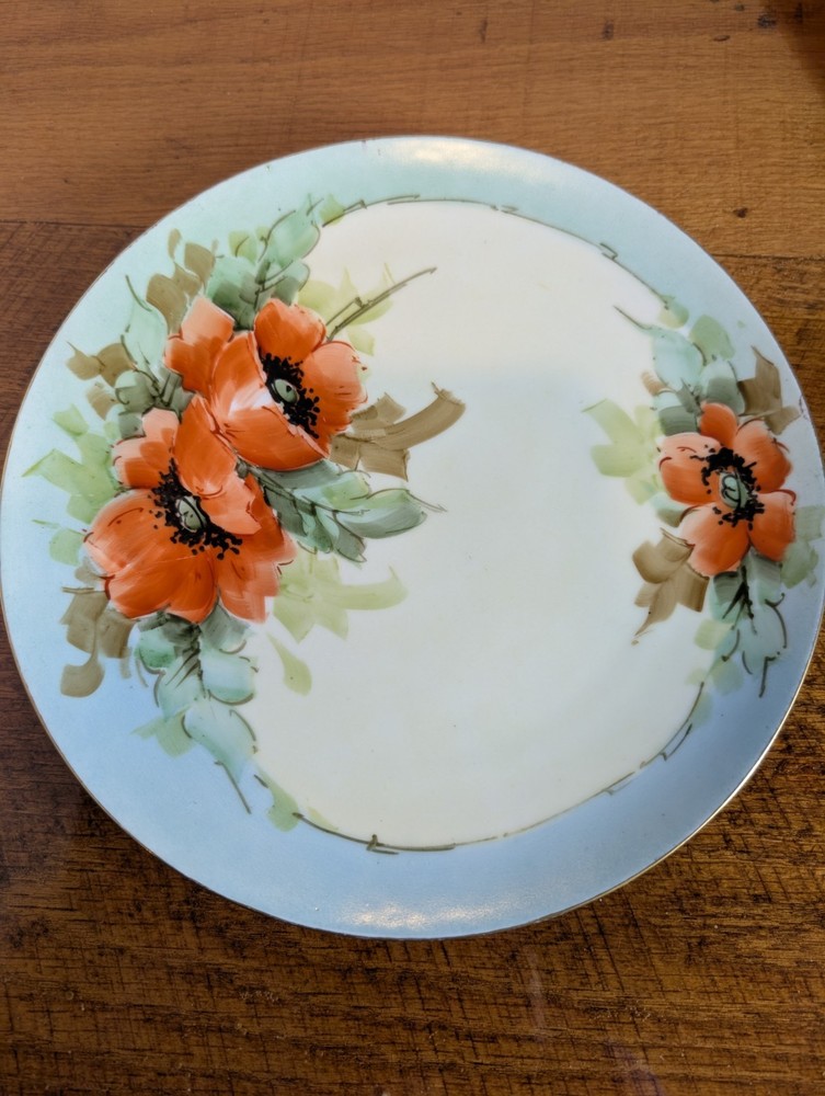 Beautiful Porcelain Plate with Vibrant Poppy's Soft green foilage with Soft Blue background Gold color trim Please refer to Photos for details There is one rough spot on the front of the plate (see photo) This piece maybe Limoges ? Marked Refer to Photo on measurement