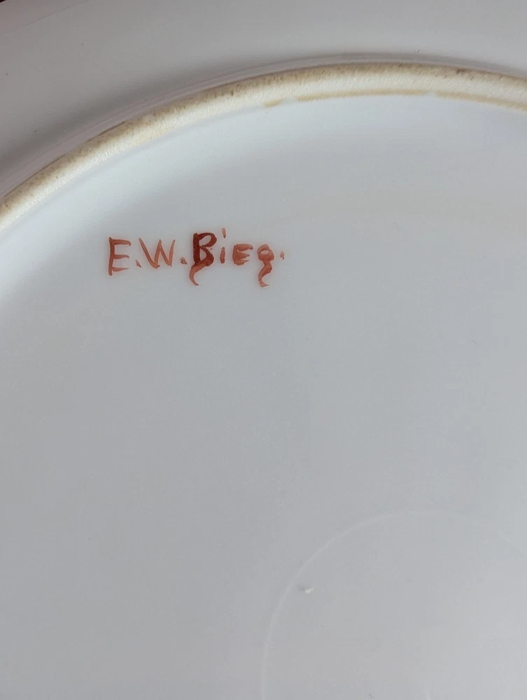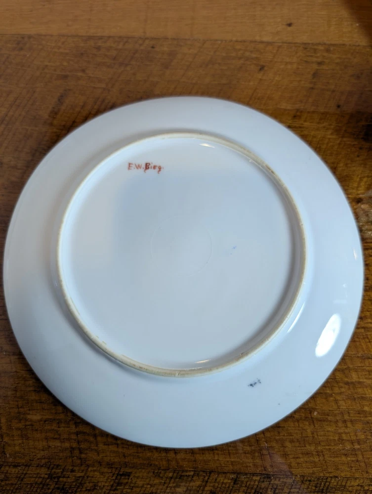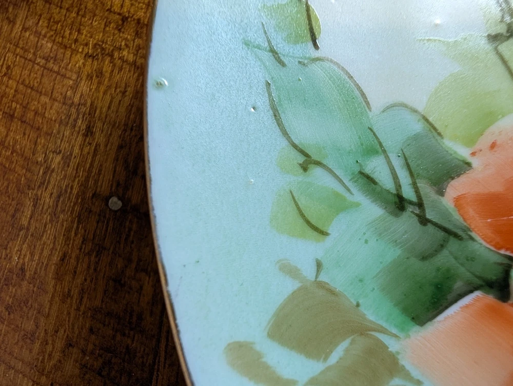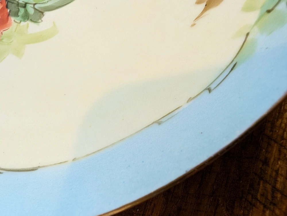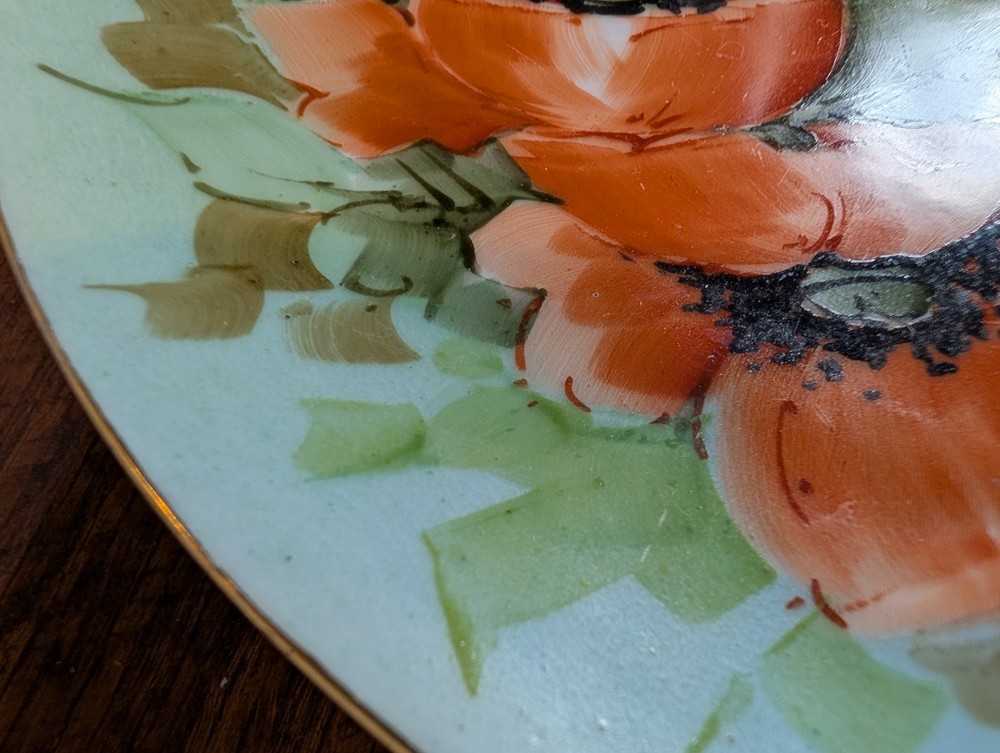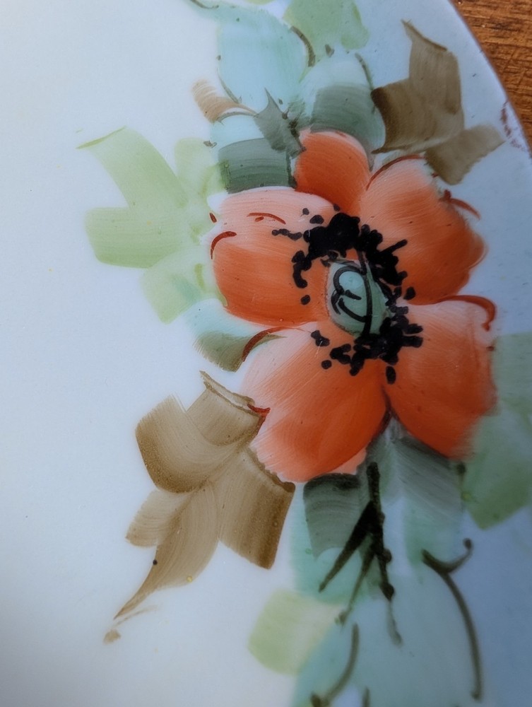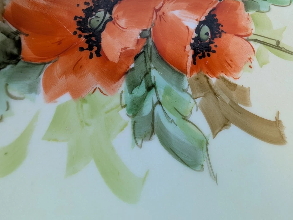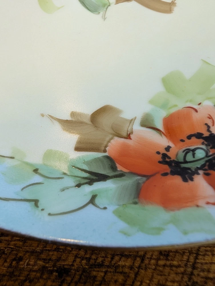 Beautiful Porcelain Plate with Vibrant Poppy's Soft green foilage with Soft Blue background Gold color trim Please refer to Photos for details There is one rough spot on the front of the plate (see photo) This piece maybe Limoges ? Marked Refer to Photo on measurement