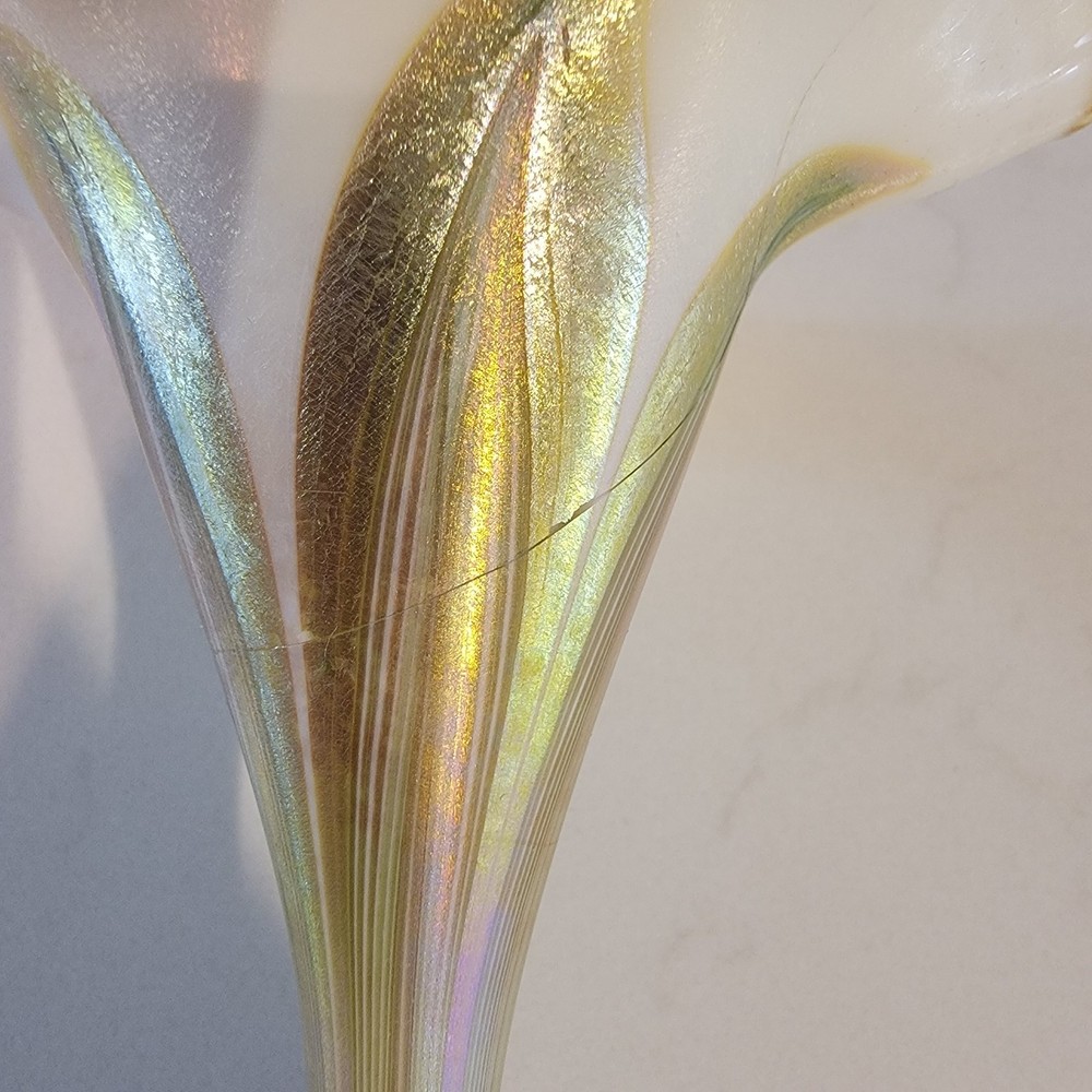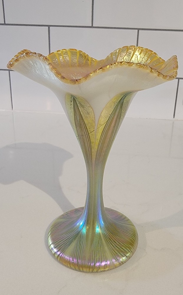 A beautiful authentic Art Nouveau iridescent glass vase by the famous Quezal Art Glass and Decorating Company. This piece features a graceful Floriform design, mimicking the elegant opening of a flower. Design & Artistry: ☆Style: Floriform (symmetrical flared rim). ☆Pattern: Classic green and gold "Pulled Feather" motif on an opal white body. ☆Luster: The wide, scalloped rim features a brilliant gold iridescent finish with striking pink and purple highlights. ☆Signature: Signed "Quezal" on the bottom (see photos). Condition: The vase displays beautifully with exceptional color. ☆☆☆NOTE: A very thin hairline is present on the stem. It remains a stunning display piece for any collector.☆☆☆