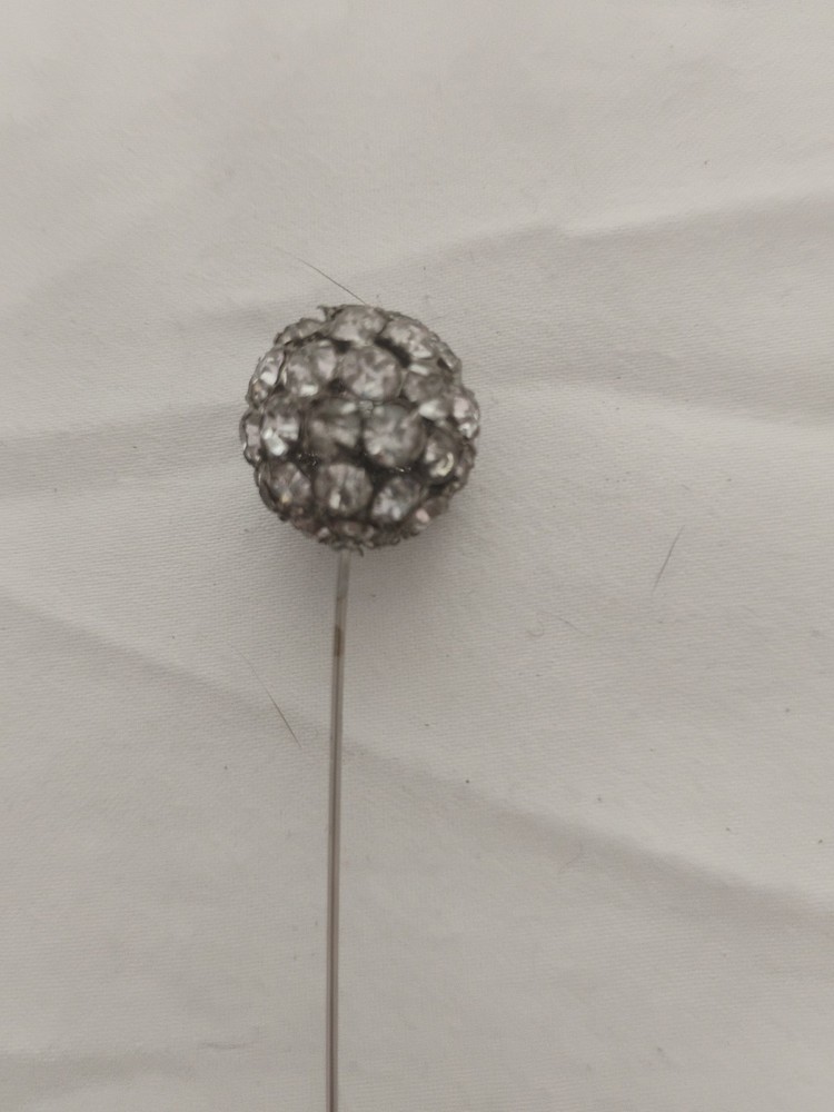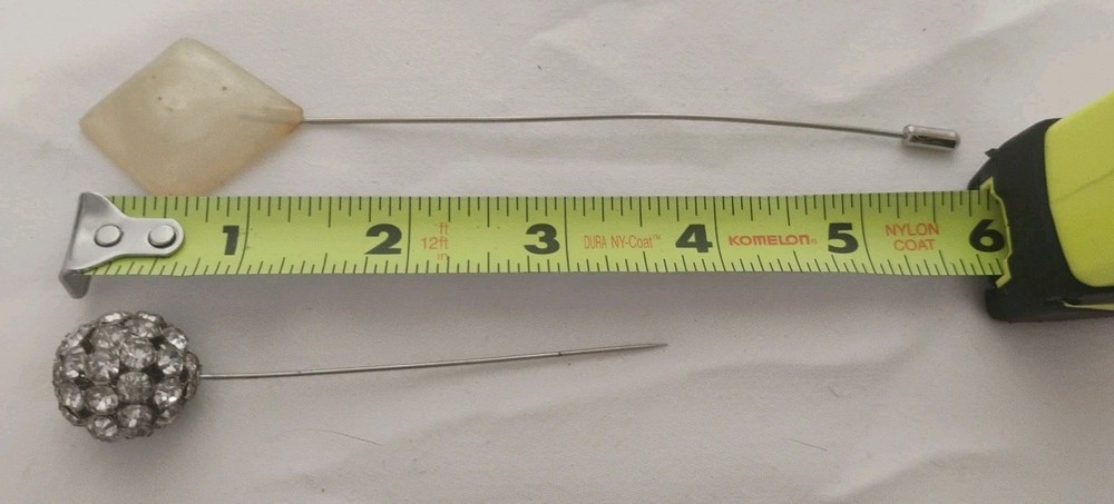 The product is a set of two antique hat stick pins featuring rhinestones and celluloid material. These elegant accessories would have been used to decorate hats, adding a touch of glamour and sophistication to any outfit. The intricate design and use of rhinestones give these pins a timeless and classic appeal, perfect for collectors or vintage enthusiasts looking to add a unique flair to their collection.