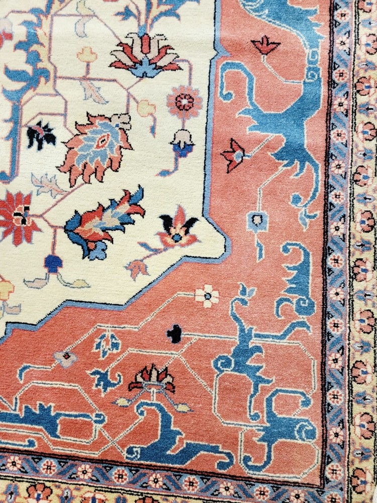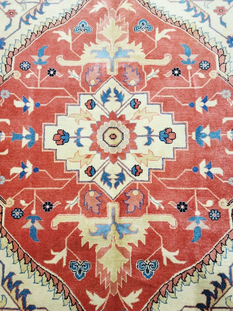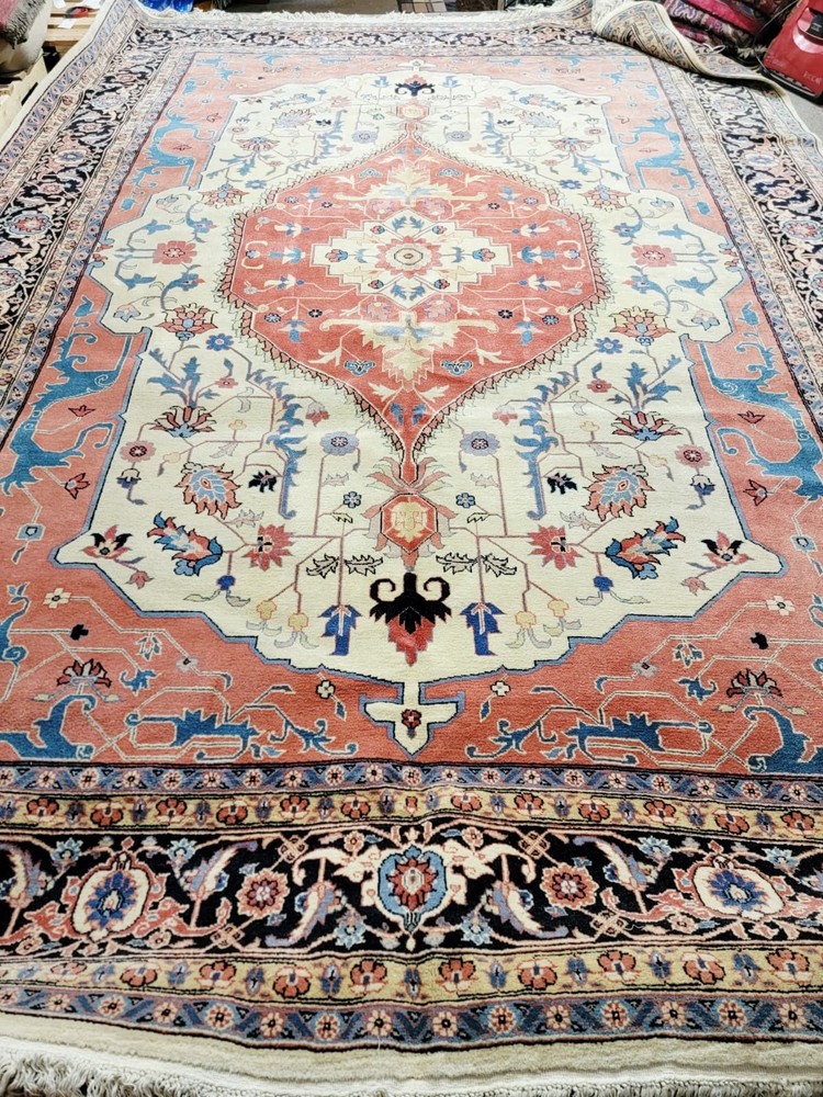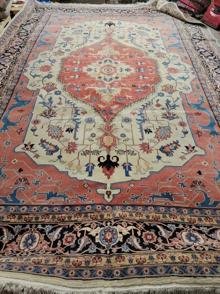 The product is a unique Antique Serapi Style Sultanabad Rug, hand-knotted with wool and measuring 10x14 feet. This multicolor rug features a traditional medallion pattern, typical of Sarabi-Serapi designs. Handmade and originating from the Asian culture, this antique rug is a timeless piece that can add a touch of elegance to any room. Its hand-knotted weave and high-quality material make it a durable and stylish addition to any home décor.