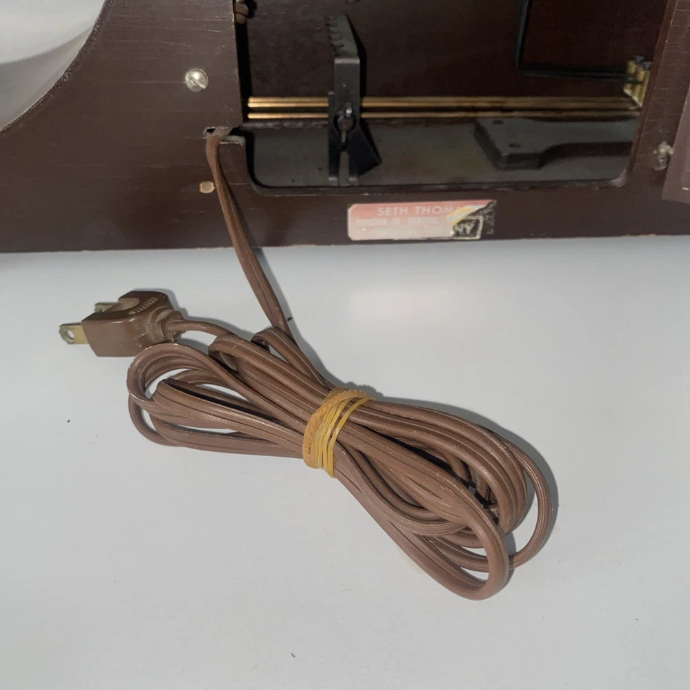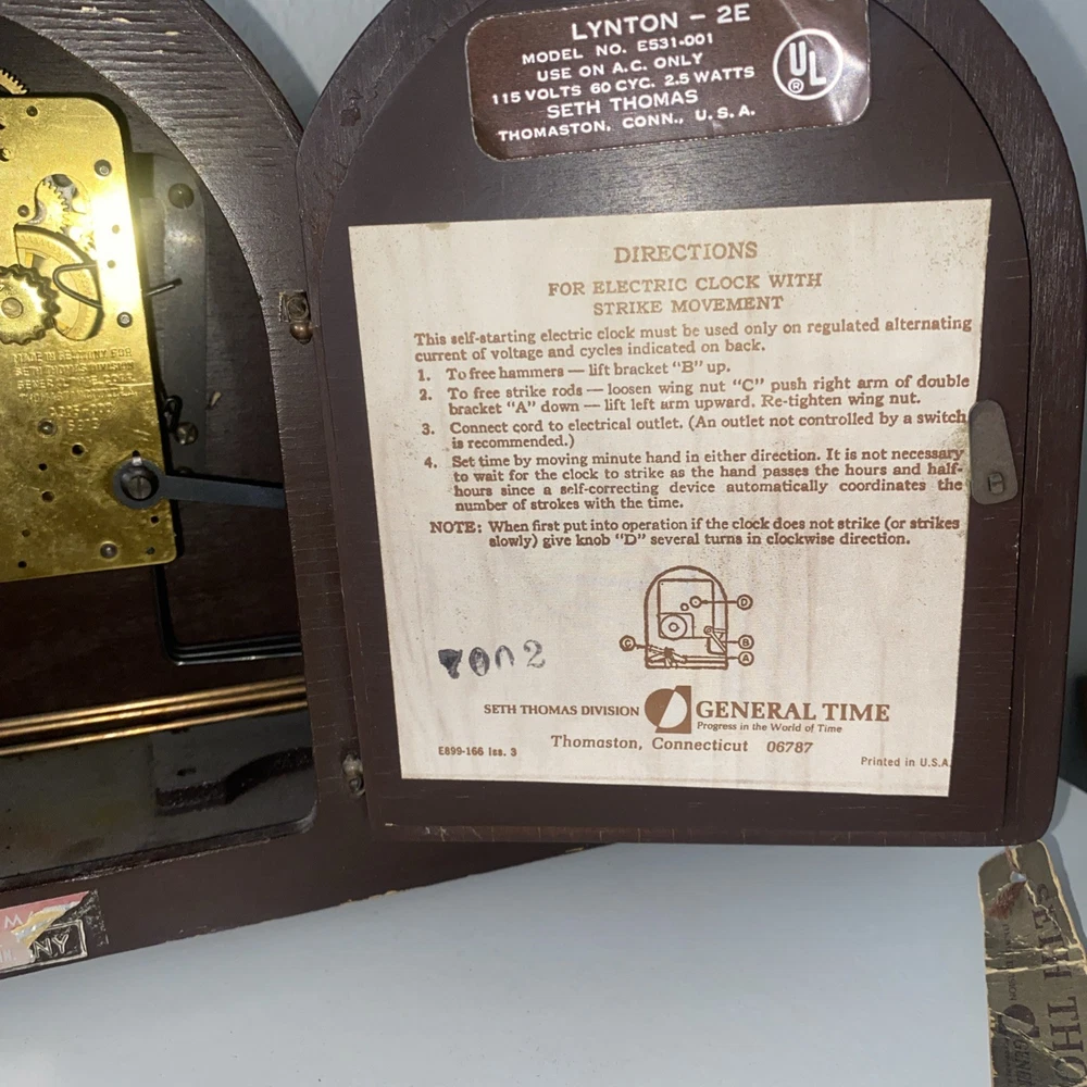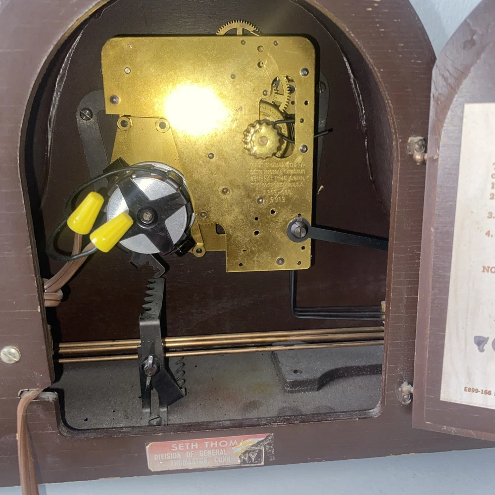 Time Period Manufactured:1920-1949Style:TraditionalFrame Material:WoodCountry of Origin:United StatesColor:BrownPower Source:ElectricalDisplay Type:AnalogEra:Early 20th Century (1911-1940)Model:Lynton Tambour E511-000Movement:MechanicalType:Mantle ClockBrand:Seth ThomasMaterial:wood,glass, metalFinish:MahoganyAntique:Yes