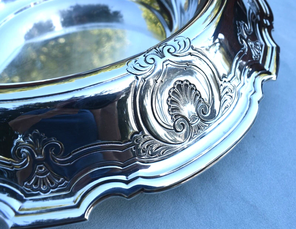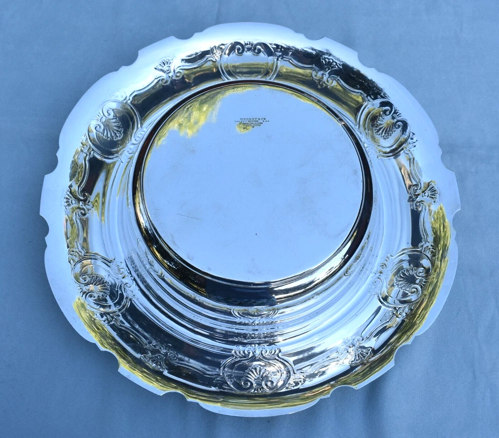 Stunning example and usability Tiffany and Co. John Moore era 14 1/2" x 3" tall sterling silver Chippendale shell overlap pattern centerpiece bowl! No monogram, 1398 grams, 2 tiny shallow wave dents to center. Last pic shows best picture I could capture. Only polished with Wright's Silver Cream, beautiful patina. Thanks for considering my Auctions today, I'll strive to exceed expectations on your Purchases. Please check my feedback of over 10280 positives, selling for over 27 years on ebay, before that the rest of my life :^). Hope you will check and bookmark my Auctions for new items listed daily!