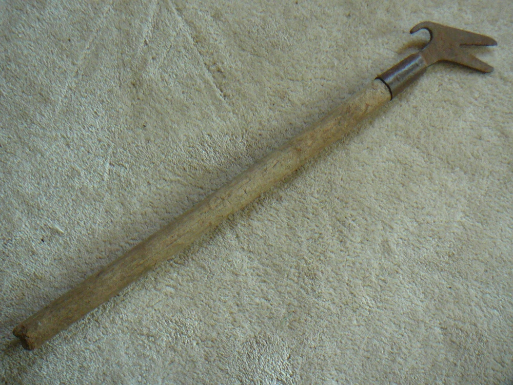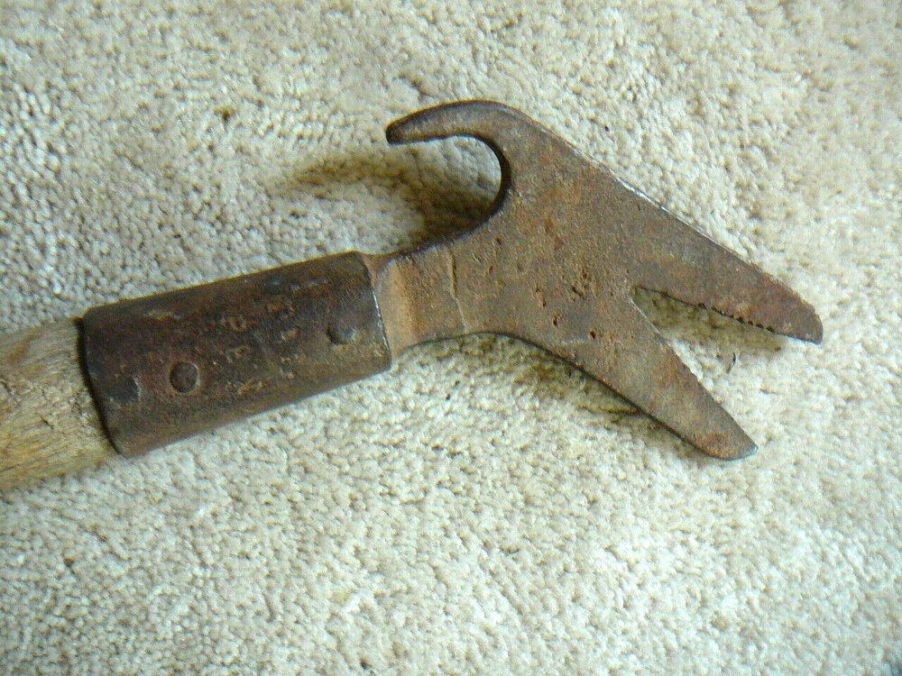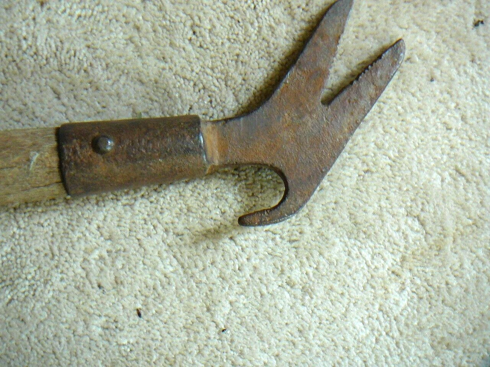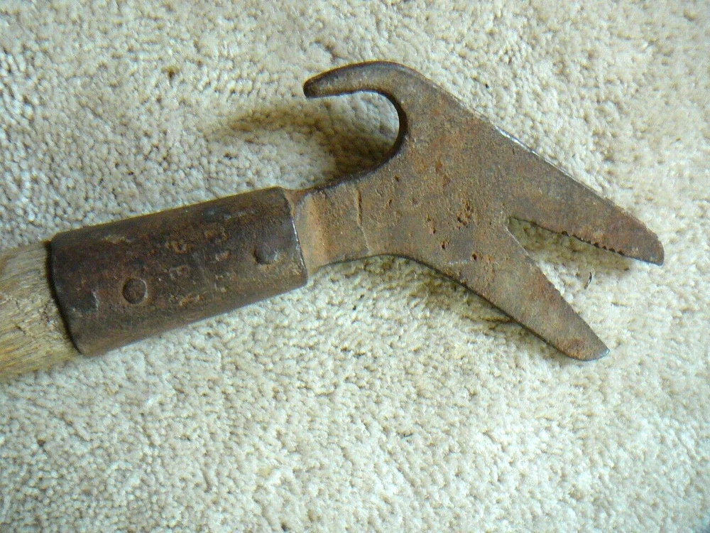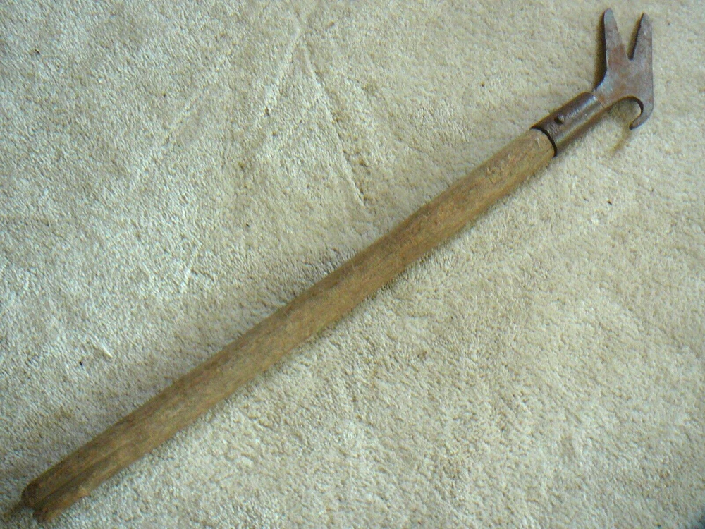 This is a vintage or antique telephone lineman's tool. This is a wood handled pole tool, with pull hook, and alligator Vee push sides. Looks like the alligator wrench would also work on cross brace nuts. Tool is 27" in length but handle has been broken. Looks like there are some markings on head but I am not able to decipher them. Head is cast iron or steel.